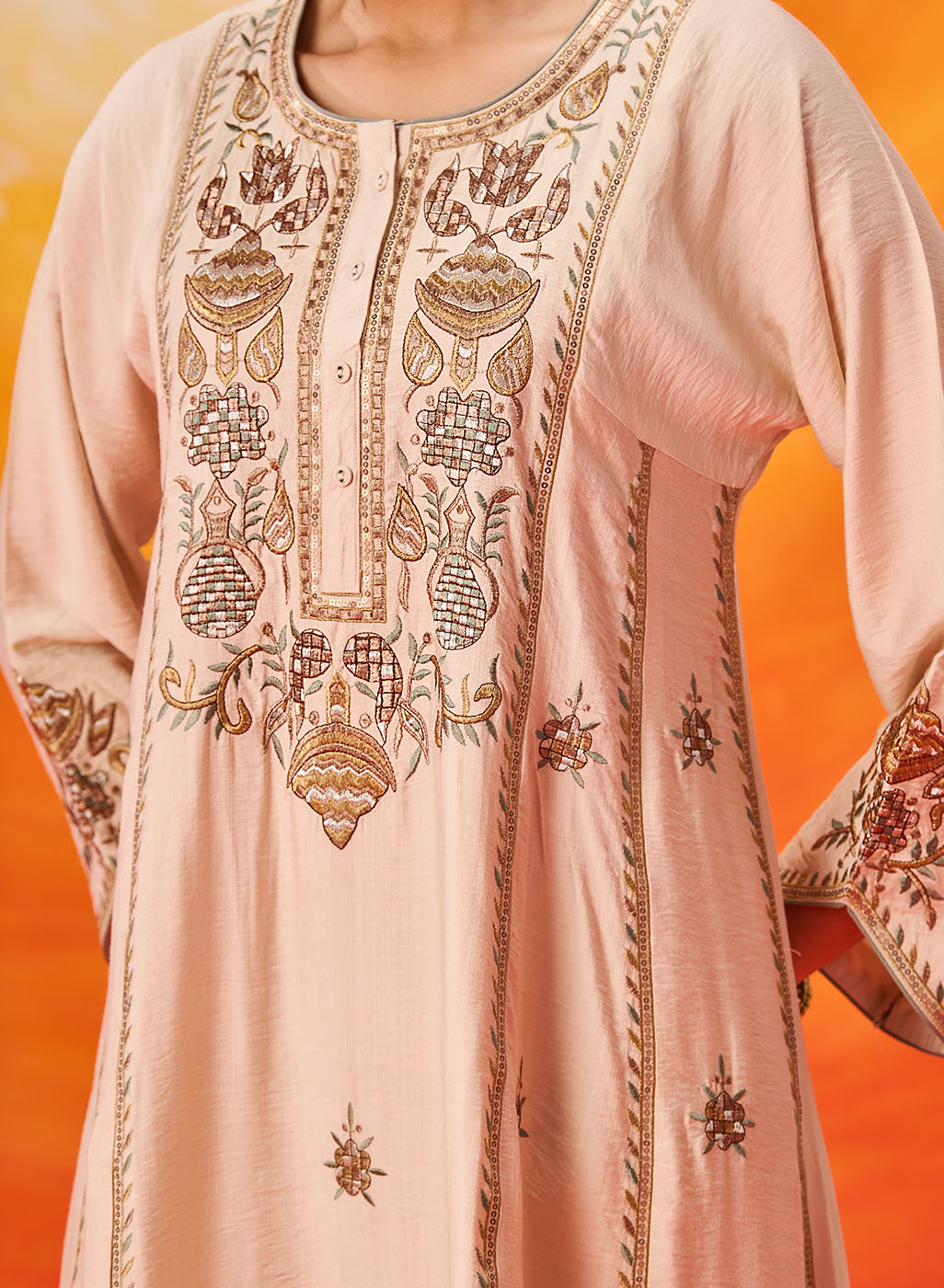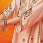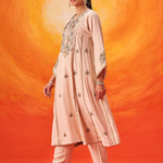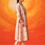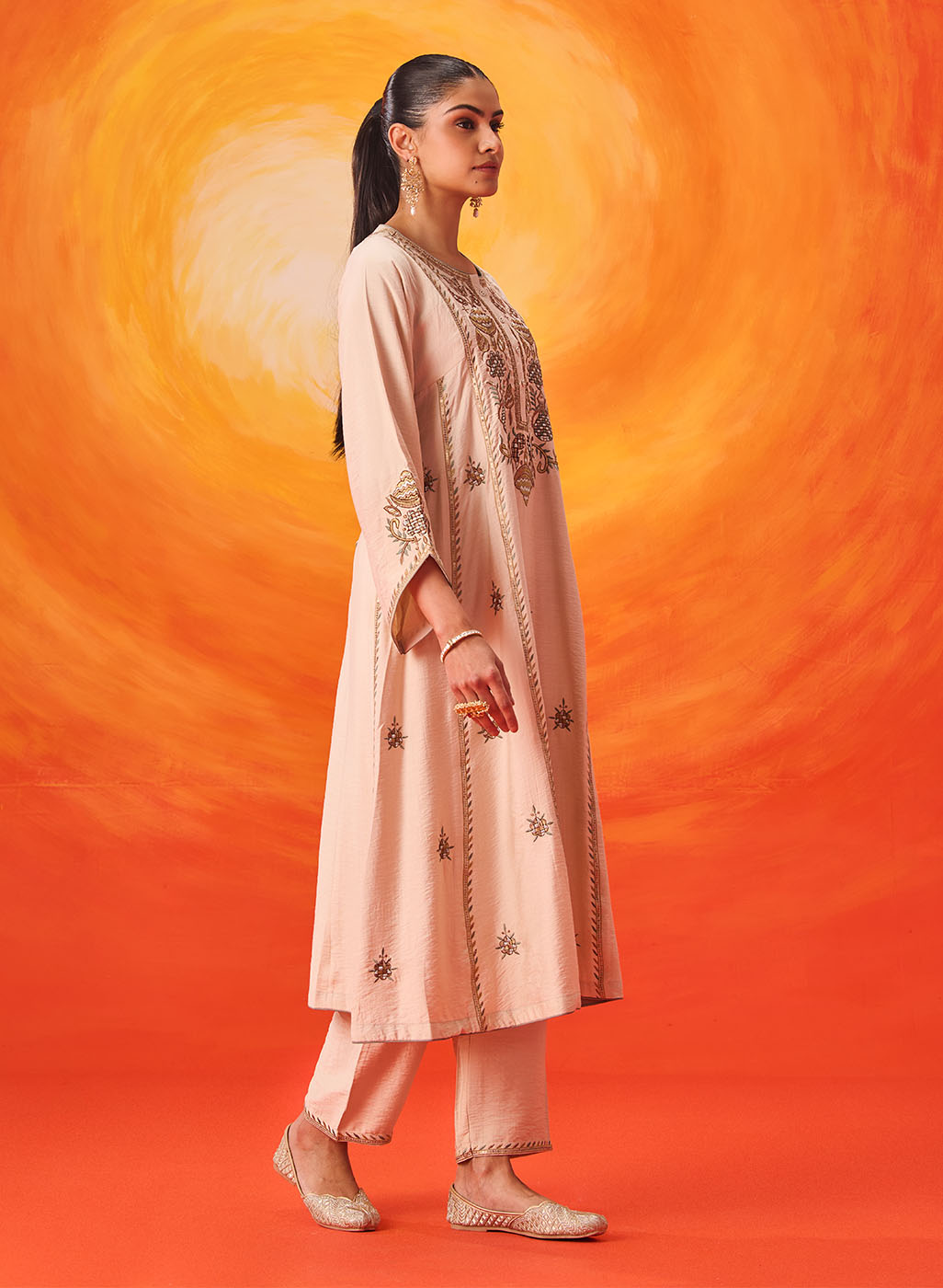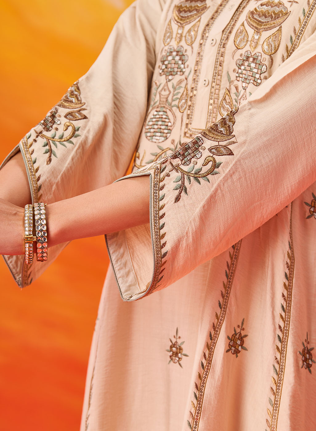 This ivory suit set is crafted for moments that call for understated grandeur. The A-line kurta, accented with princess seams, flows softly. Inspired by Indian florals, the embroidery and the silhouette are feminine and delicate. The contrast piping with Banarasi accents refines the look and makes it fit for royalty.