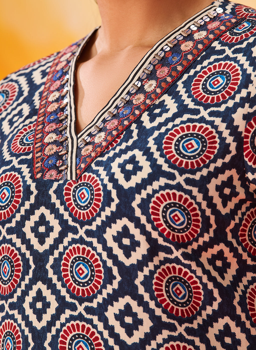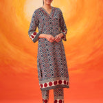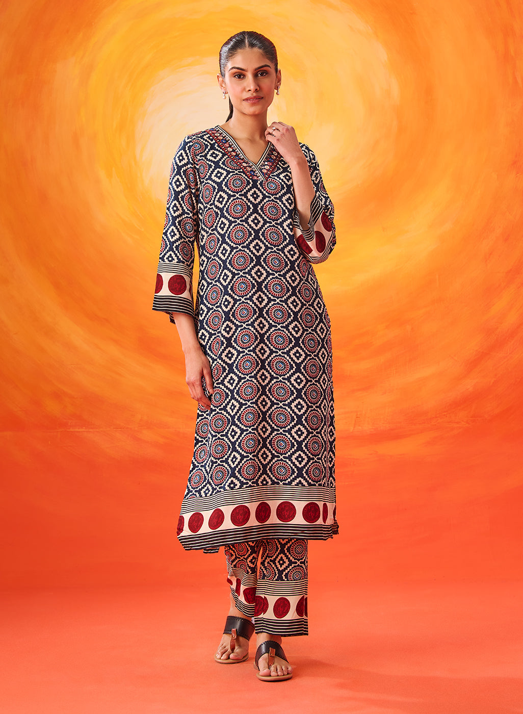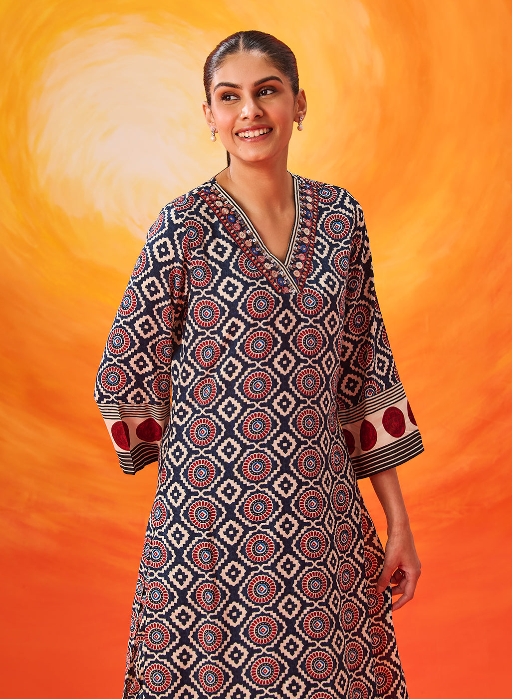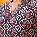 Simple, comfortable and effortless, this navy printed kurta set is designed for everyday dressing. The geometric print keeps the look interesting, while the minimal embroidery on the neckline adds just the right touch of detail without feeling heavy.