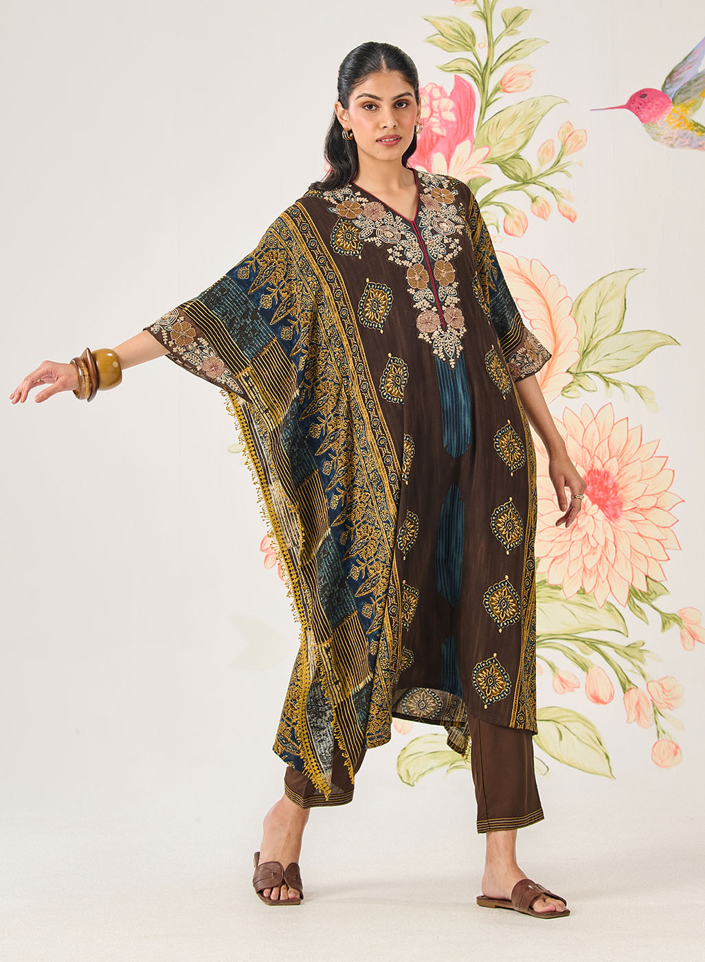 Brown Printed Viscose Shantoon Kaftan set