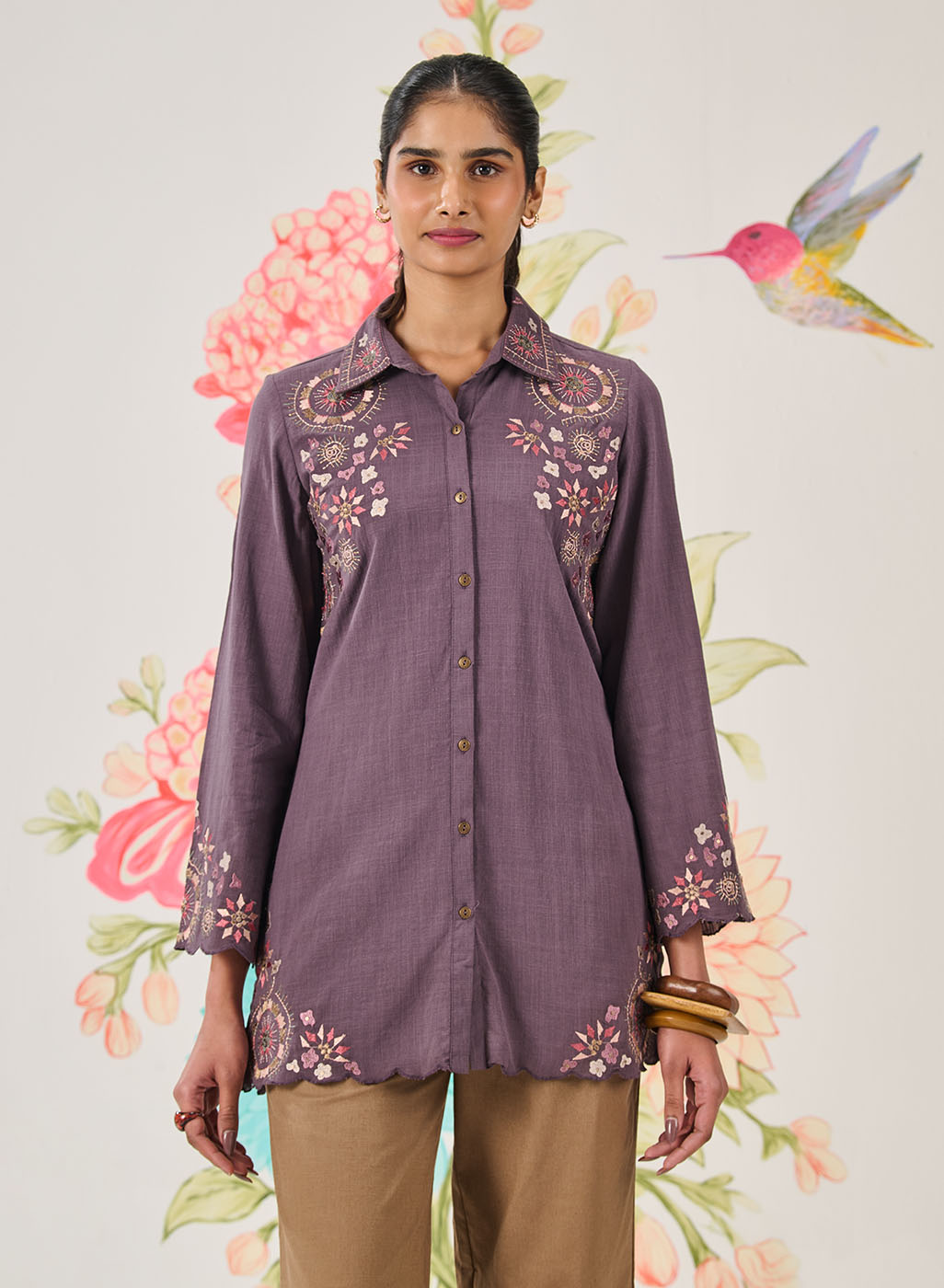 Lavender Embroidered Cotton Linen Shirt
