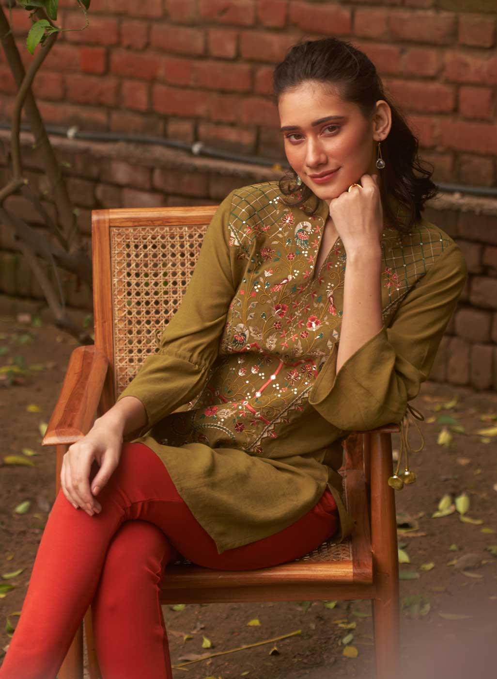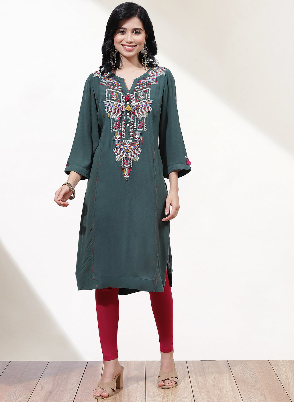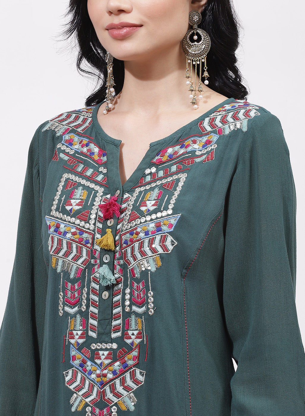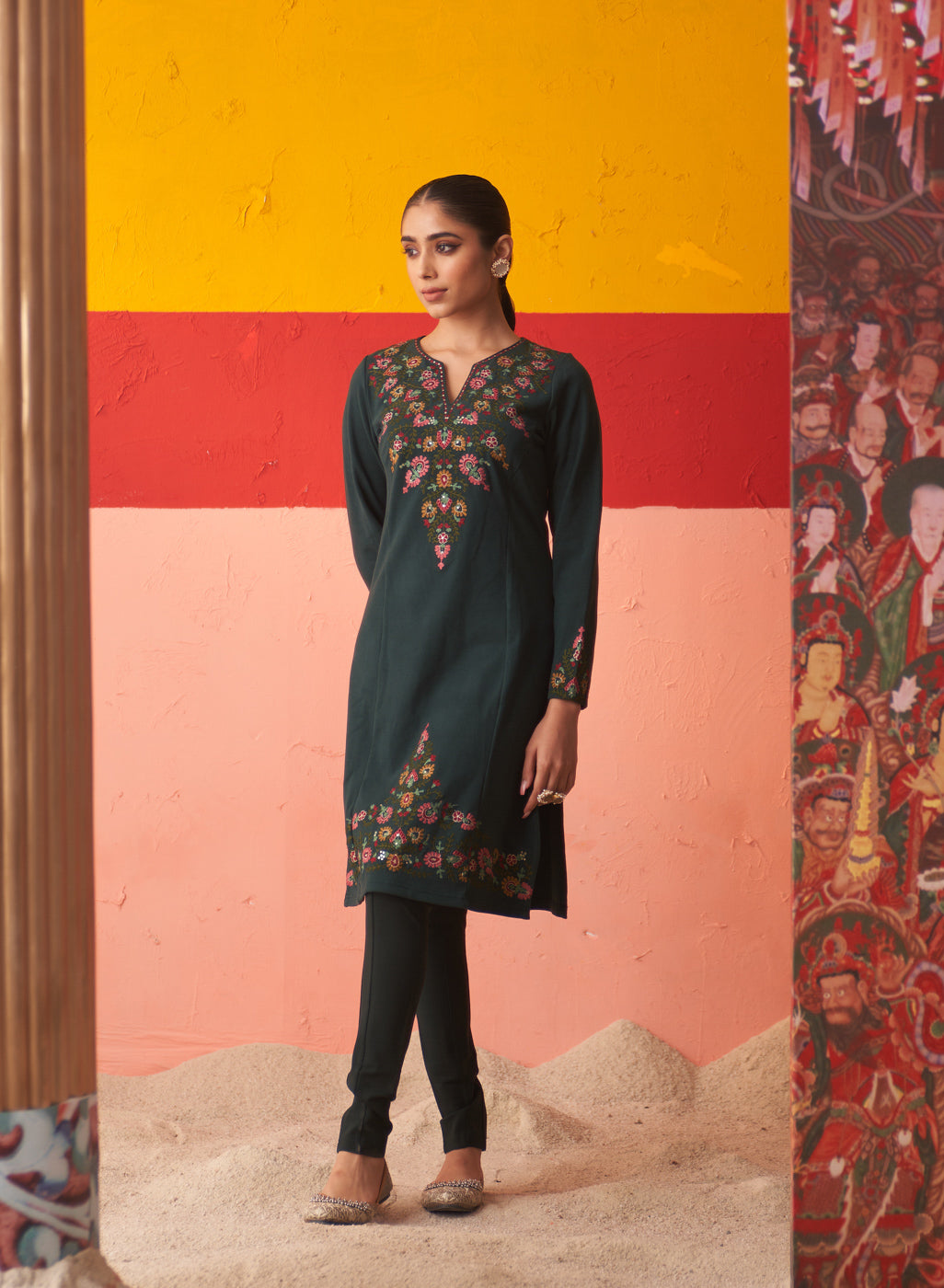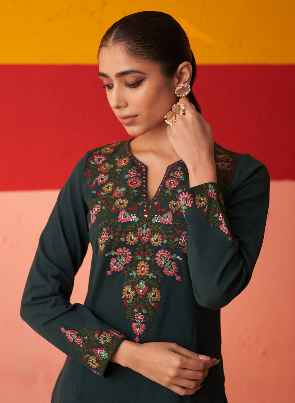 Seaweed Green Embroidered Woollen Kurti for Women with Mirror Work