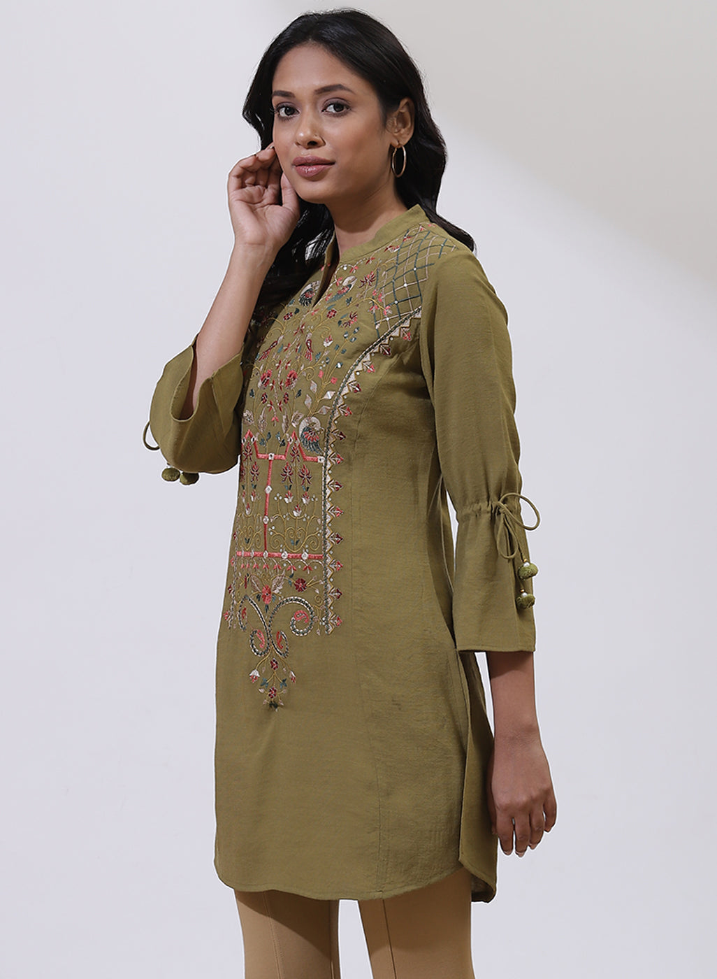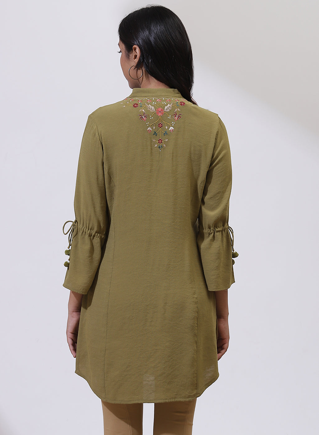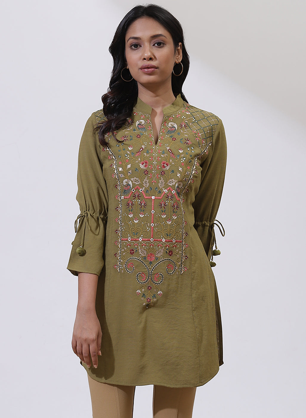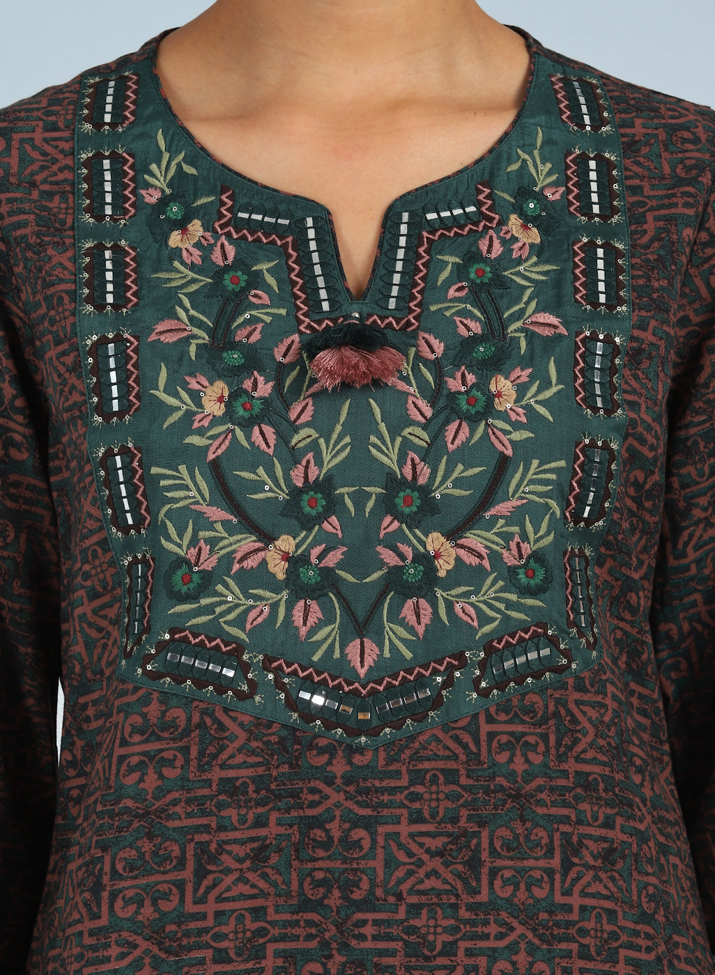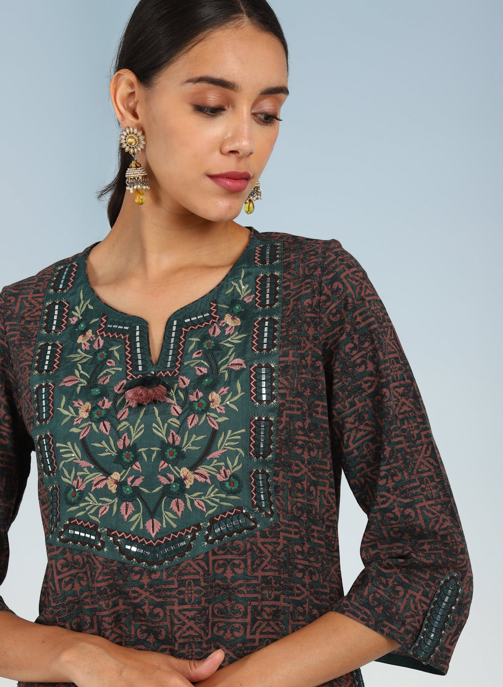 Seaweed Green Embroidered Woollen Kurti for Women with Mirror Work