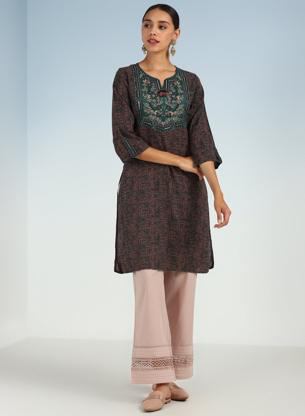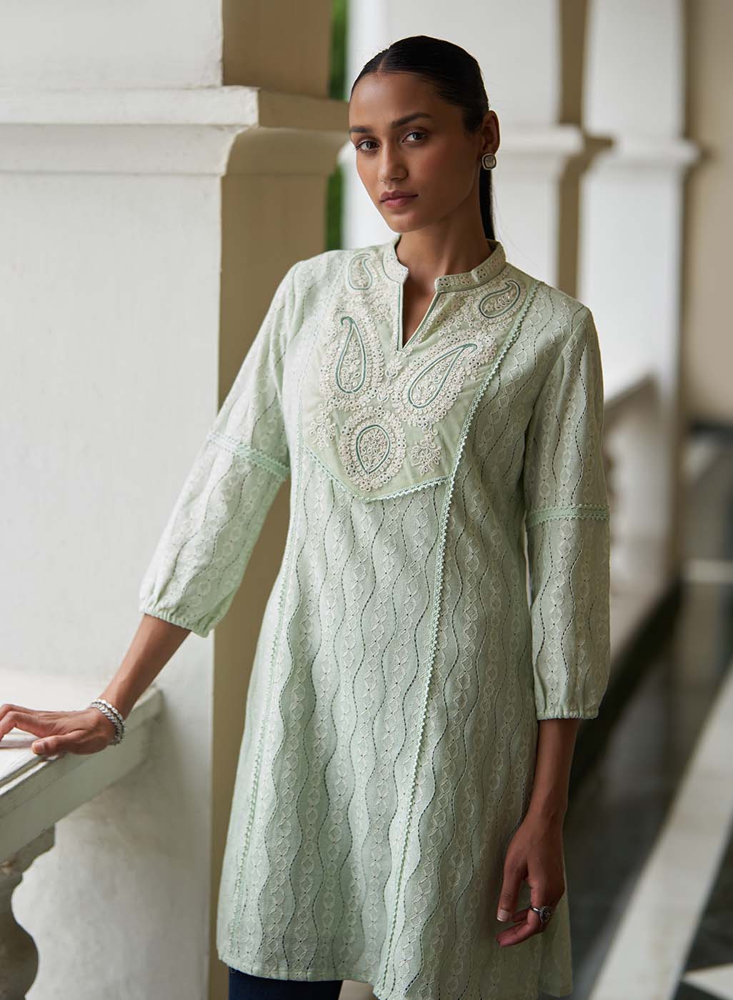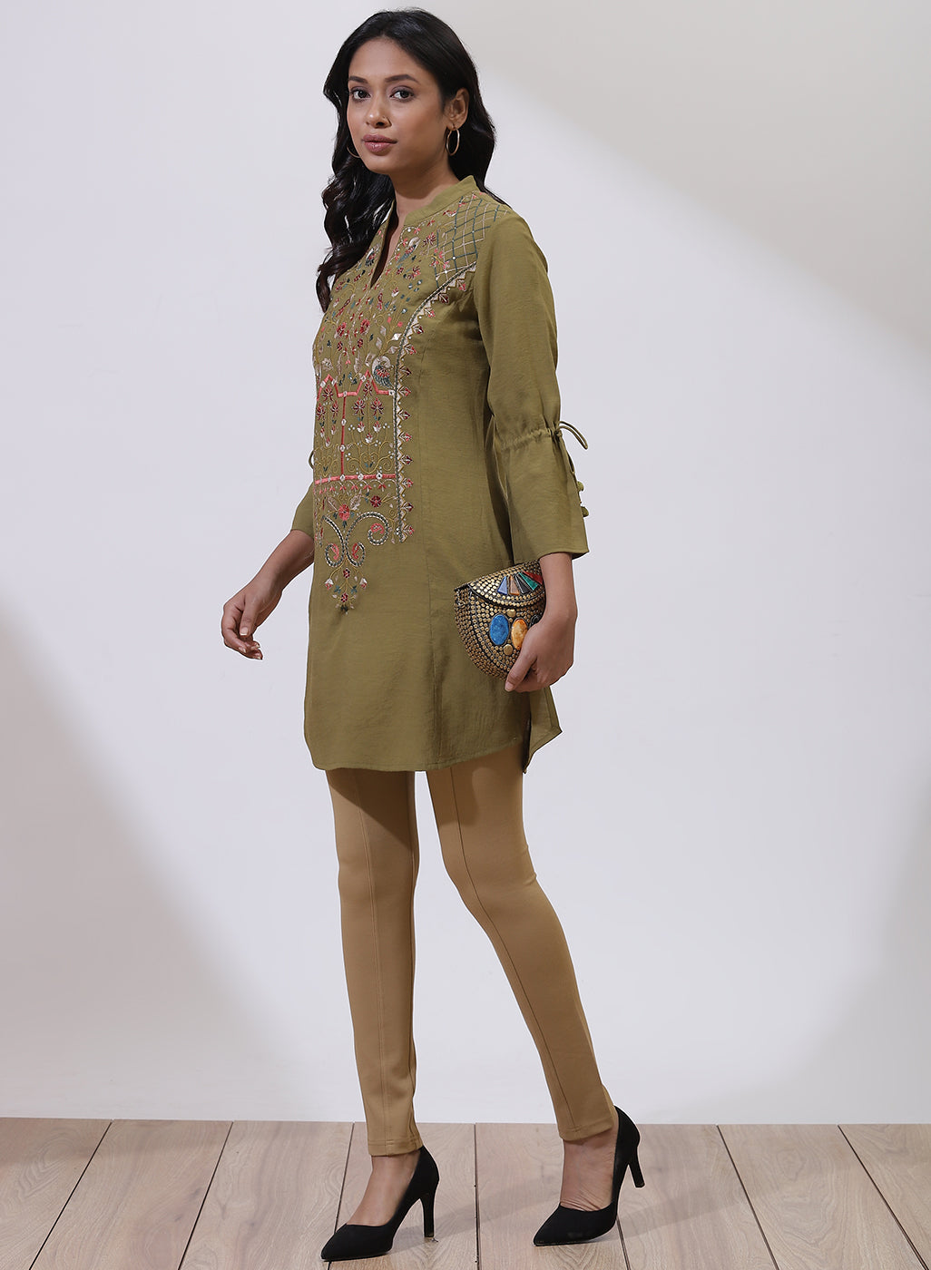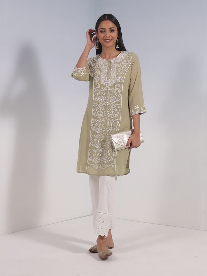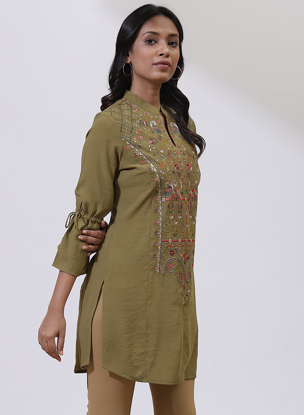 Seaweed Green Embroidered Woollen Kurti for Women with Mirror Work