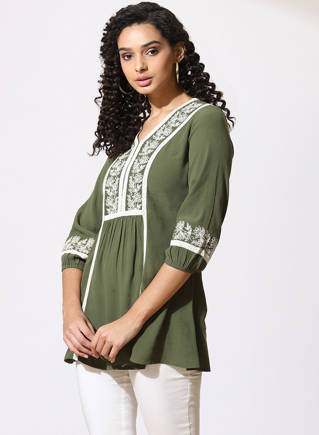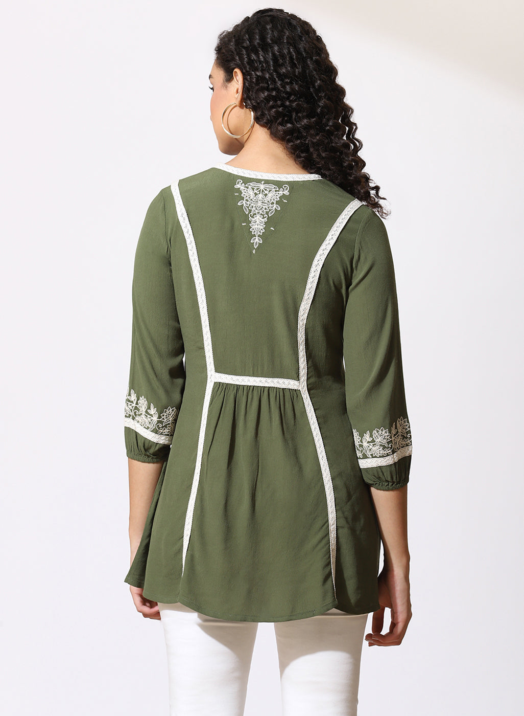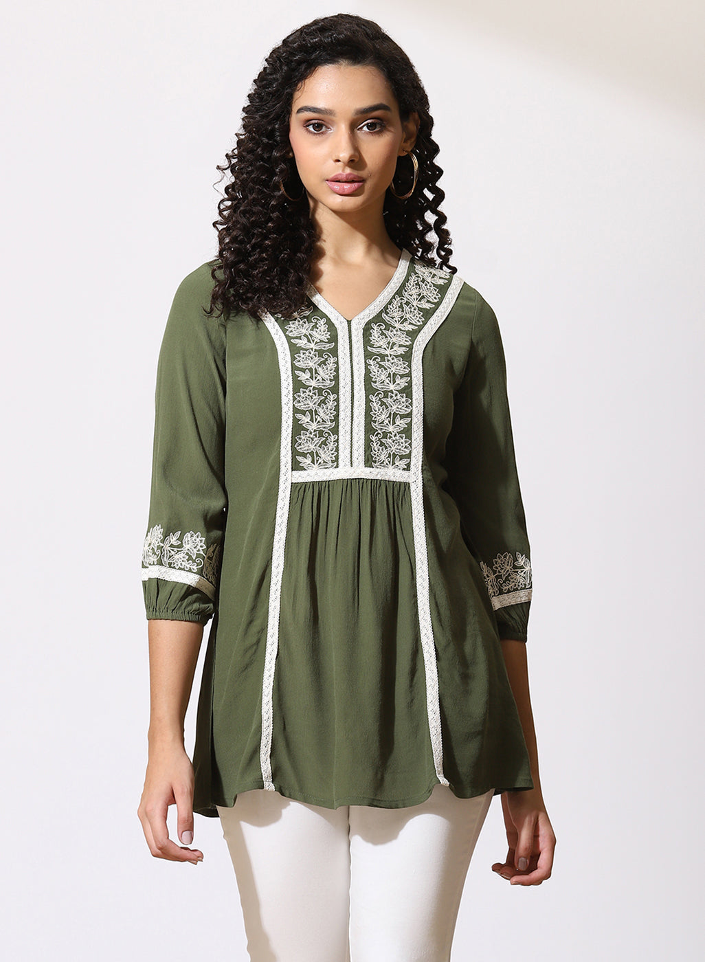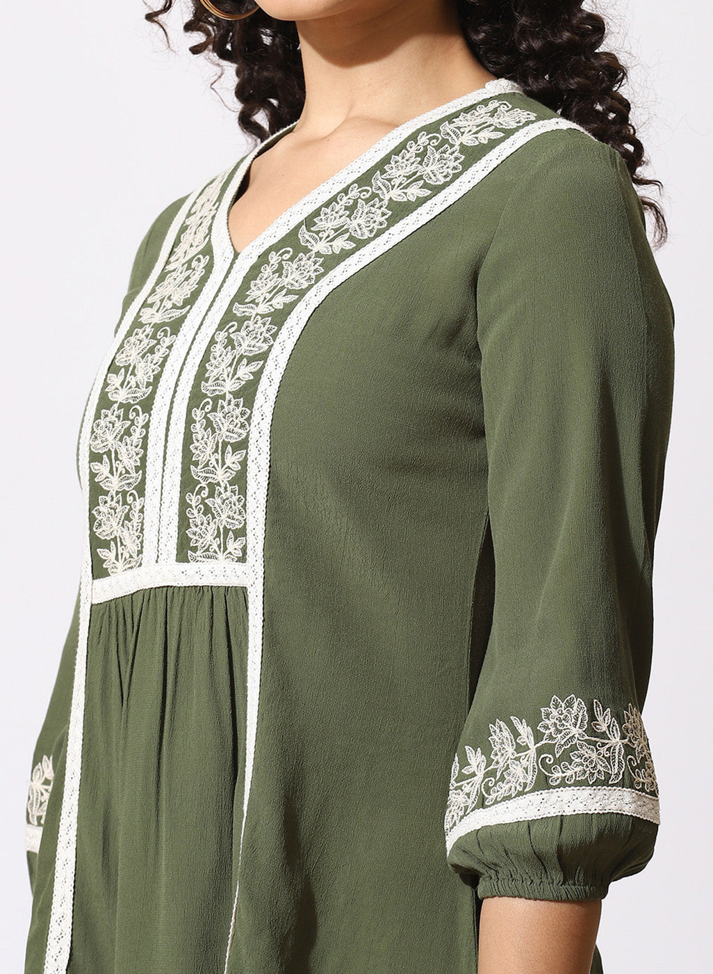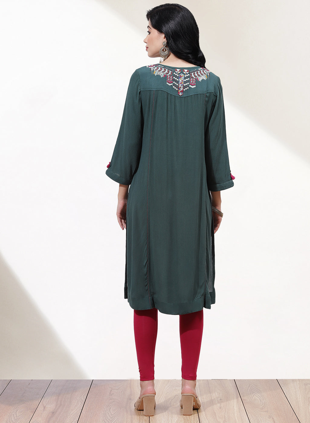 Dark Green Stretchable Kurti for Women with Threadwork and Lace Work