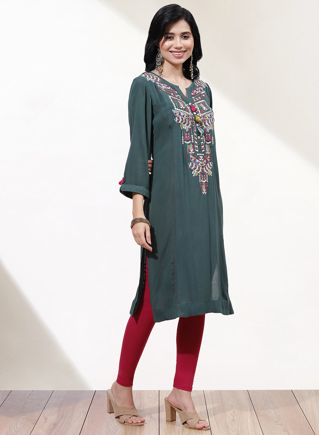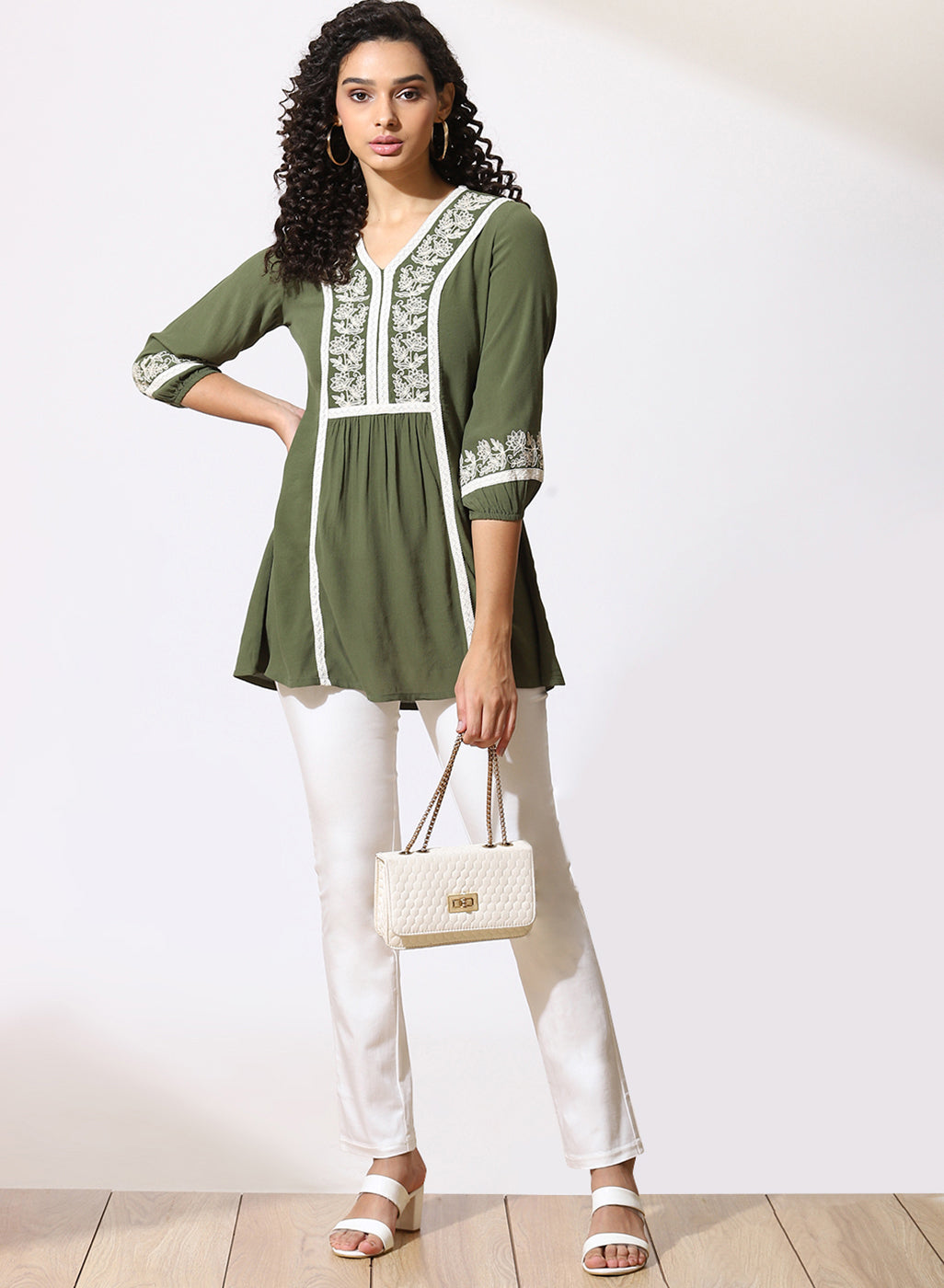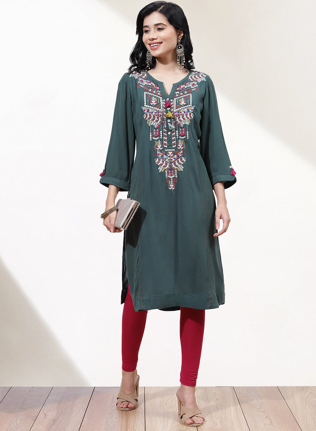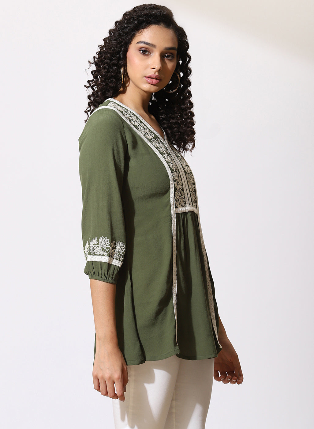 Dark Green Stretchable Kurti for Women with Threadwork and Lace Work
