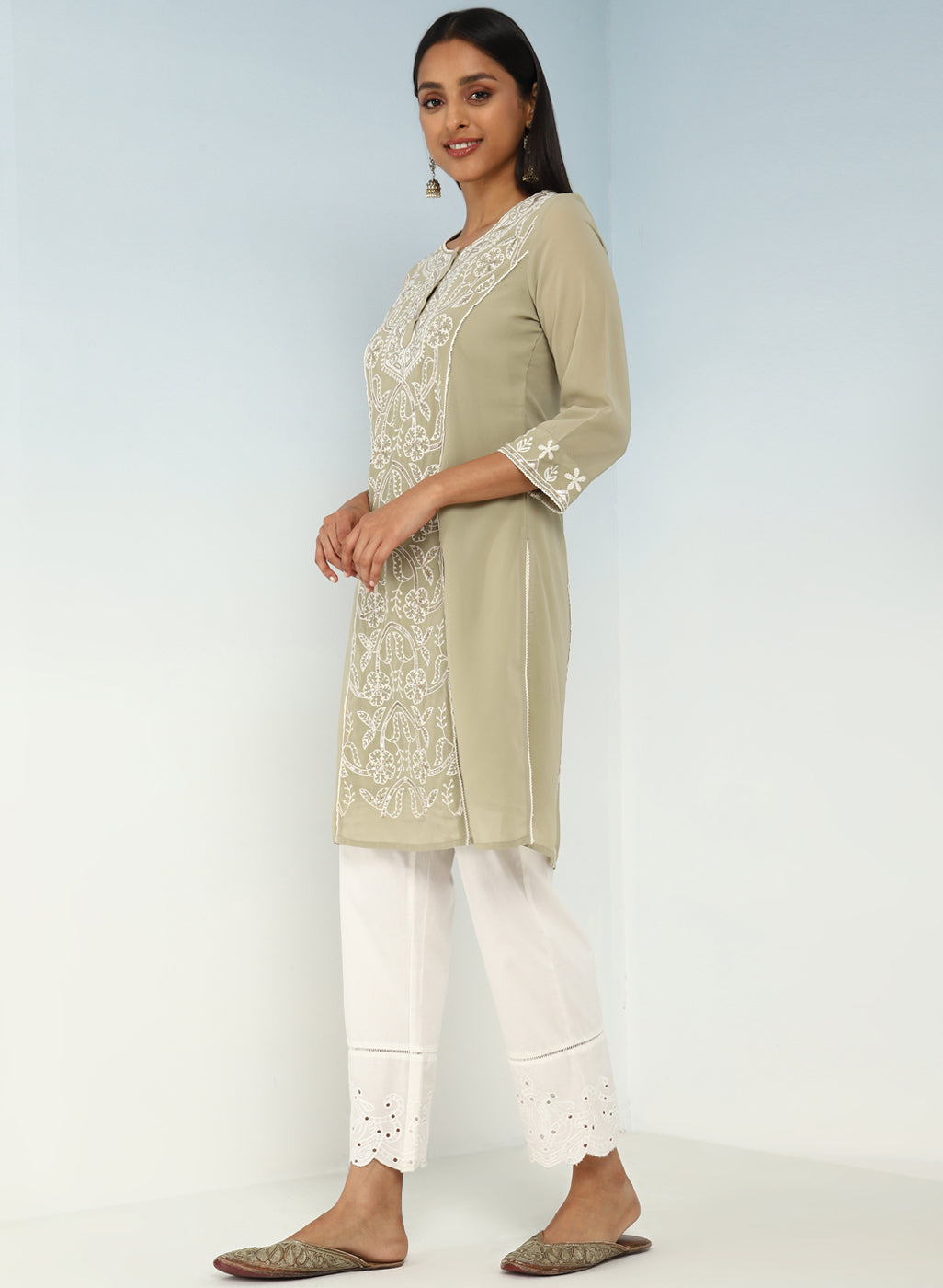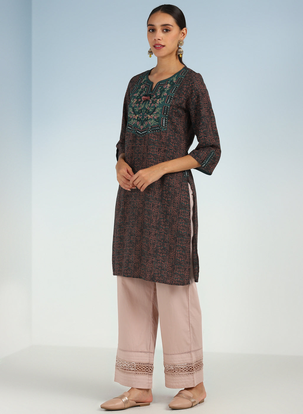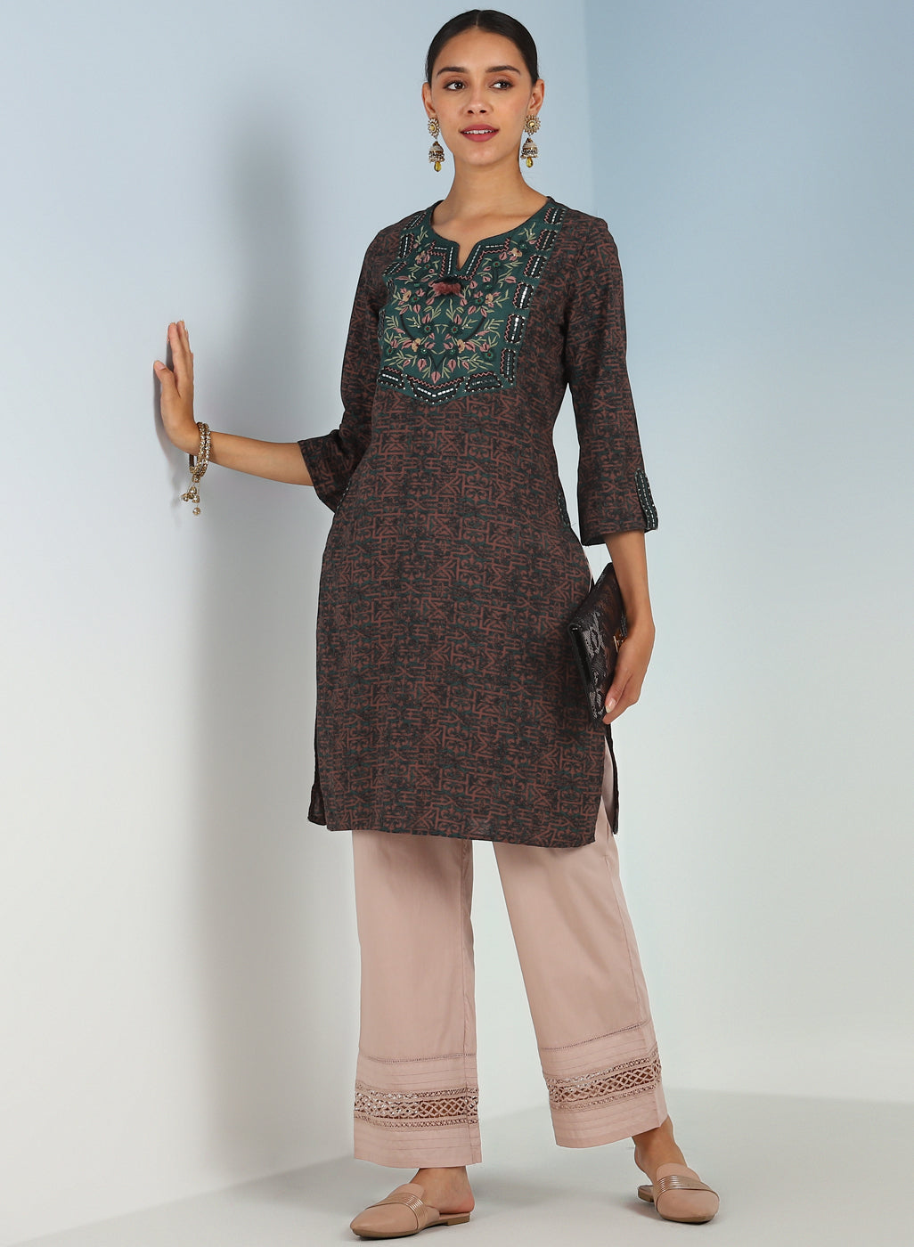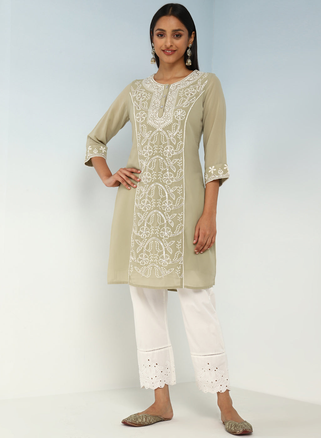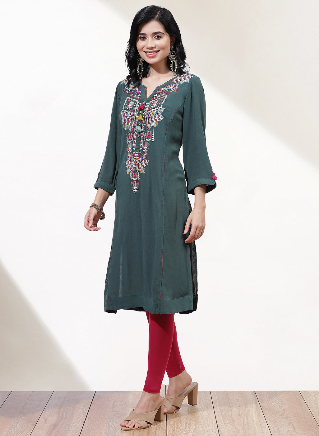 Dark Green Stretchable Kurti for Women with Threadwork and Lace Work