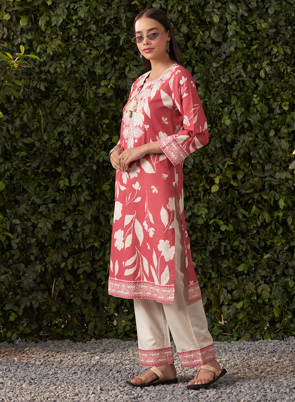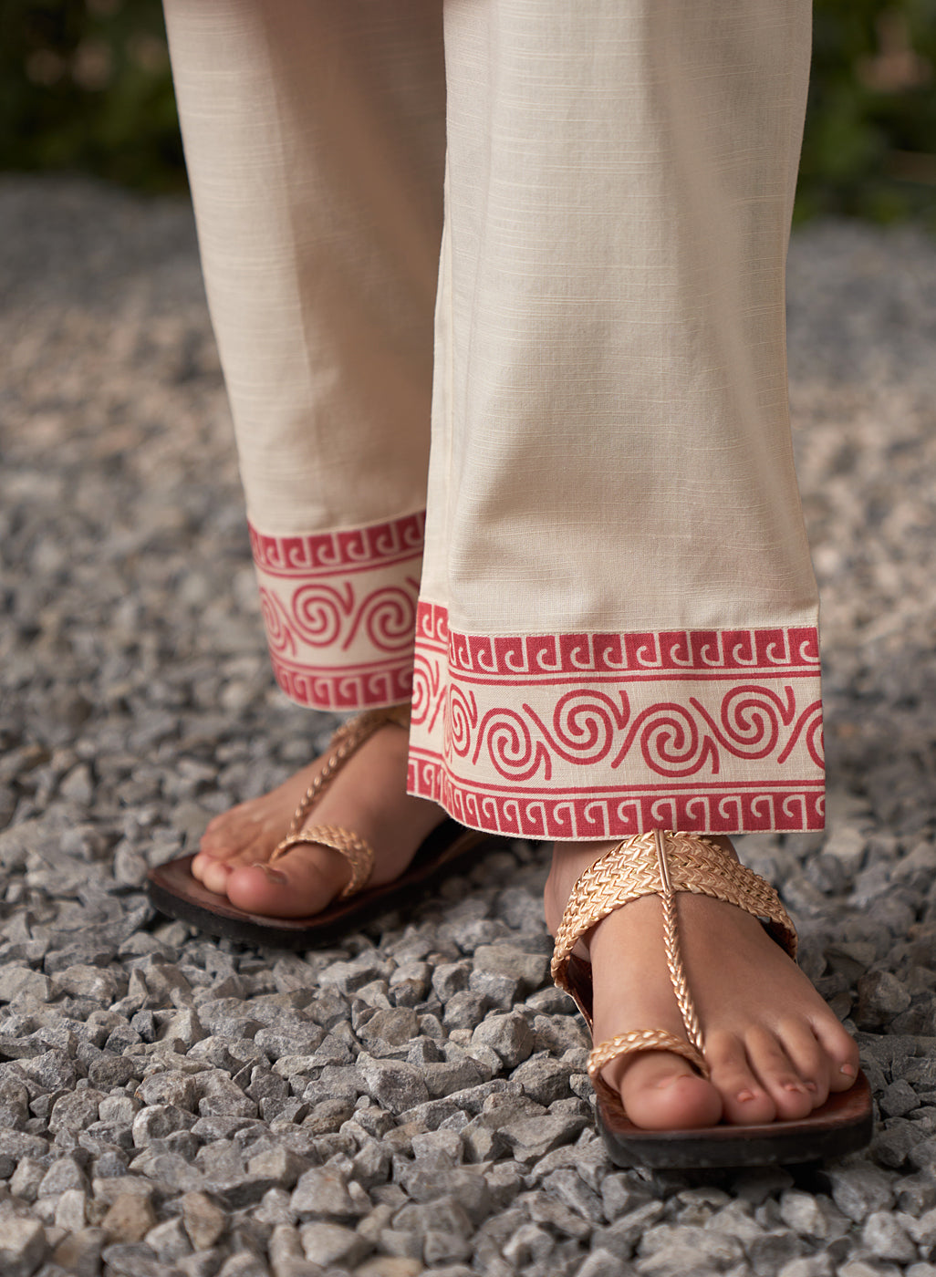 •The cream straight pants complement the kurta, finished with a matching printed border on the hem for a cohesive, polished look.