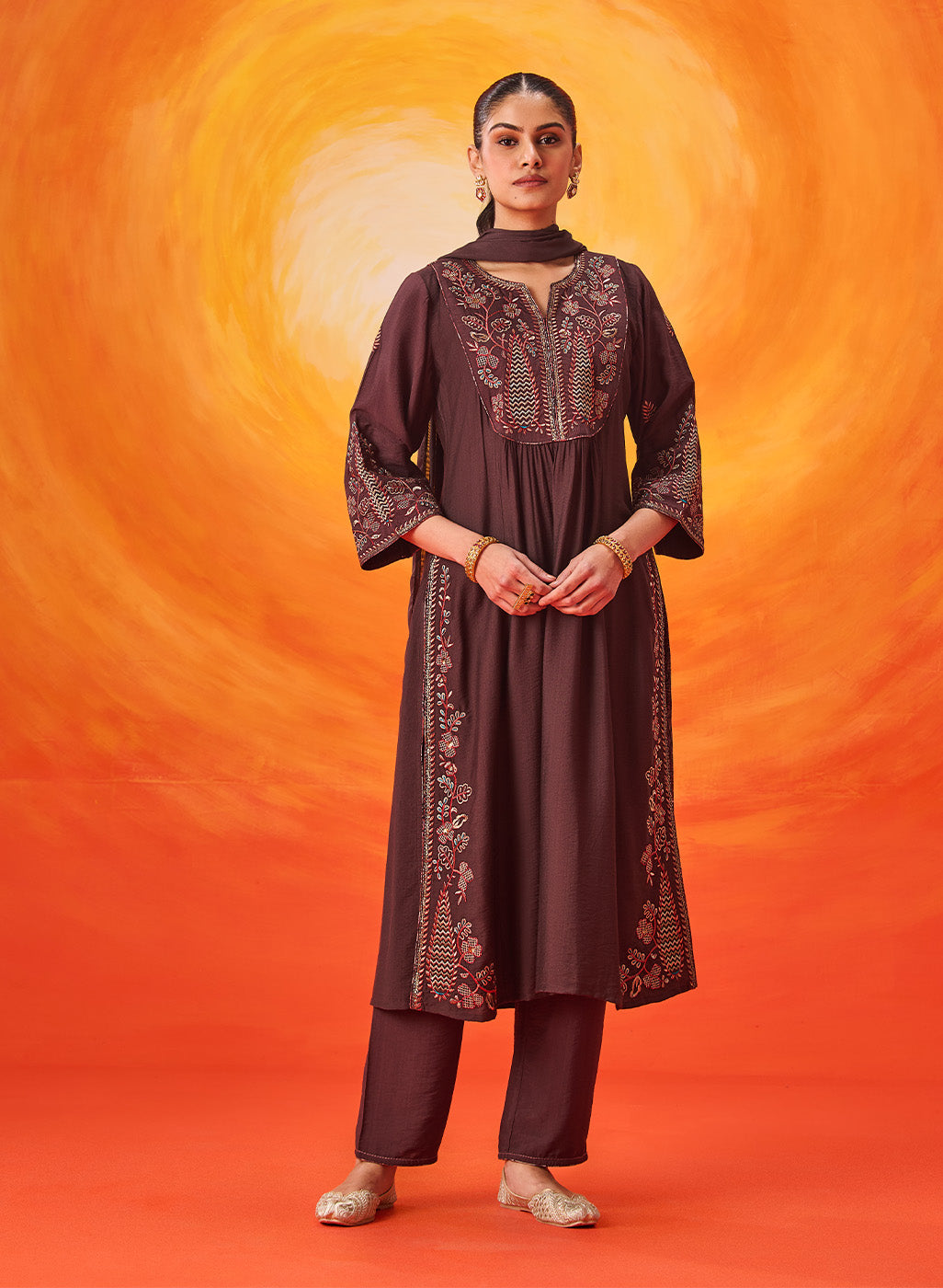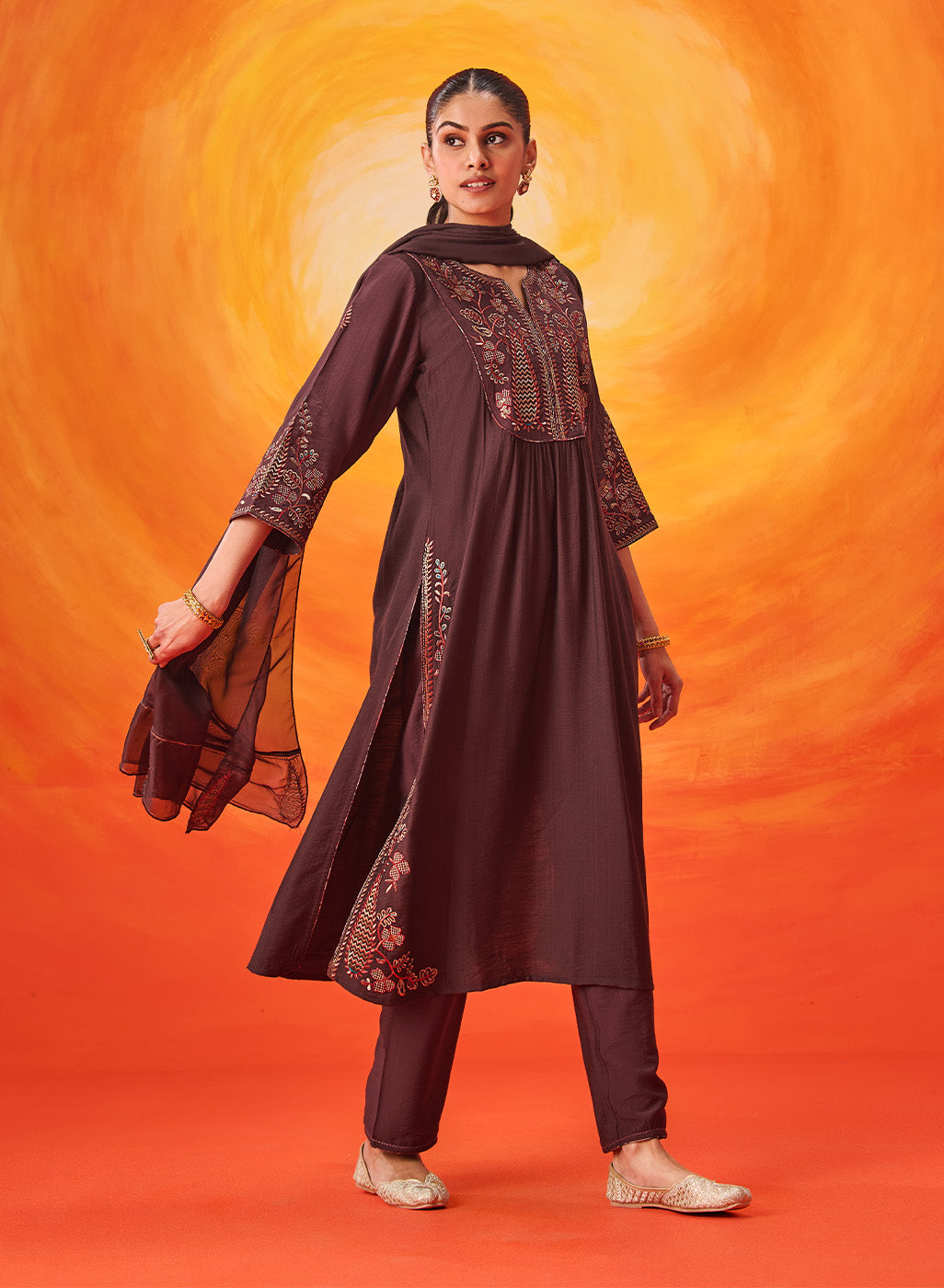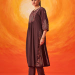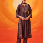 Crafted in a serene cool-toned brown, this suit set feels rooted and luxurious all at once. The subtle shimmer of zari embroidery against the muted base creates a look that’s understated, sophisticated, and effortlessly timeless.