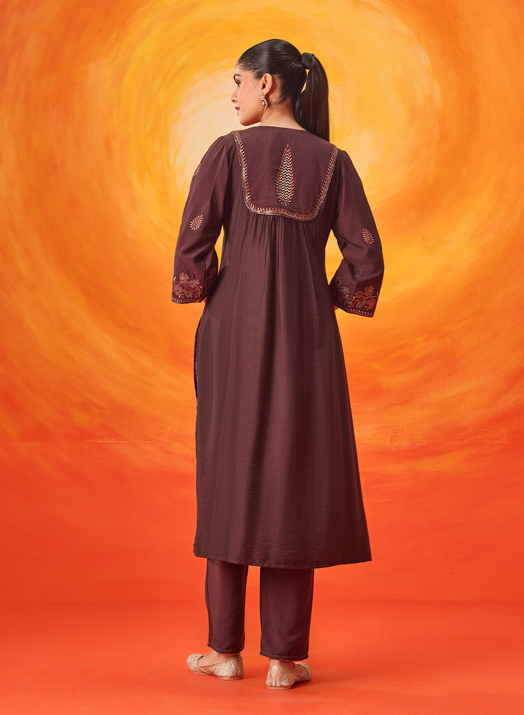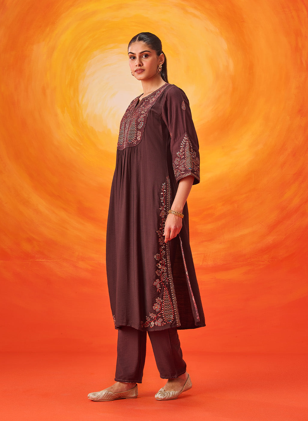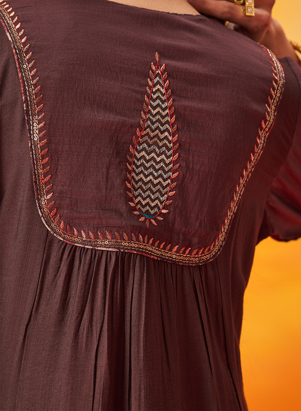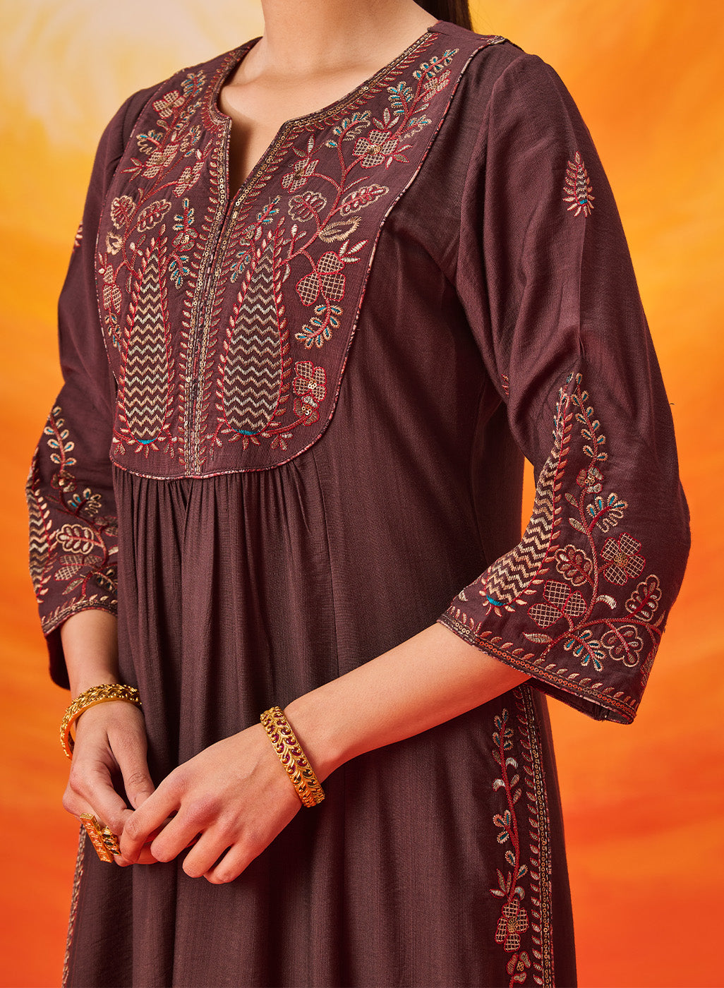 • Soft gathers below the yoke enhance the graceful drape of the kurta.