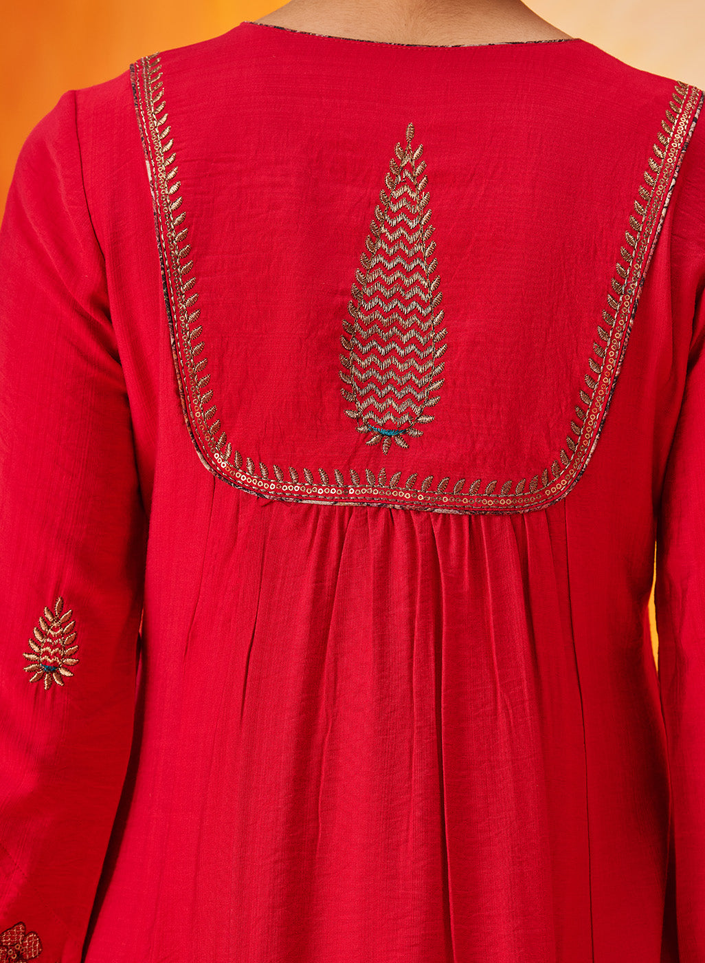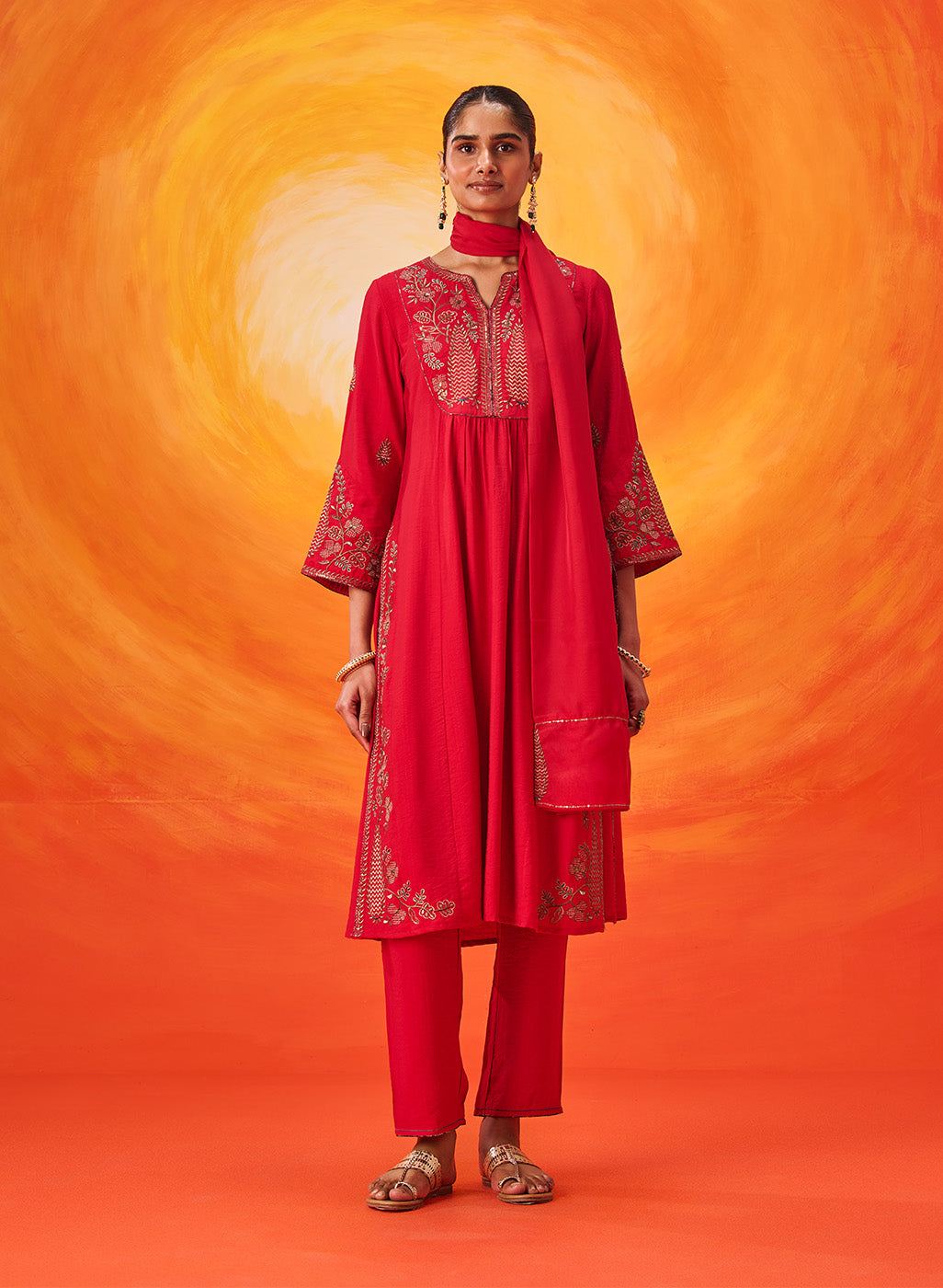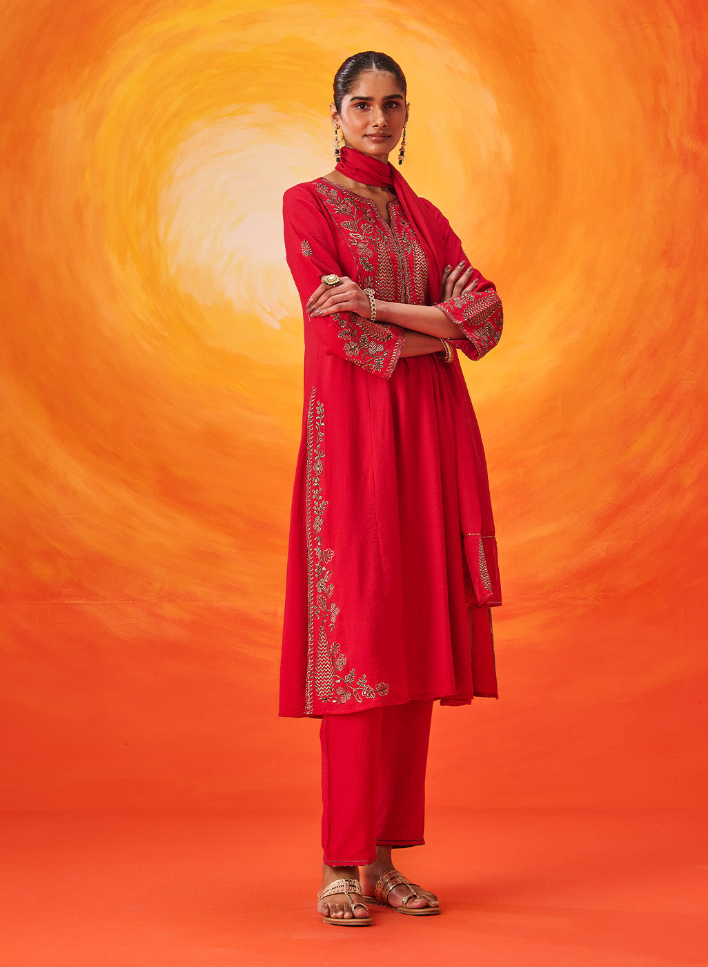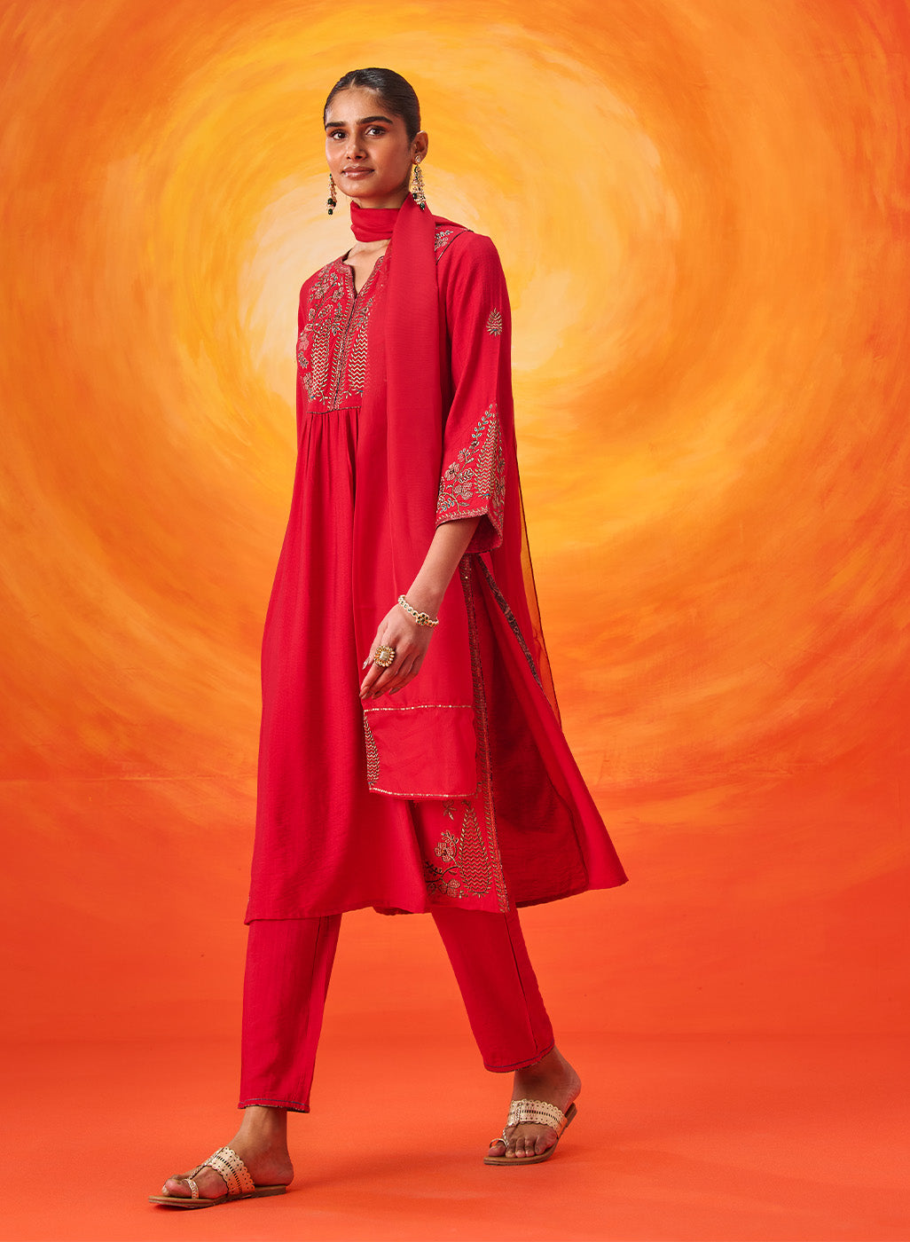 Draped in a rich red hue, this suit set feels ceremonial yet graceful, where heritage-inspired embroidery meets fluid summer elegance. Gentle gathers soften the silhouette, while zari and sequin accents catch the light with every movement, adding a subtle festive glow.