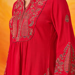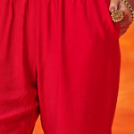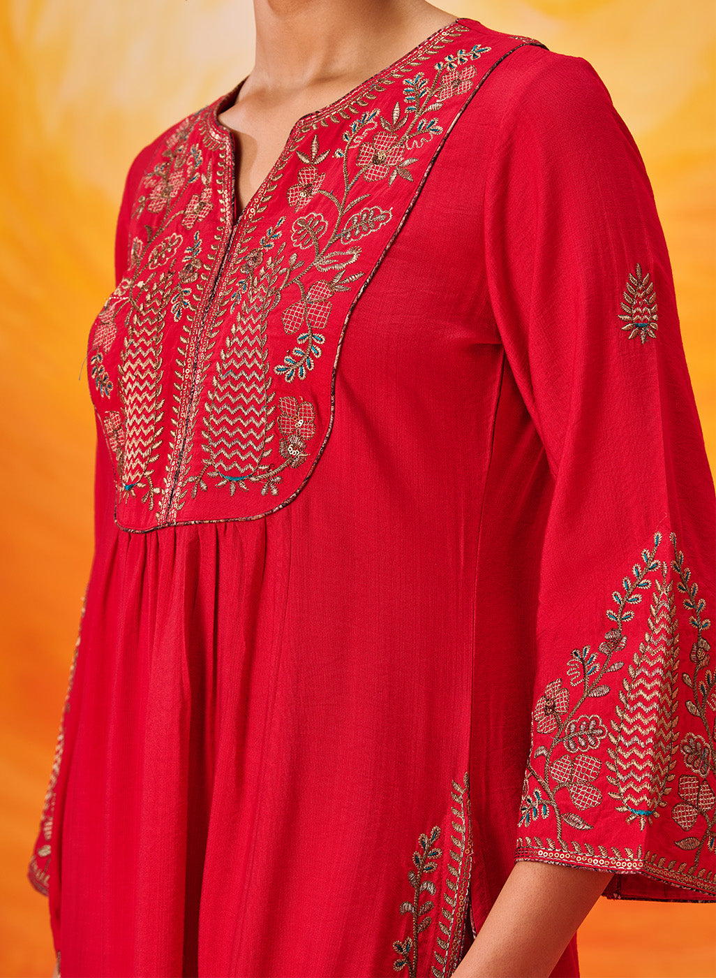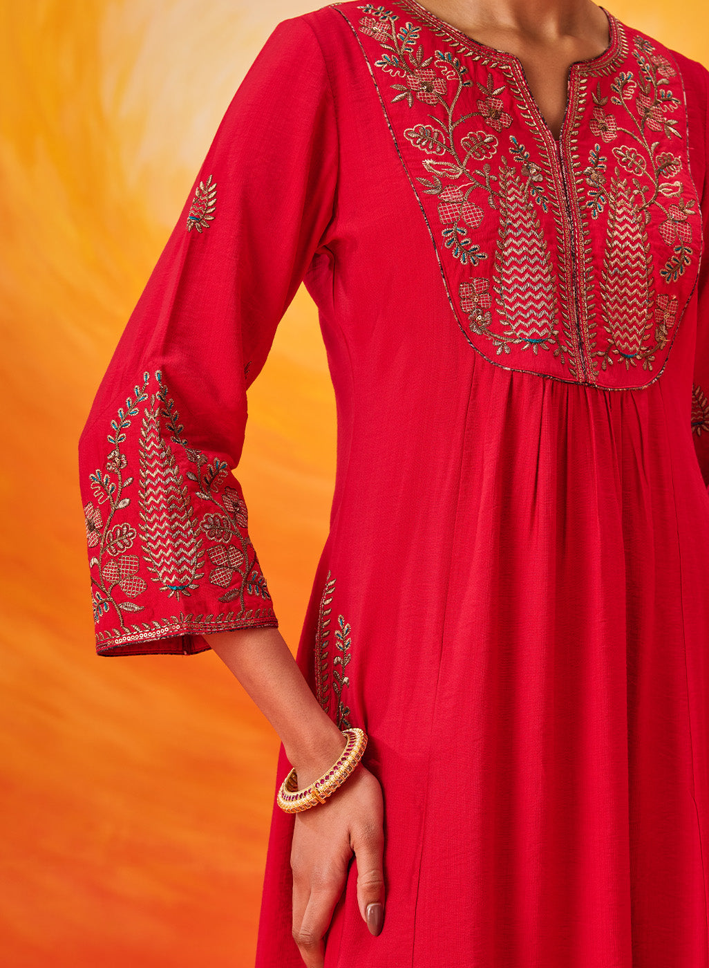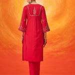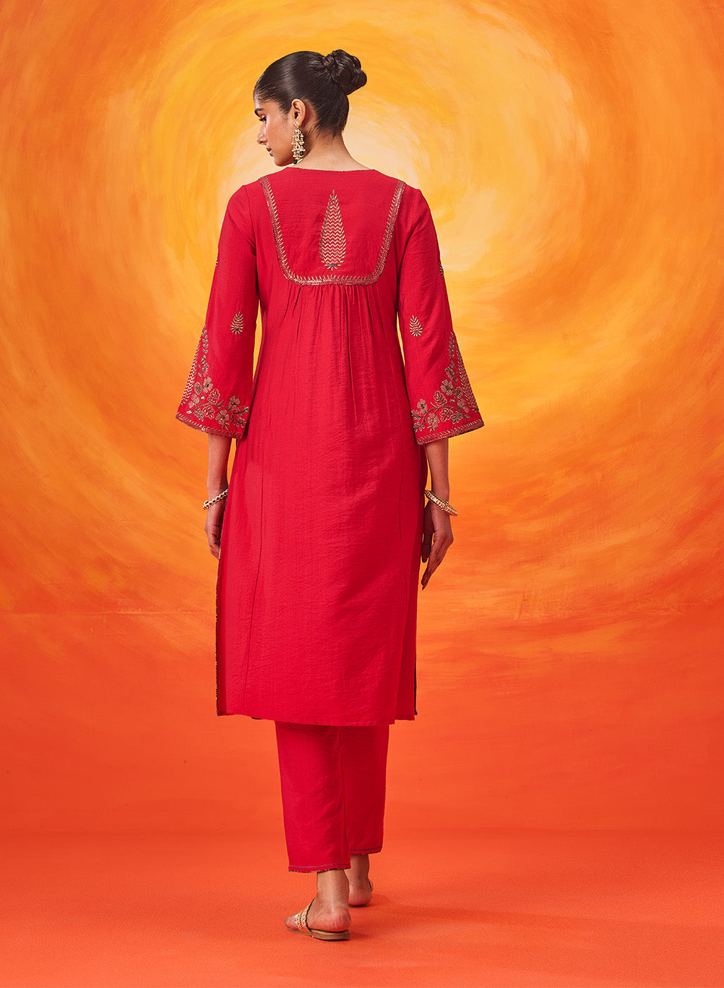 Draped in a rich red hue, this suit set feels ceremonial yet graceful, where heritage-inspired embroidery meets fluid summer elegance. Gentle gathers soften the silhouette, while zari and sequin accents catch the light with every movement, adding a subtle festive glow.