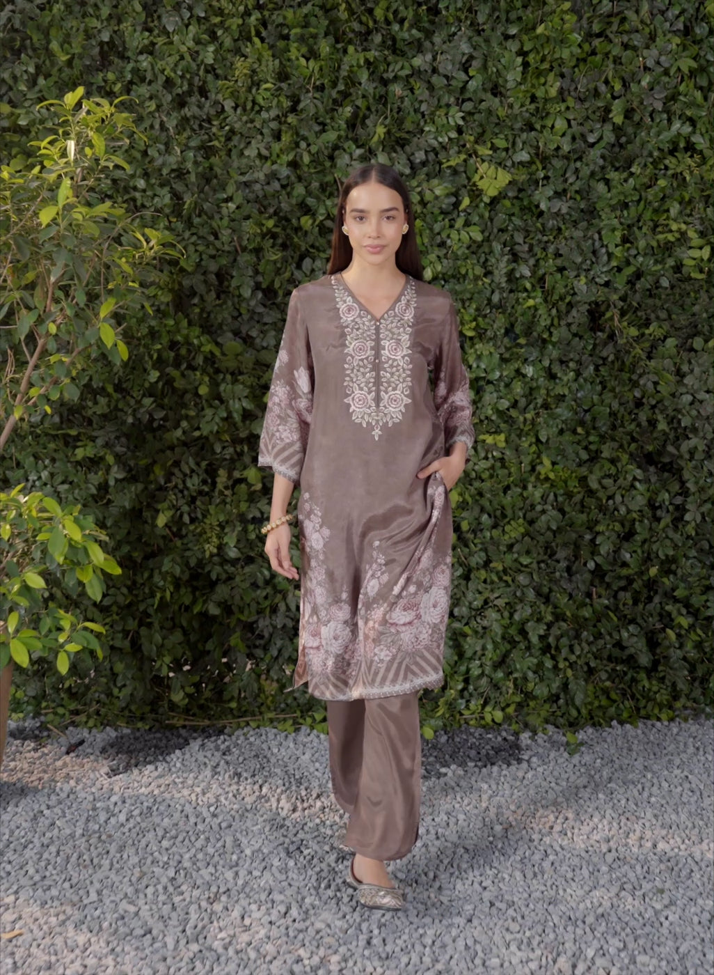 Fleur Stone Grey Printed Shantoon Kurta Set for Women
