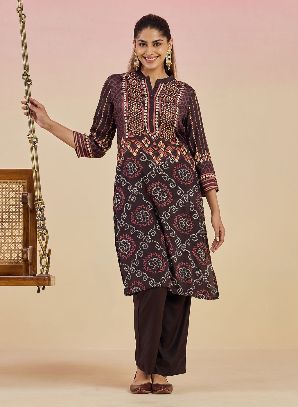 Brown Printed Viscose Shantoon Kurta Set