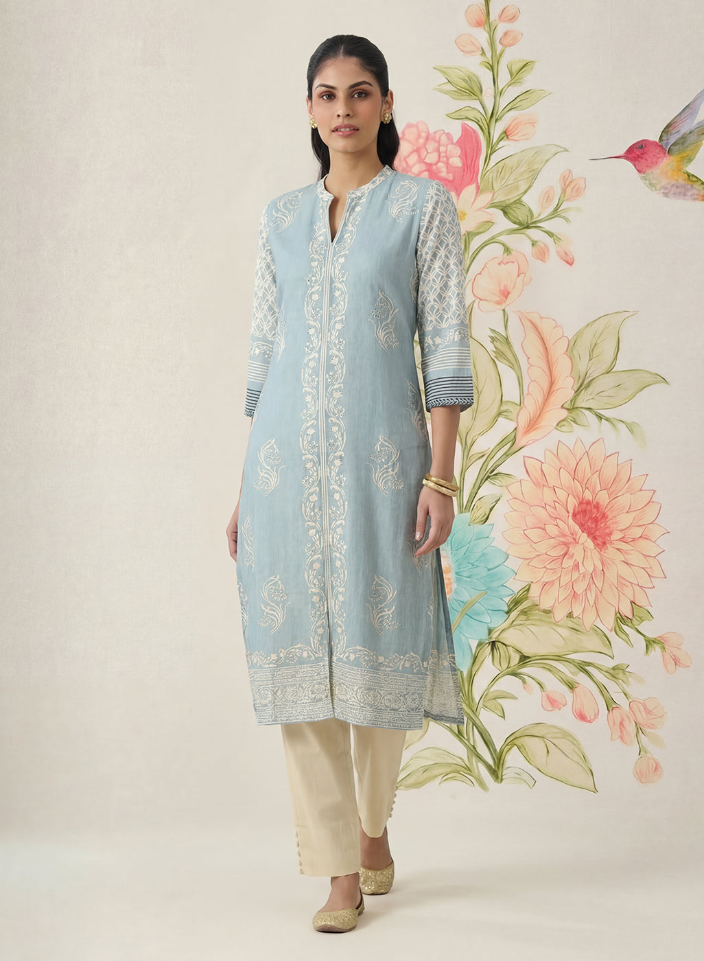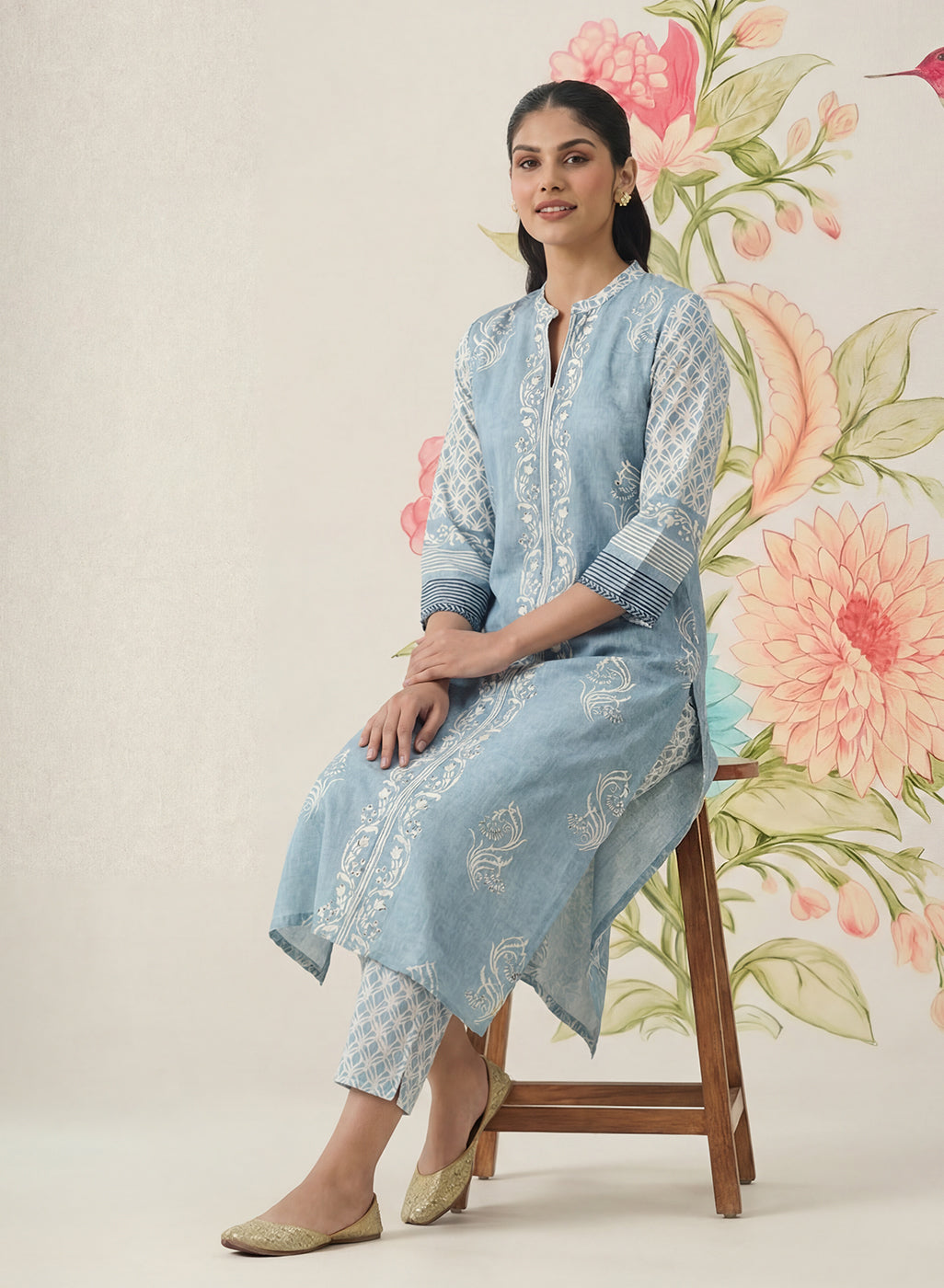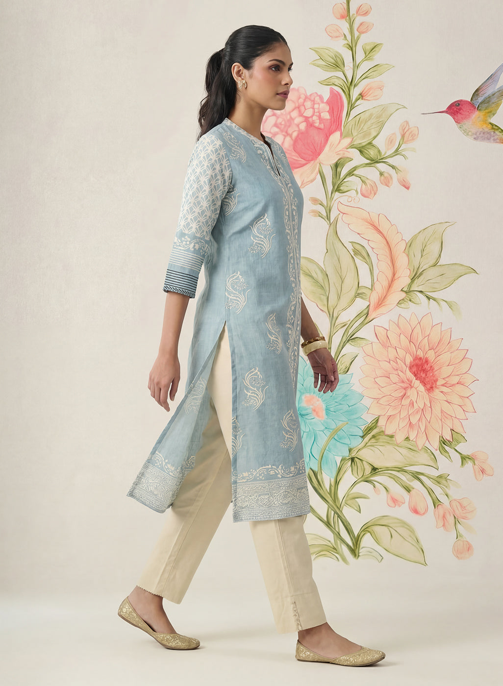 Fresh and understated, this light blue kurta combines airy comfort with refined detailing. Crafted from ultra-comfortable linen, it features an all-over print arranged in structured vertical panels, subtly enhanced with sparkling rhinestone highlights for a touch of elegance.