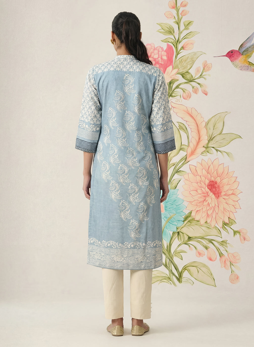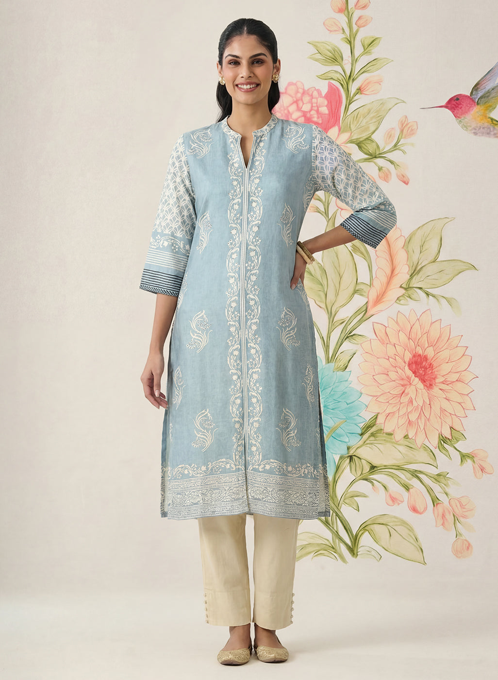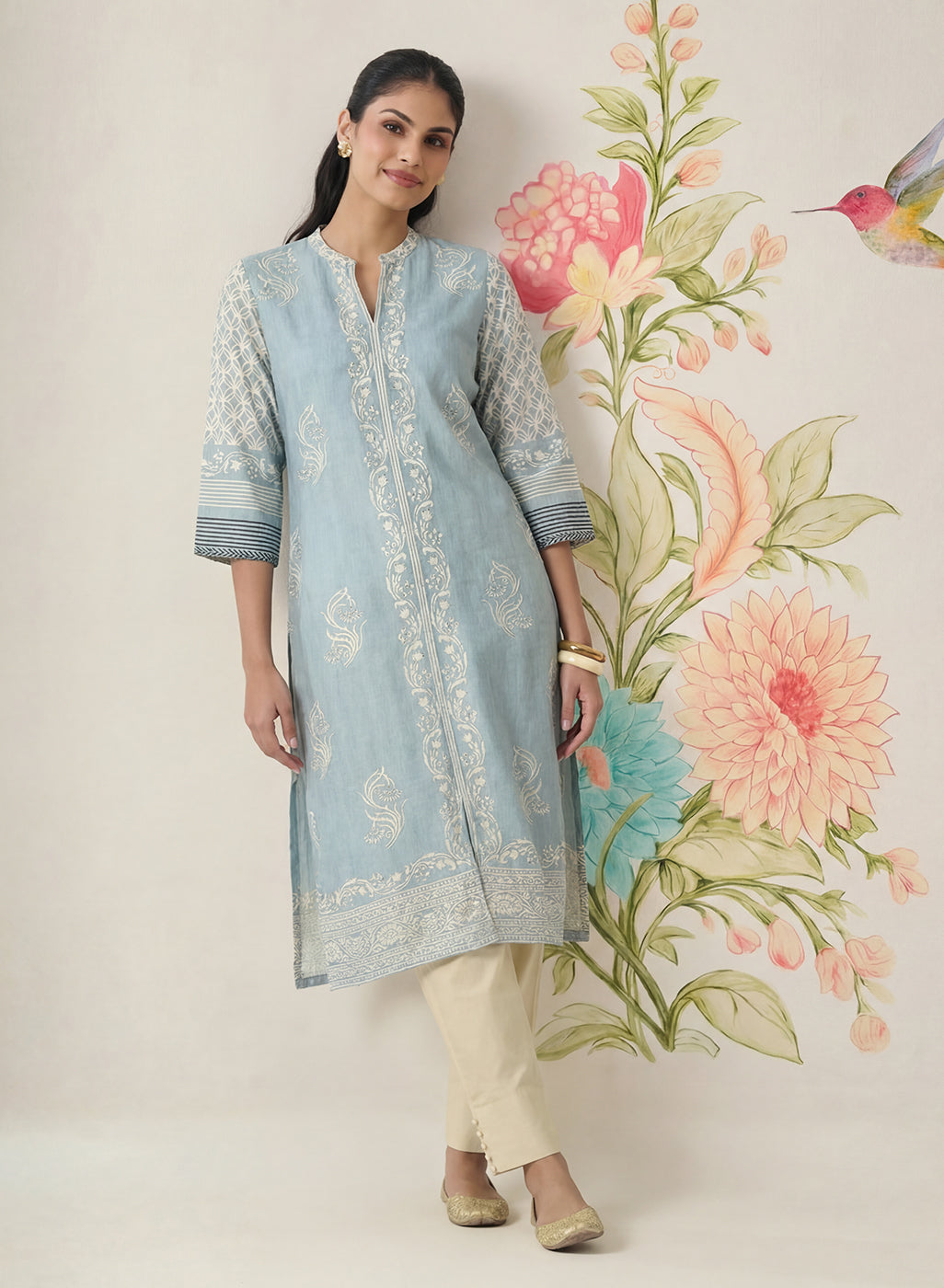 Fresh and understated, this light blue kurta combines airy comfort with refined detailing. Crafted from ultra-comfortable linen, it features an all-over print arranged in structured vertical panels, subtly enhanced with sparkling rhinestone highlights for a touch of elegance.