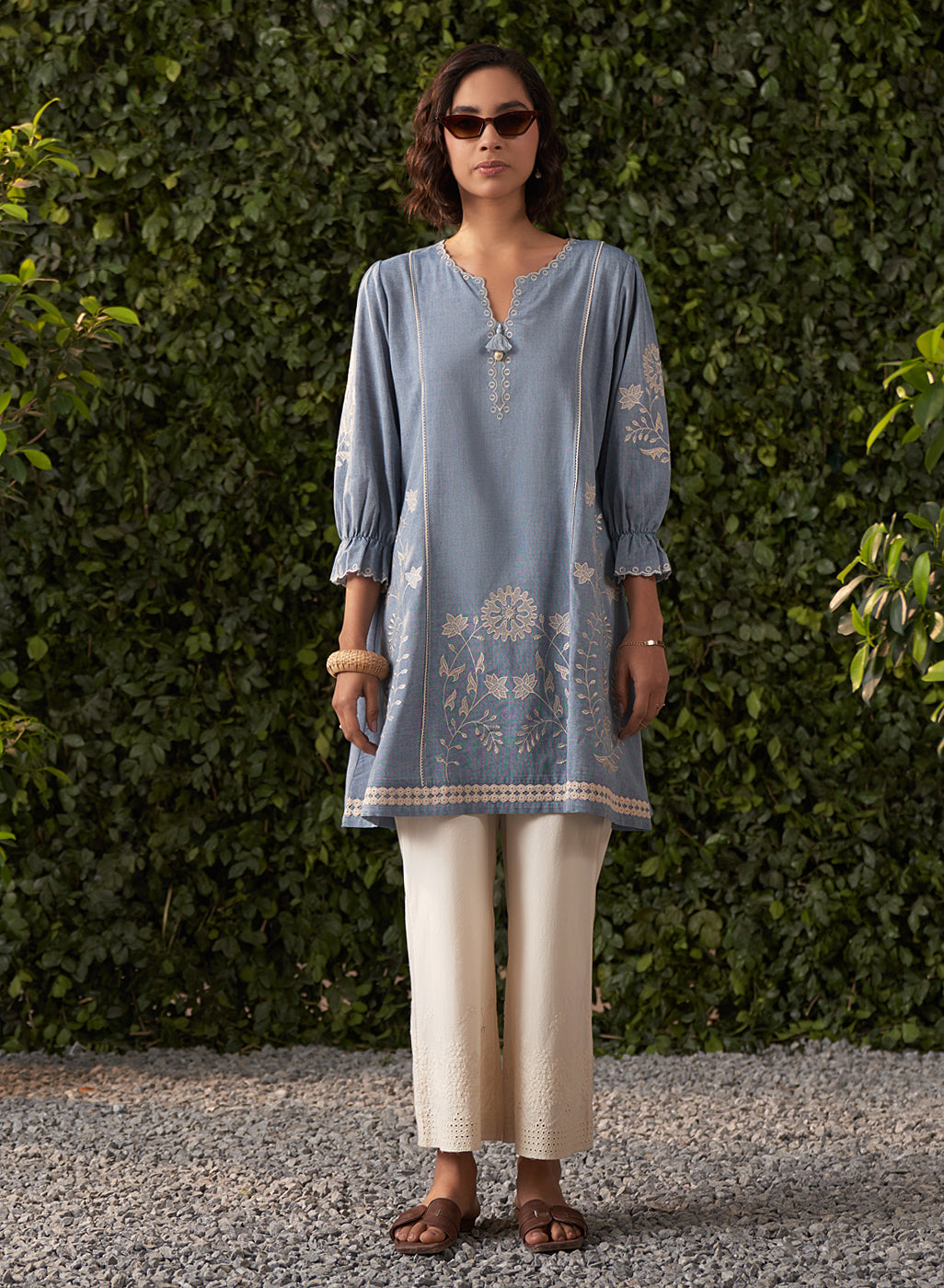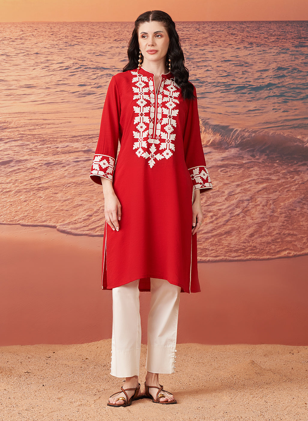 Ivory Embroidered Cotton Gauze Kurta - Mid