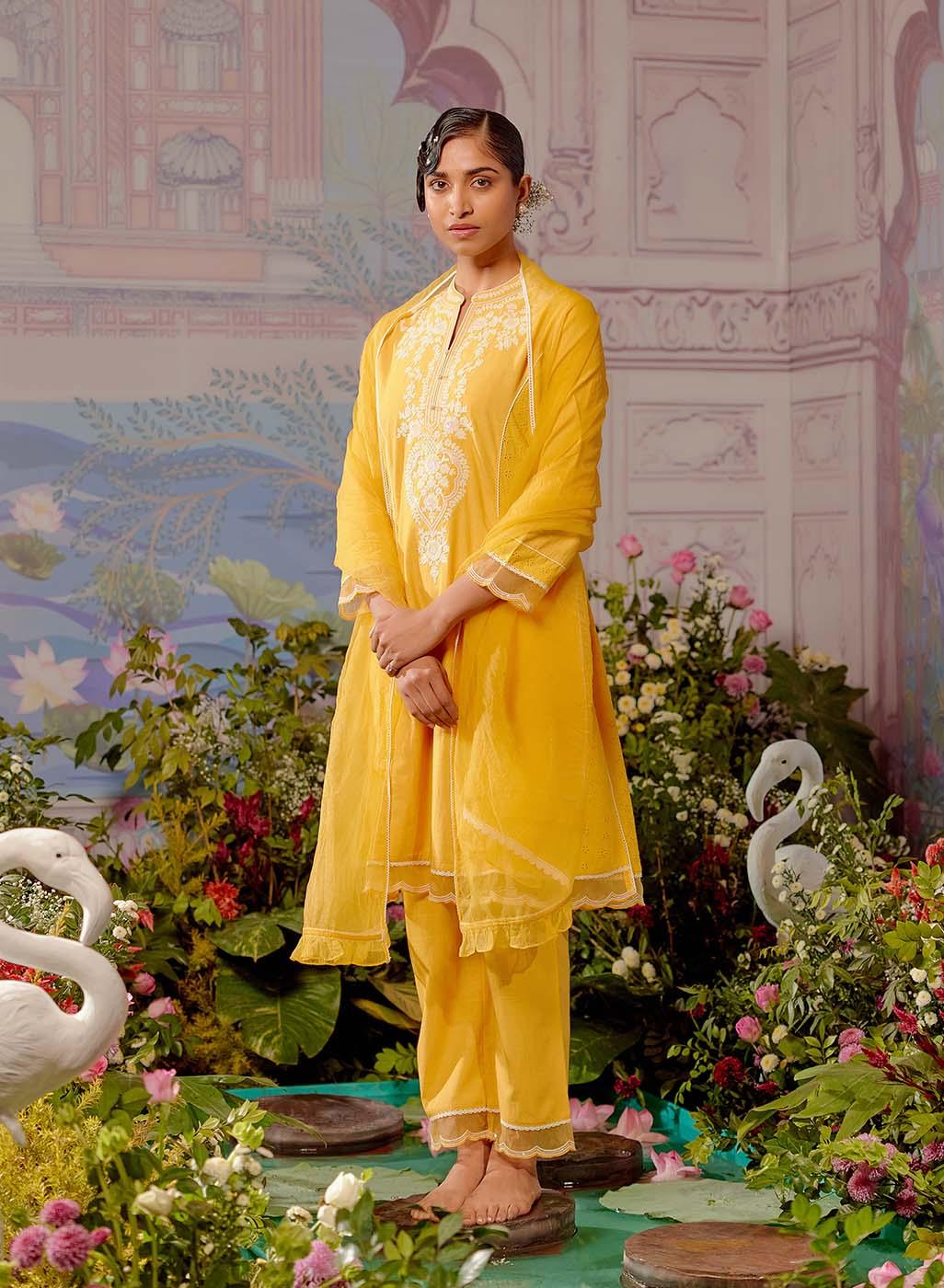 Solid Yellow Textured Kurta Set with Schiffli & Lace Work