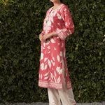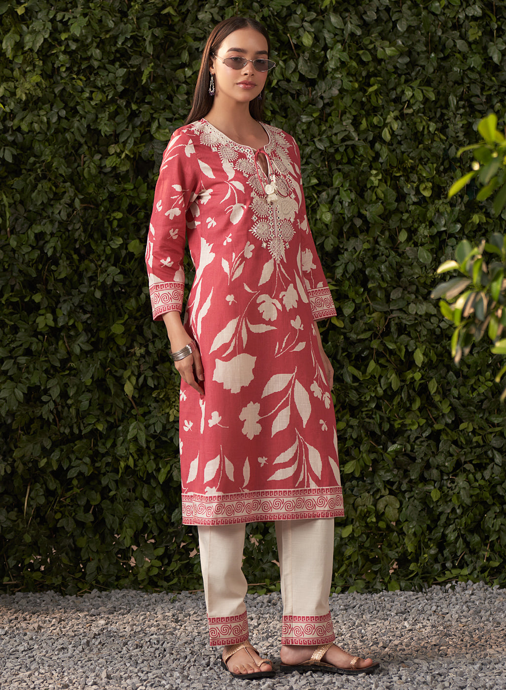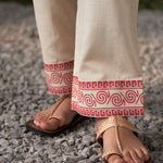 •The cream straight pants complement the kurta, finished with a matching printed border on the hem for a cohesive, polished look.