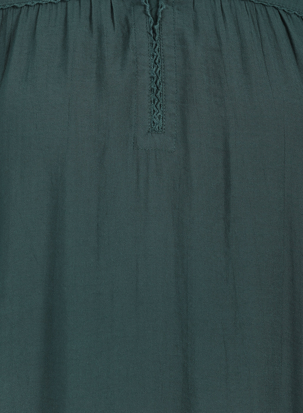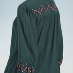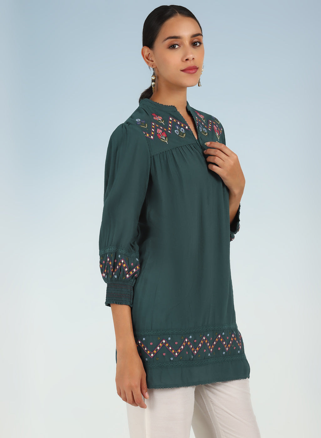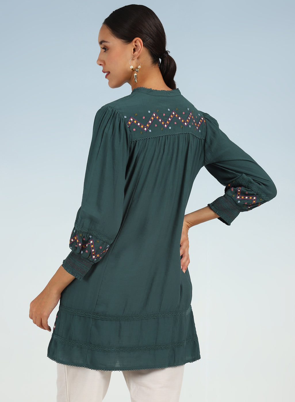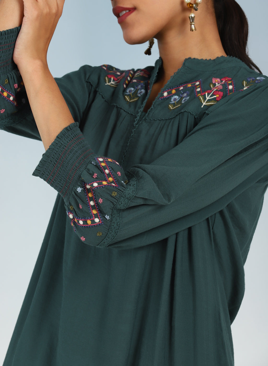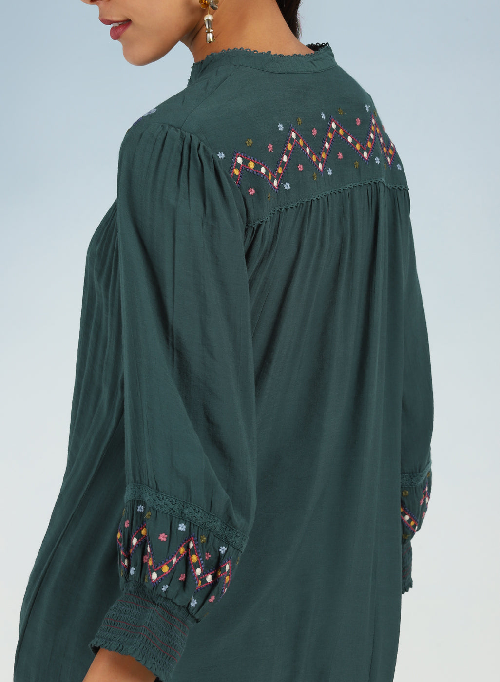 Green A line Rayon Tunic with Embroidery and Smocking effect Puffed Sleeve