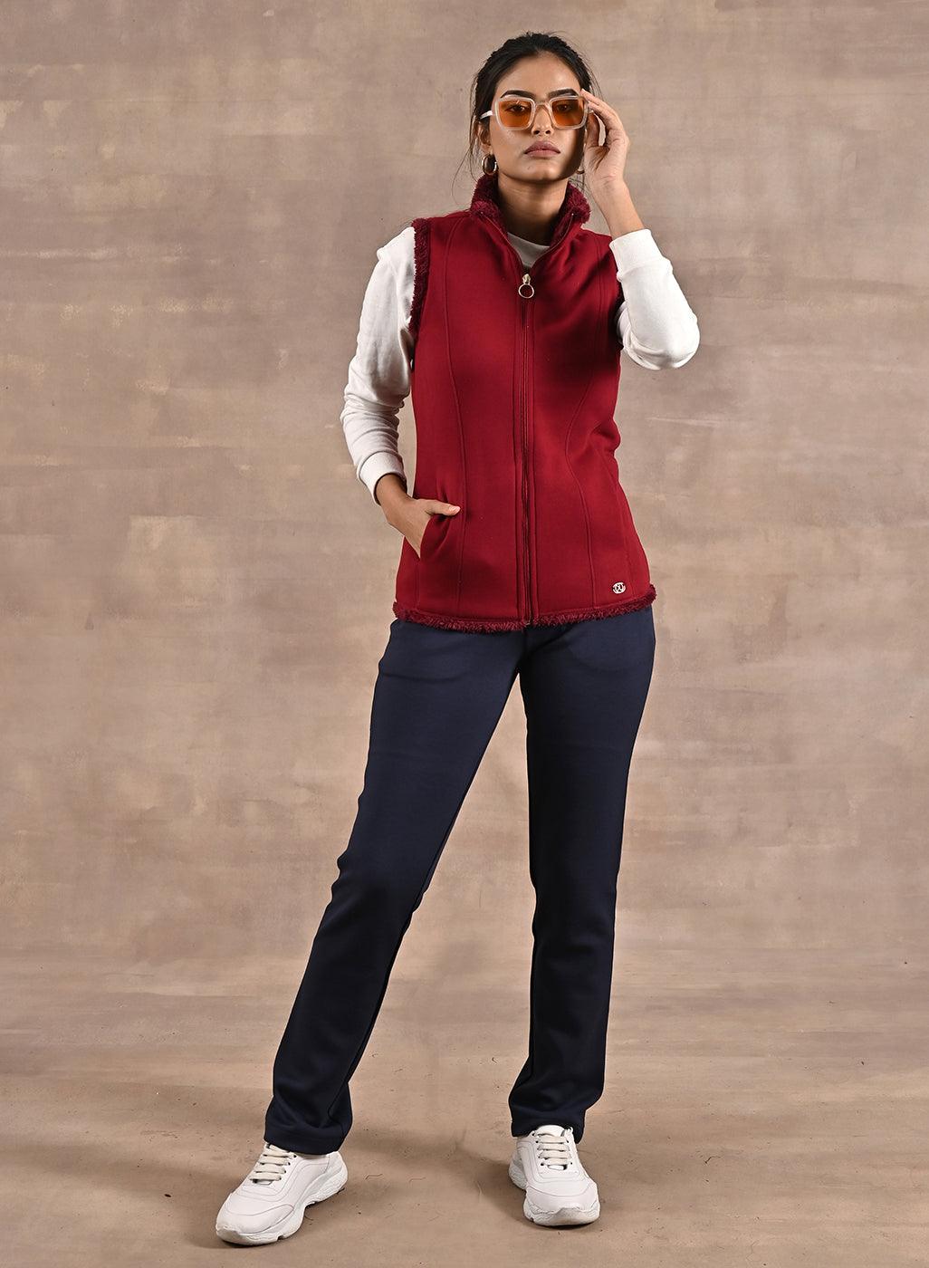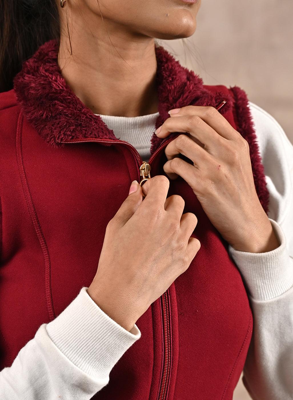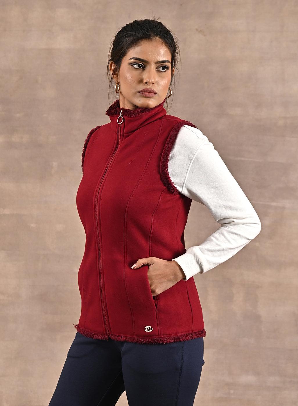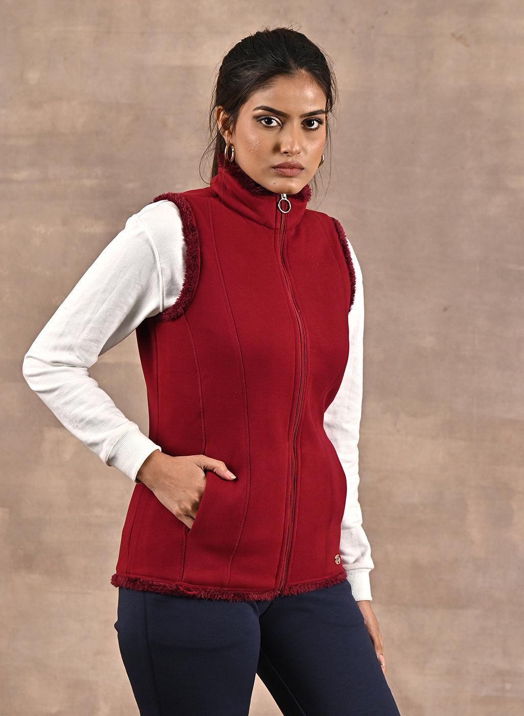 This maroon sleeveless jacket with a high neck and zip closure is made with fleece and goli fur fabric and is the best pick to add to your winter wardrobe. Wear it along with pants or jeggings for women by Lakshita and complete the look with footwear of your choice.