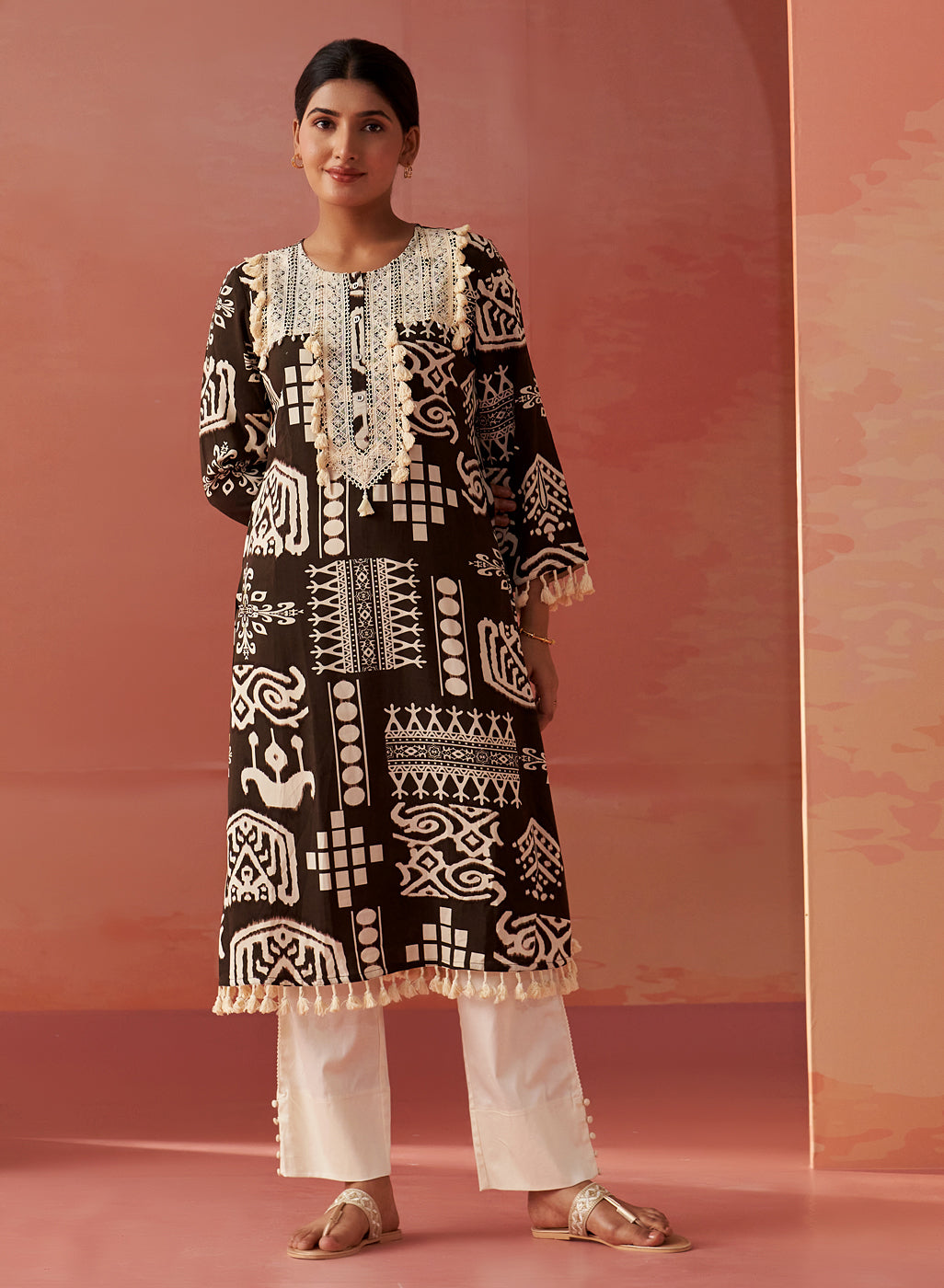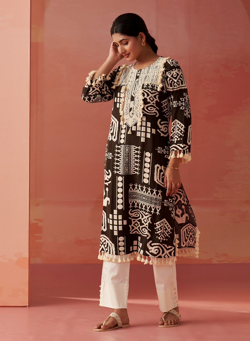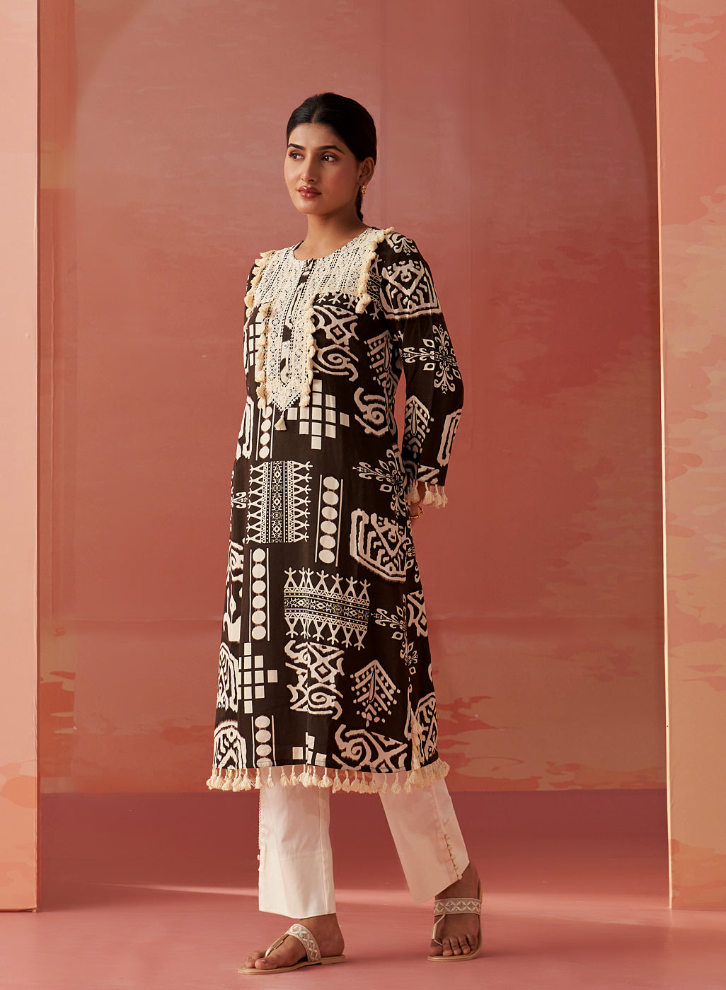 •The kurta features an enchanting all-over print and delicate tassel lace detailing, adding a touch of femininity and grace to it.