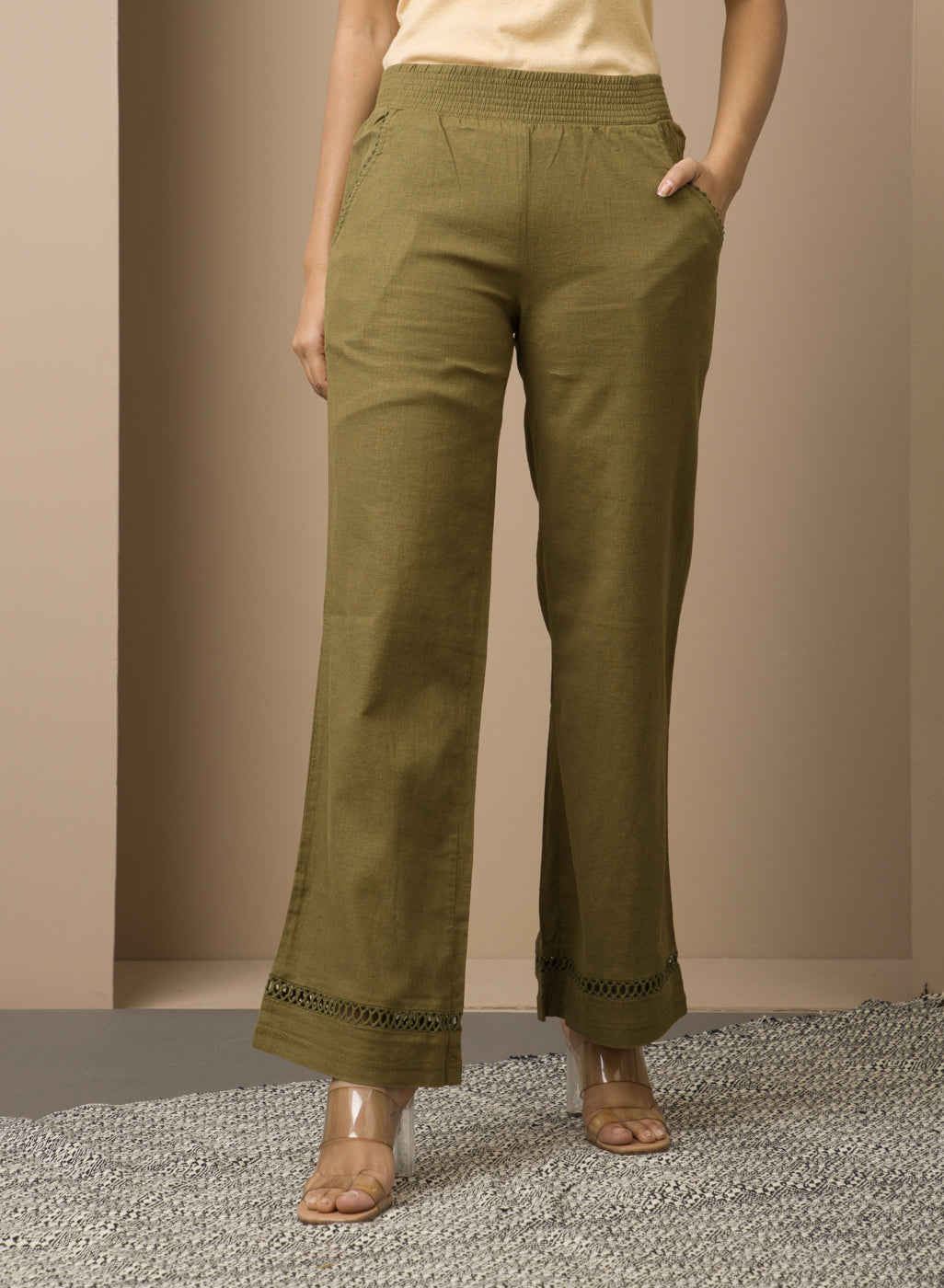 Haya Salmon Mehndi Green Cotton Linen Classic Fit Pants for Women
