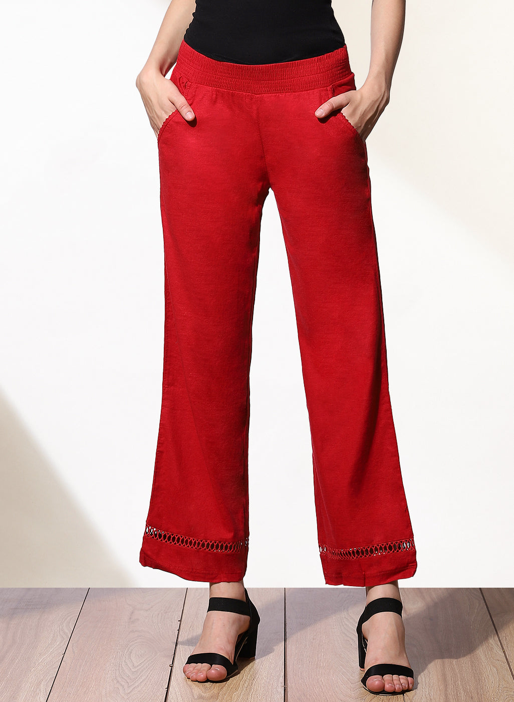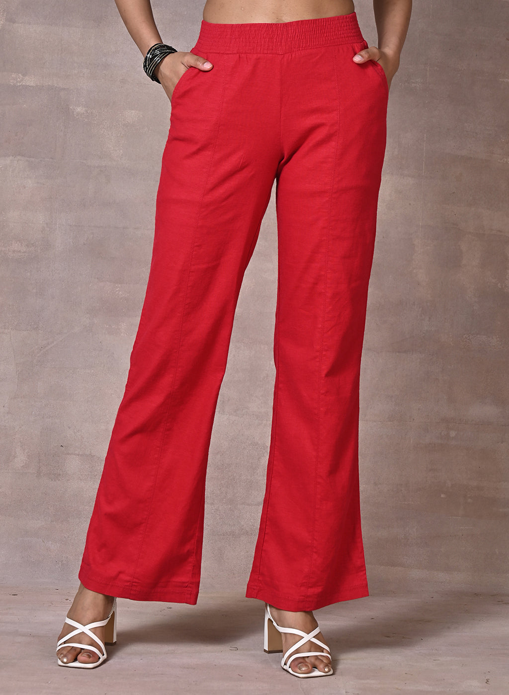 Haya Rose Red Cotton Linen Classic Fit Pants for Women