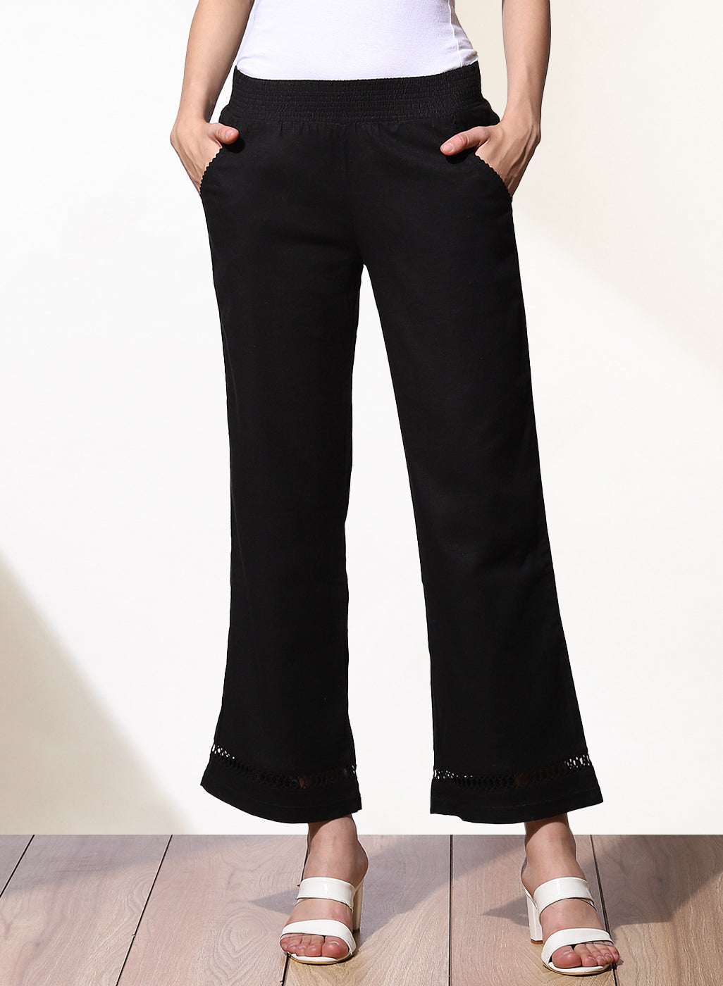 Haya Salmon Black Cotton Linen Classic Fit Pants for Women