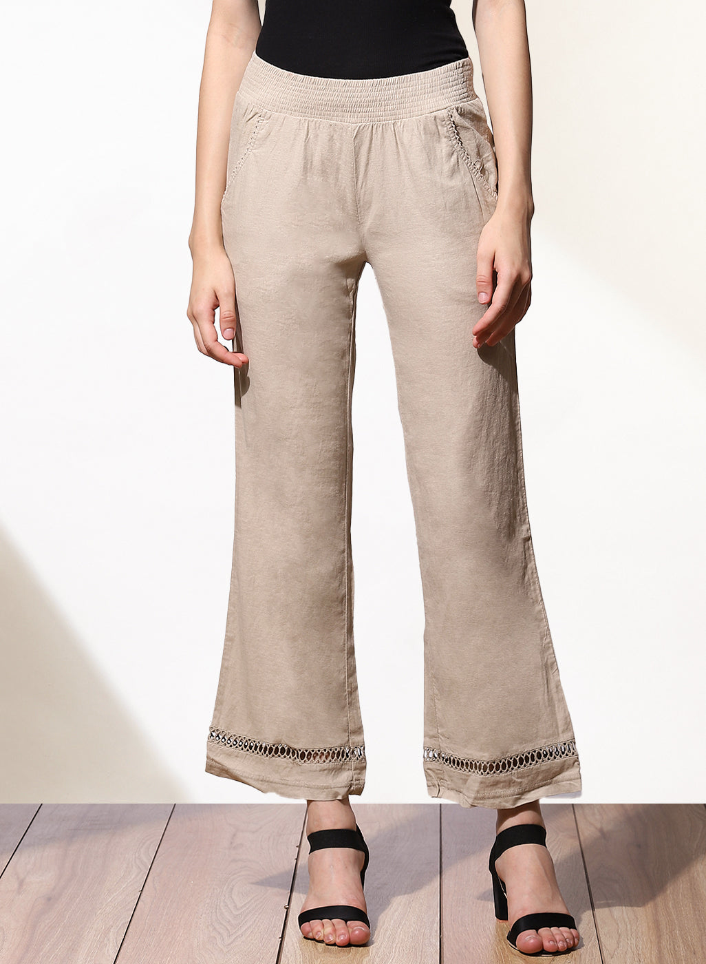 Haya Beige Cotton Linen Classic Fit Pants for Women