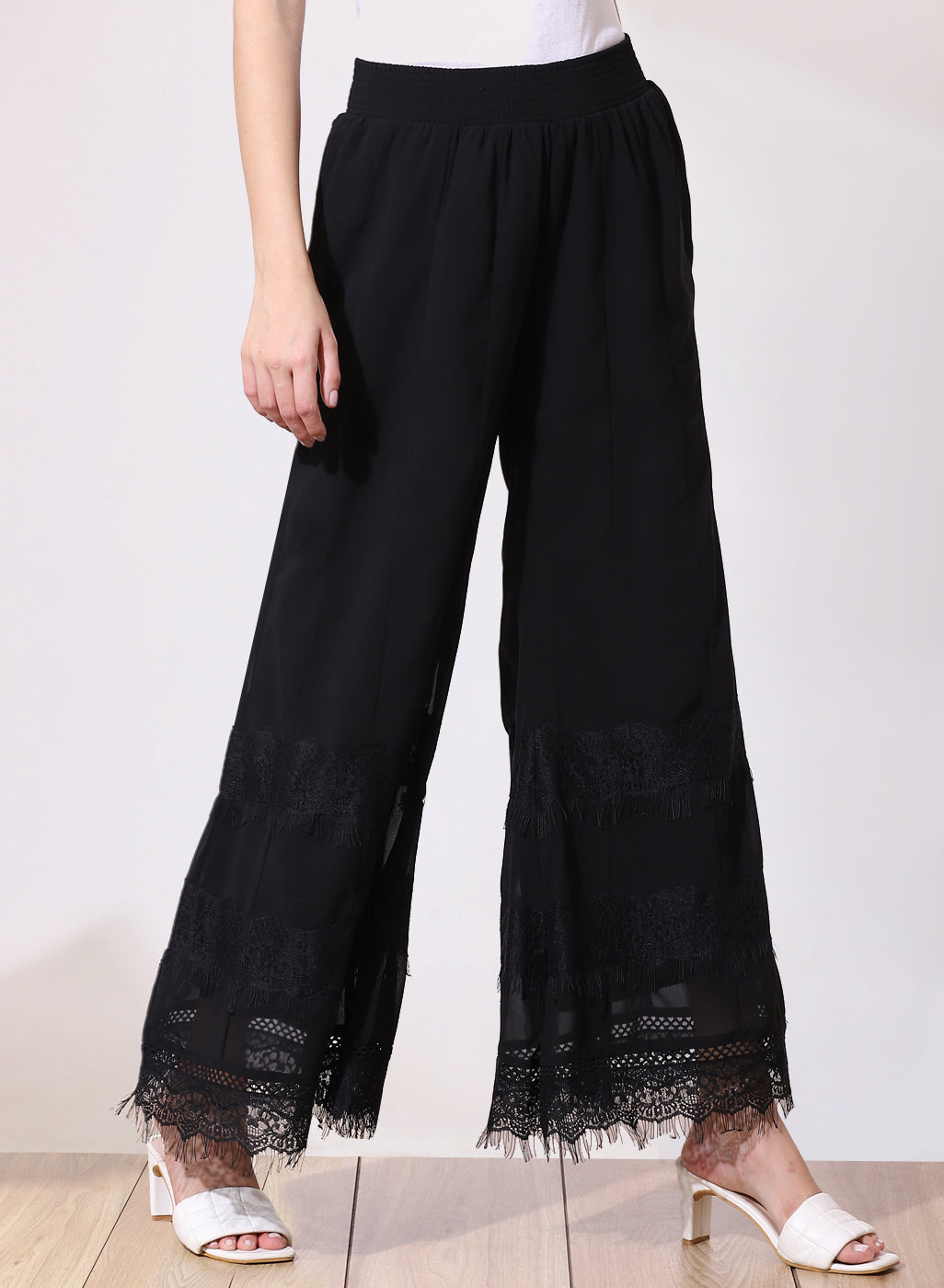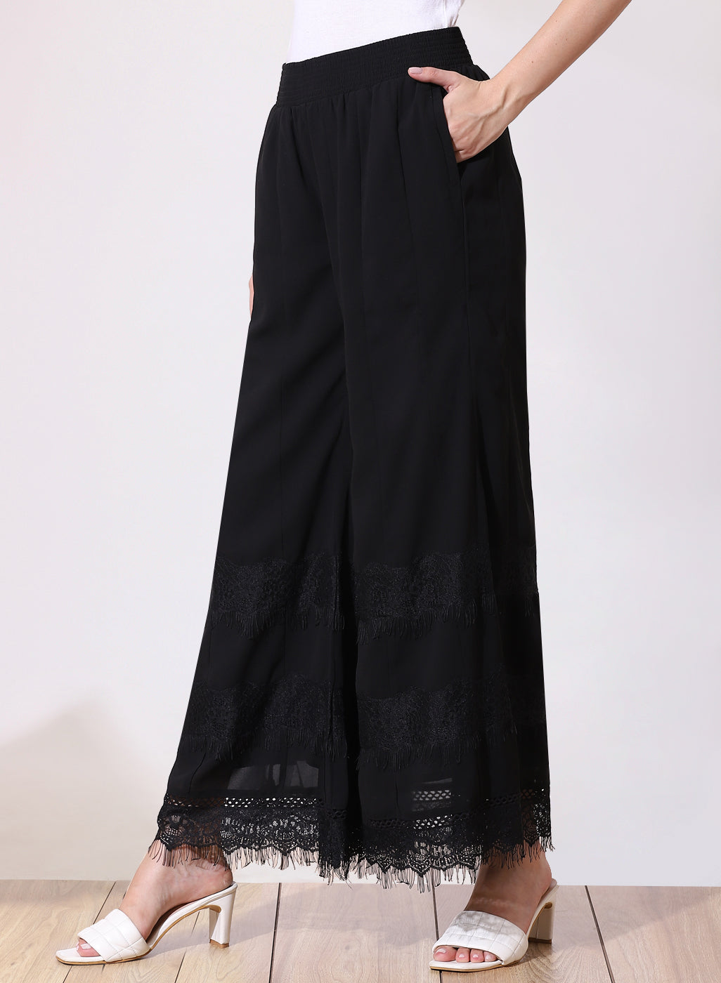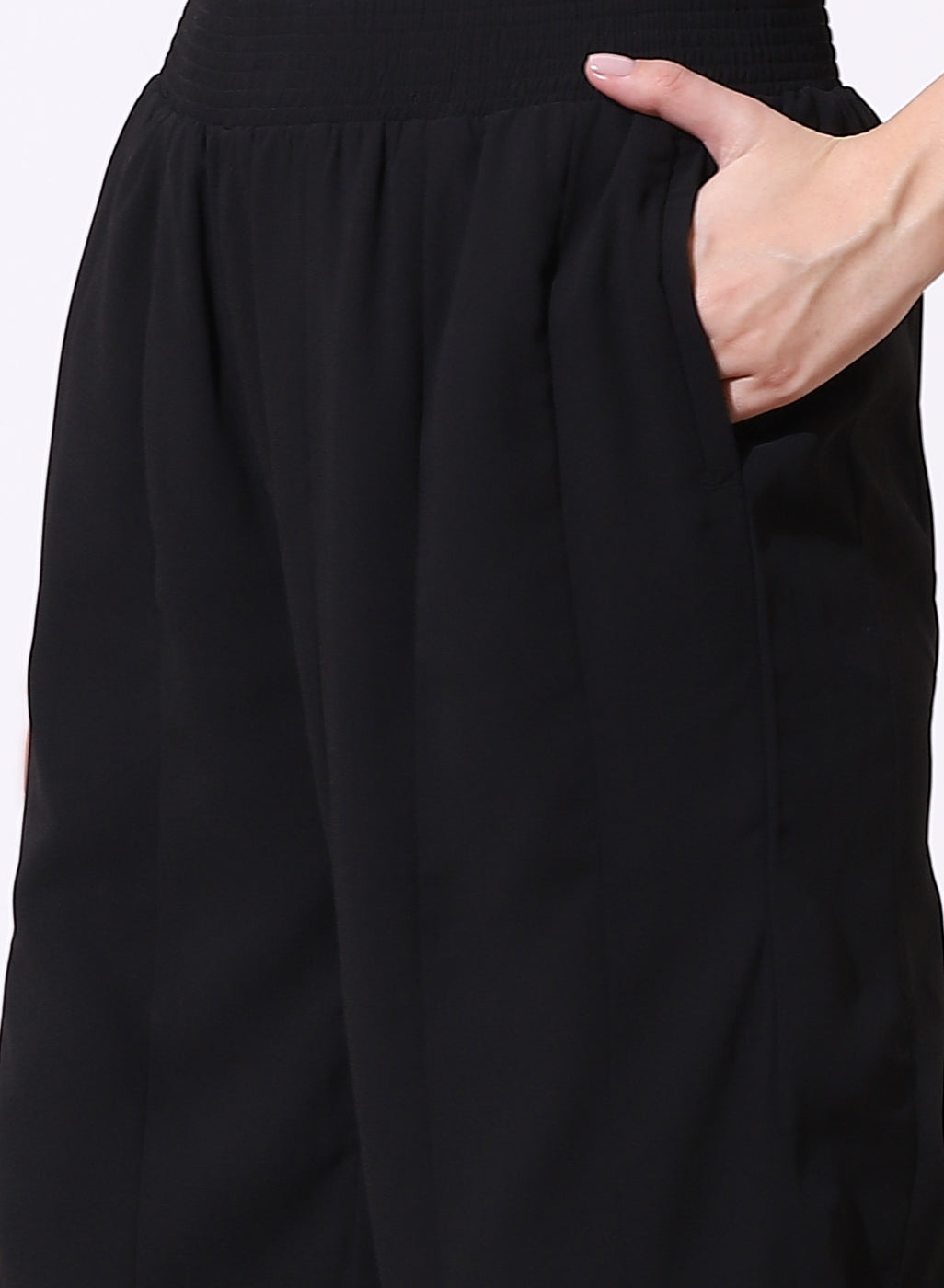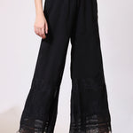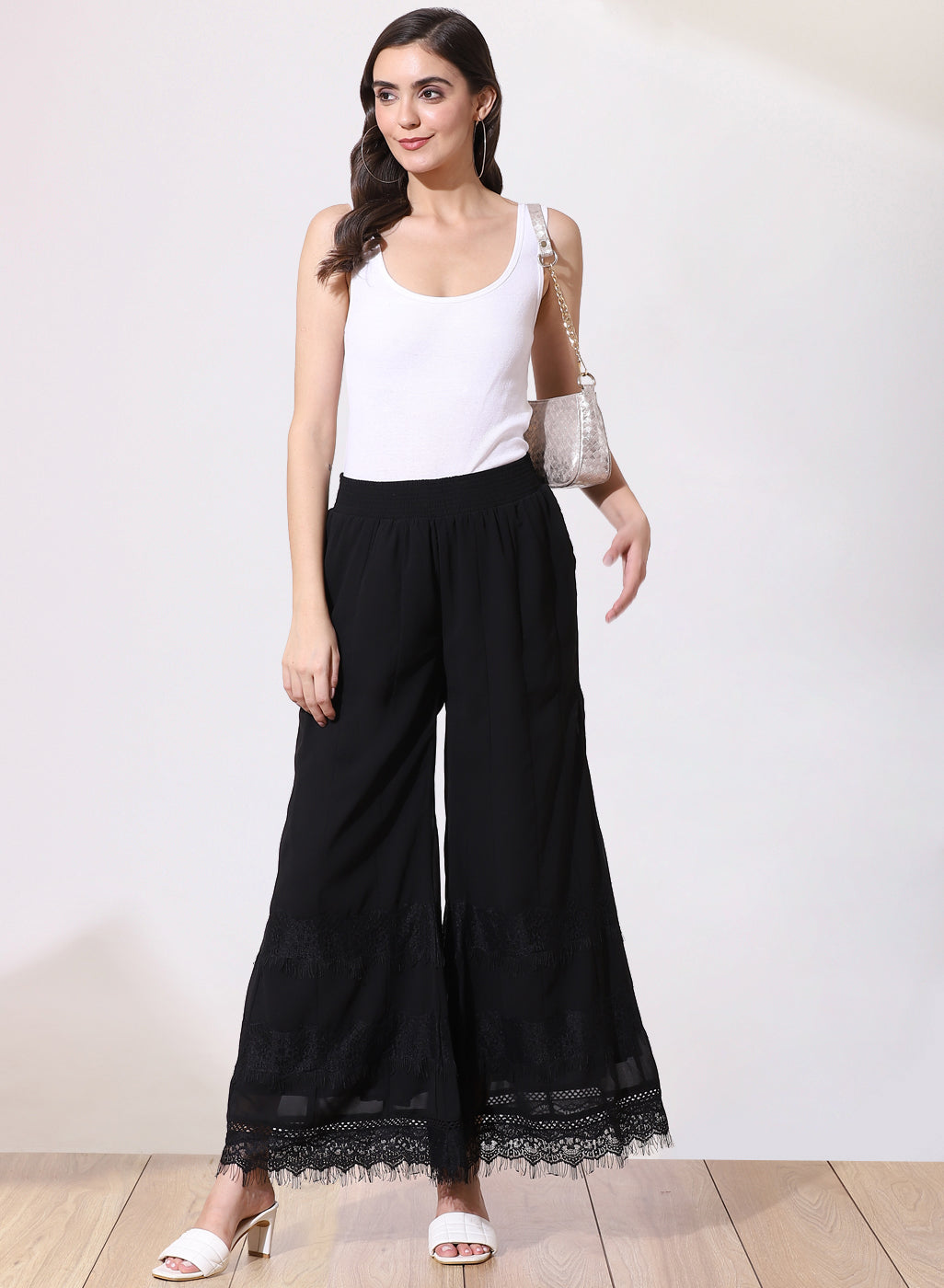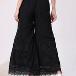 Welcome summer in a bohemian way with this pair of charcoal black Sharara from the house of Lakshita. Made from pure cotton fabric, it also comes with a matching lining in terylene material for ease of movement. The wide-legged design of the Sharara also flaunts an elasticated waistband for the perfect fit. Pair it with a crop top, a jute bag, and flats to head out for a lazy stroll.
