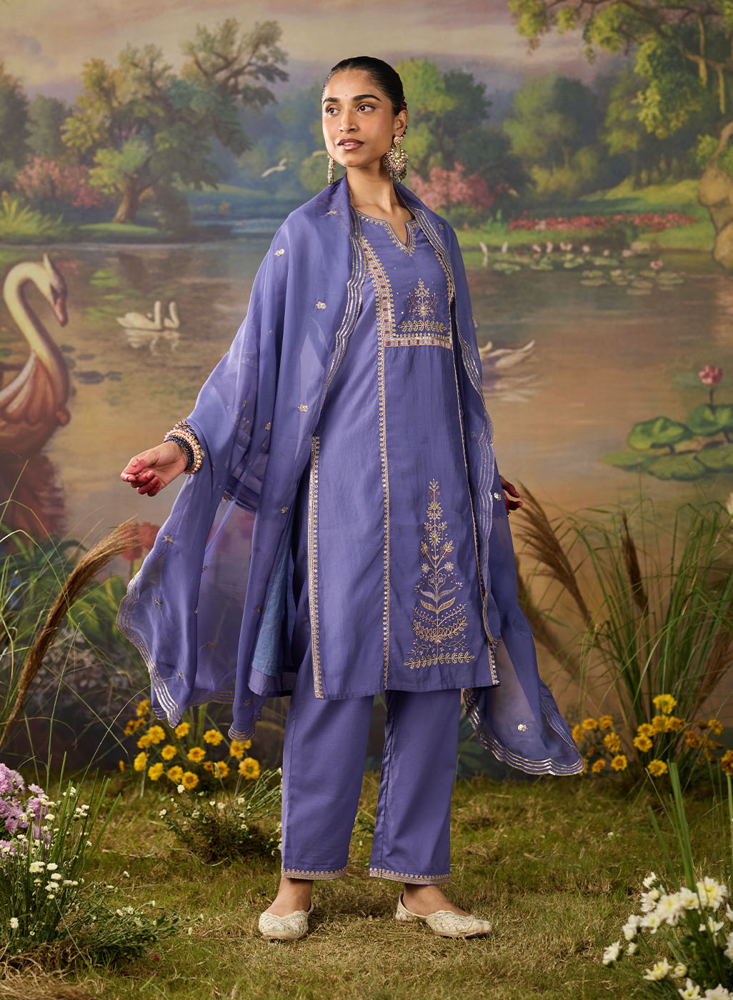 Nisha Lavennder Zari Emroidered Chanderi Straight Suit Set with Dupatta
