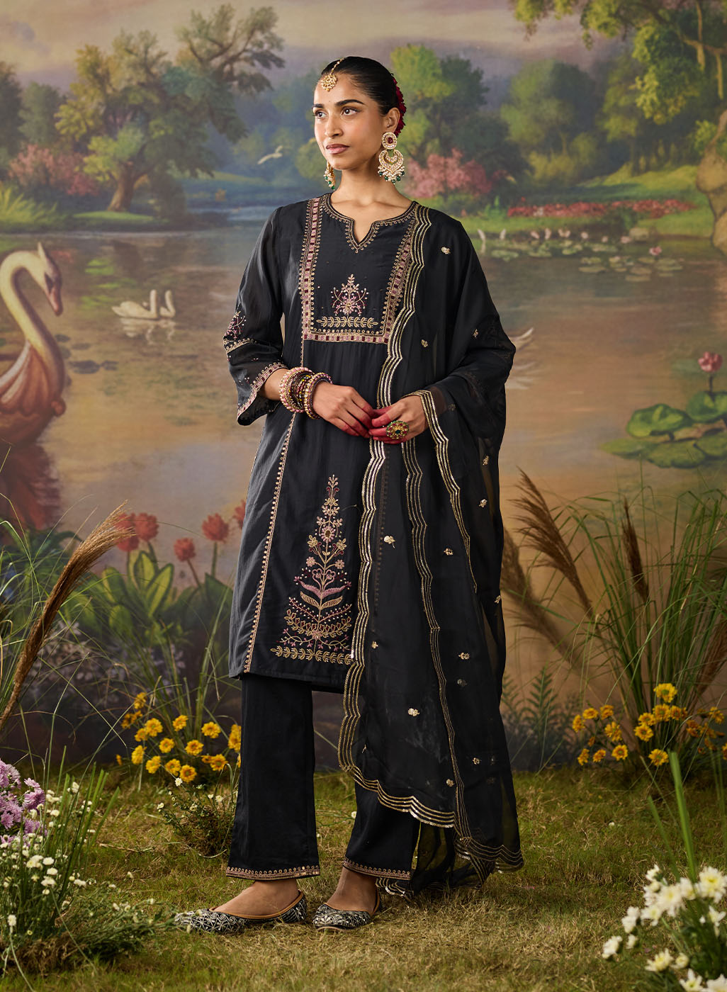 Nisha Classic Black Zari Emroidered Chanderi Straight Suit Set with Dupatta