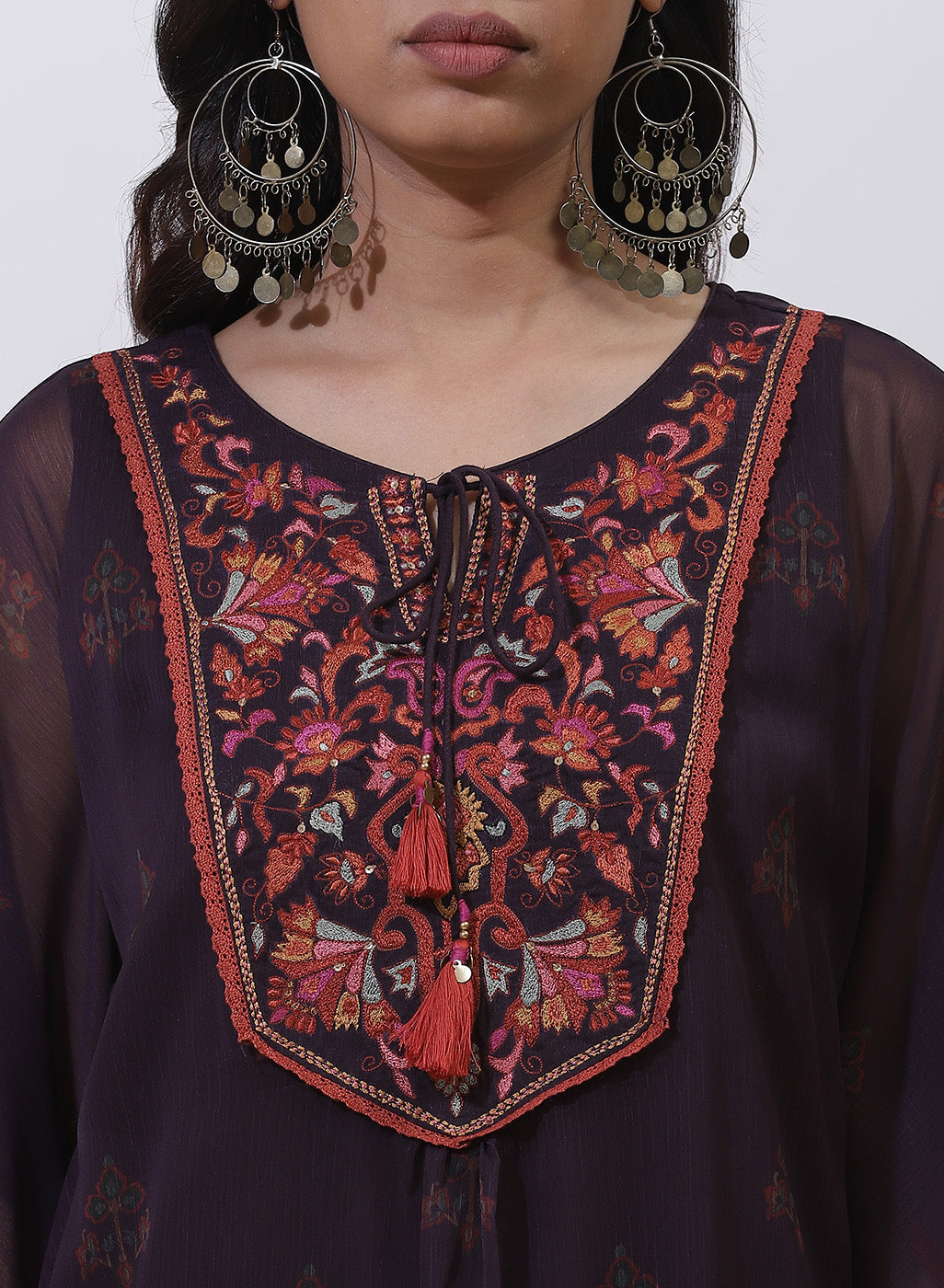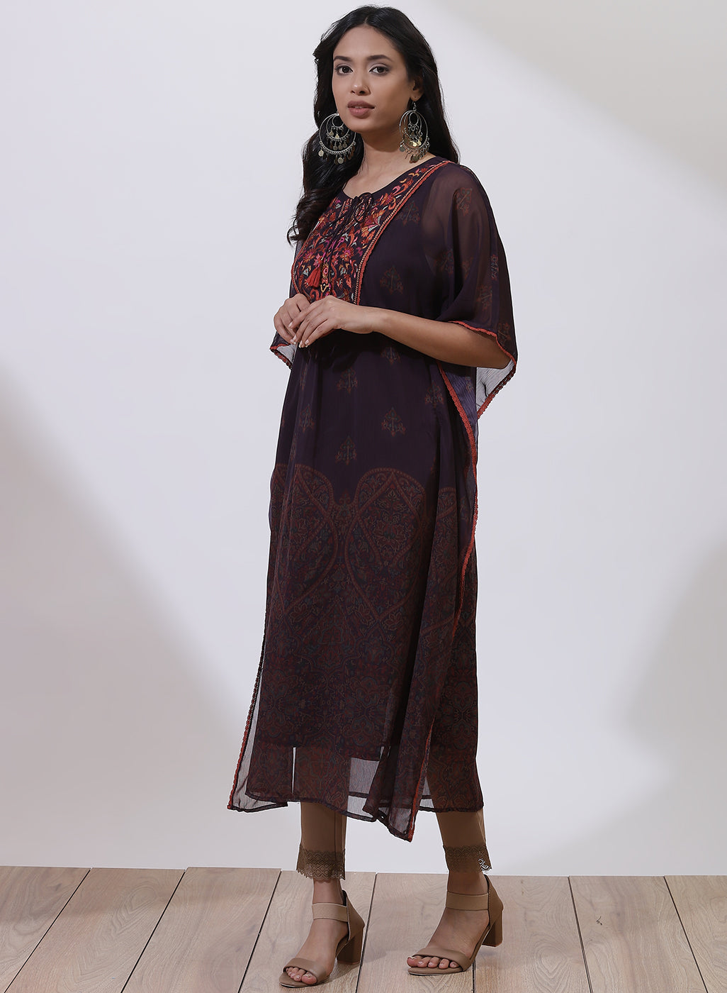 Add this deep purple embroidered kurta by Lakshita to your wardrobe featuring intricate embroidery around the neckline and kimono sleeves with floral motifs on the bodice. Pair this kurta with a pair of straight-legged or jeggings for a semi-formal look.