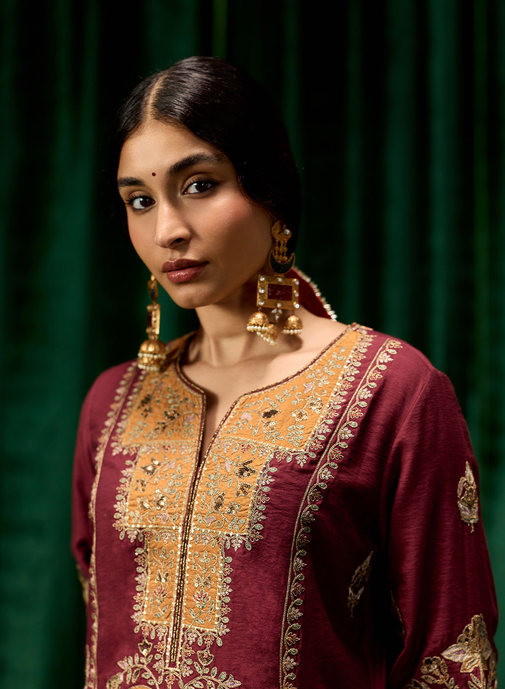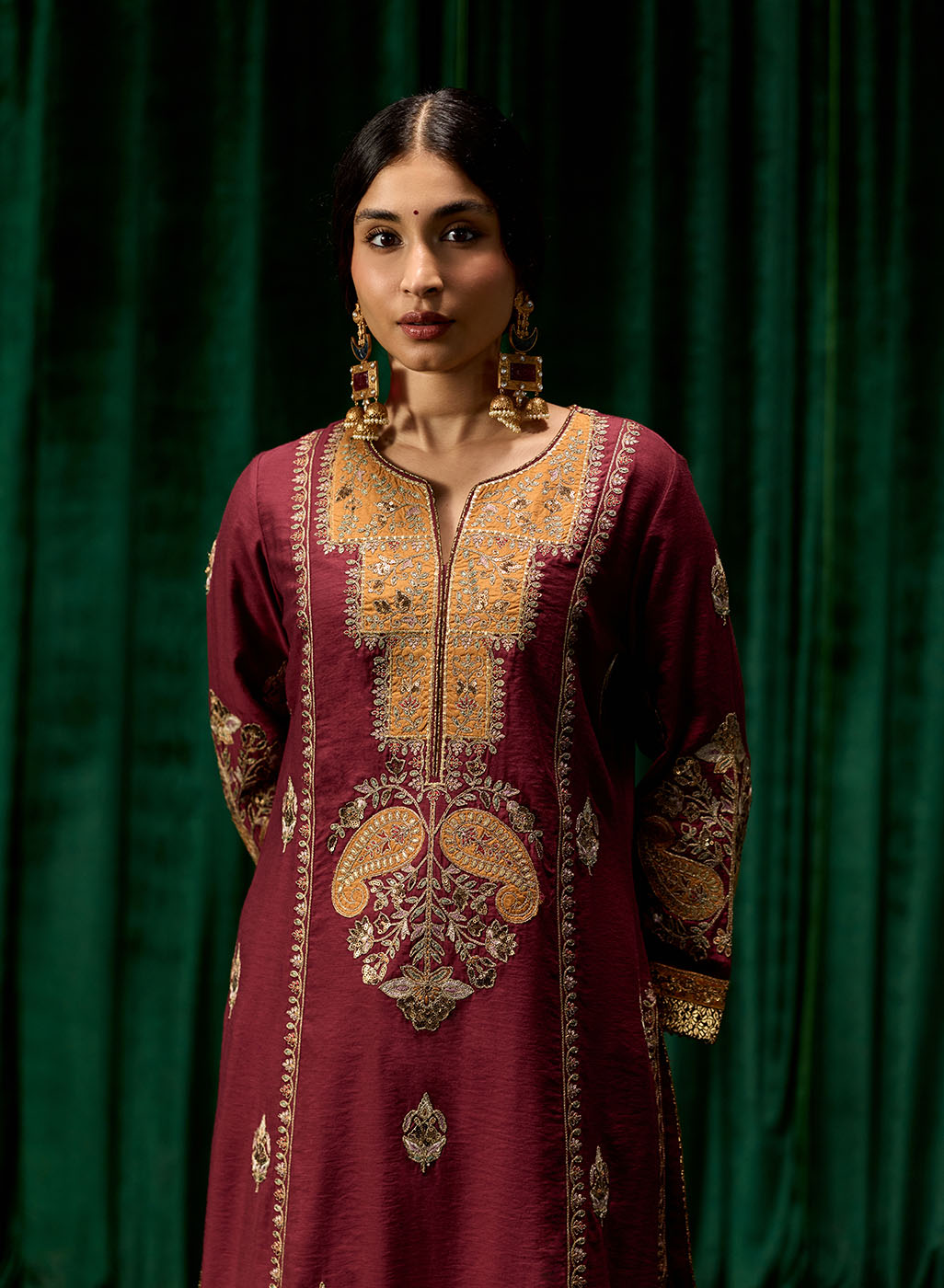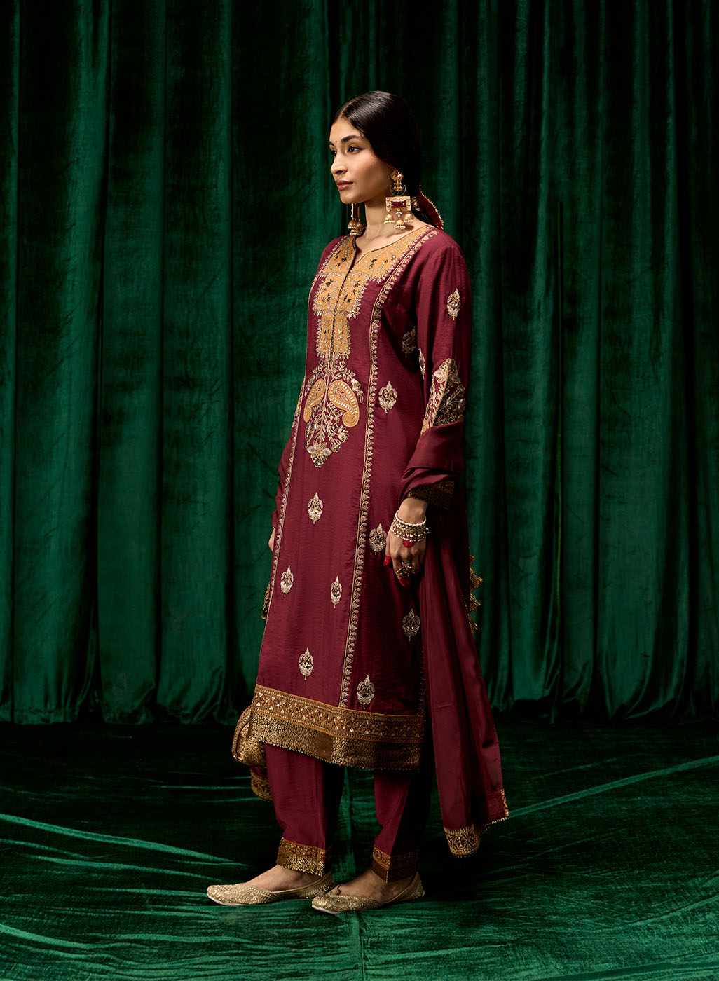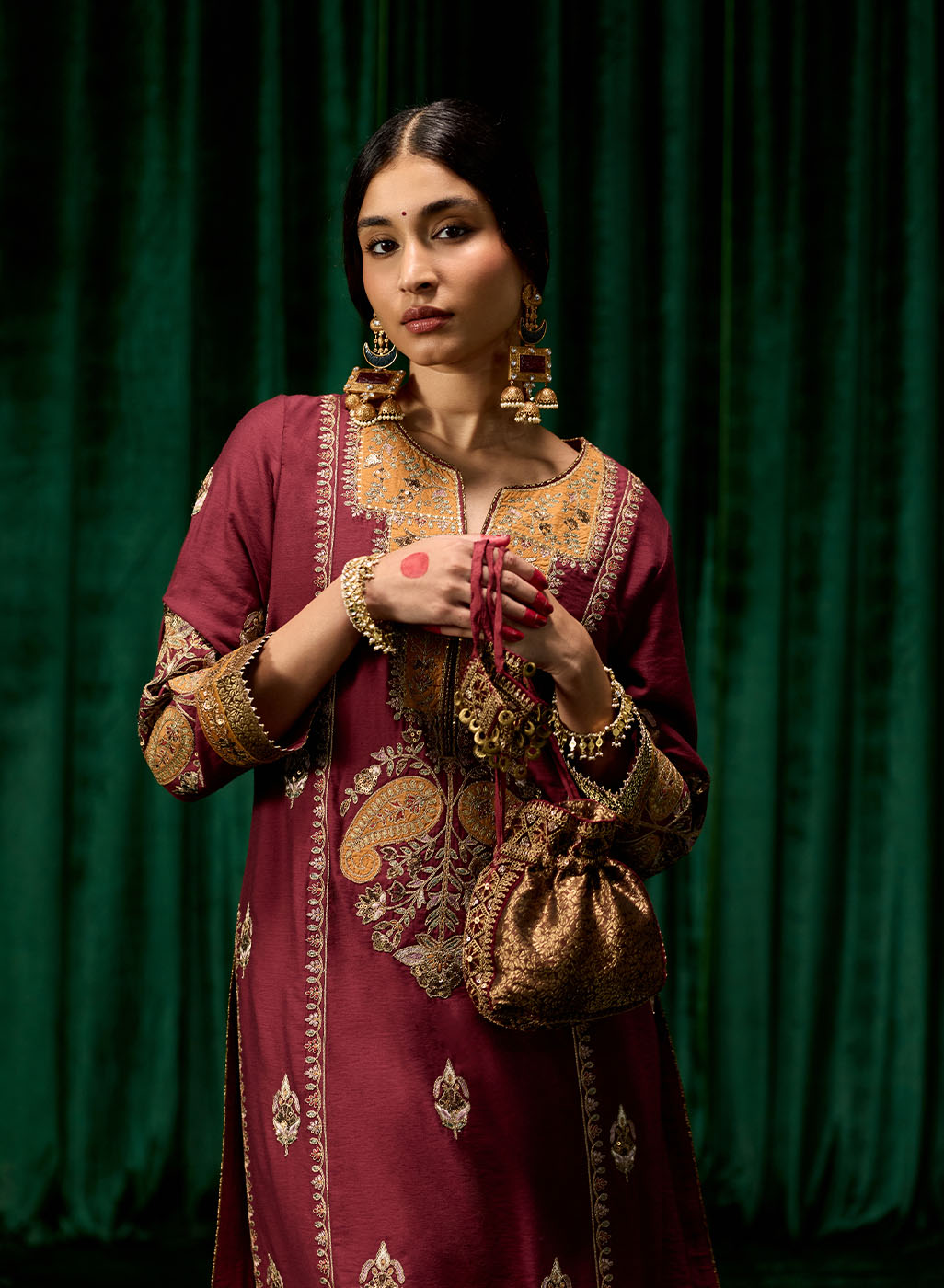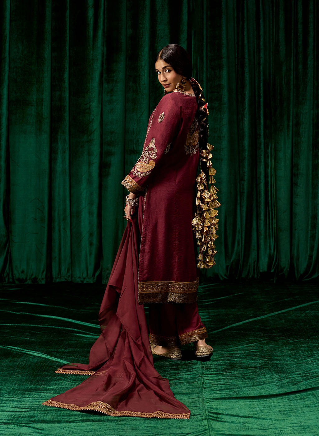 This rich maroon kurta set is a celebration of regal grandeur. The straight kurta comes alive with contrast appliqué motifs with fine zari and sequin work that shimmer like a soft prayer in light. A delicately notched neckline and scattered embroidery whisper tales of tradition passed down through generations. Paired with solid maroon bottoms, the set is completed by a dupatta framed in zari and a plush velvet border, evoking an heirloom grace, as if woven to be treasured beyond seasons. The ensemble comes with a brocade potli, adorned playful tassels, a finishing touch that ties the look in festive poetry.