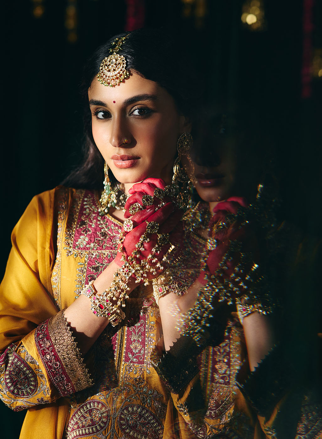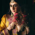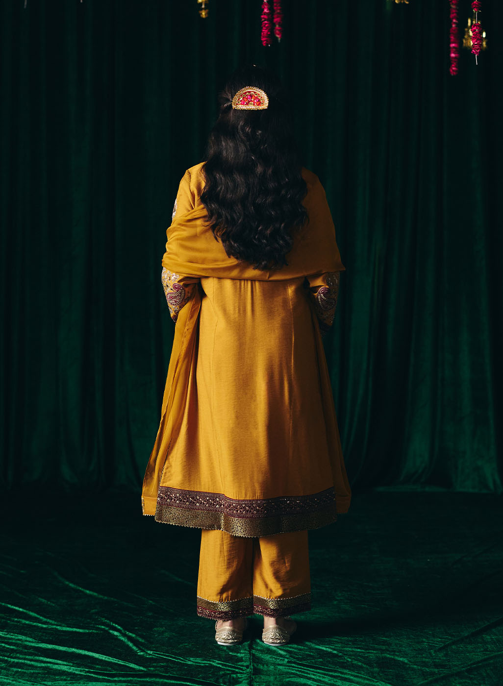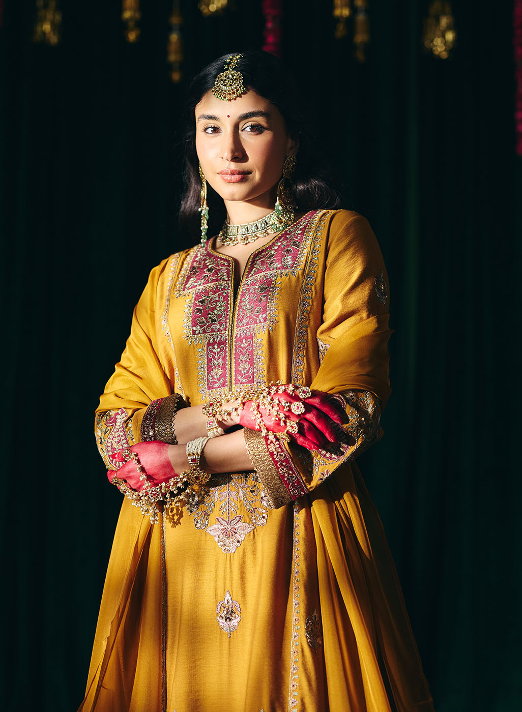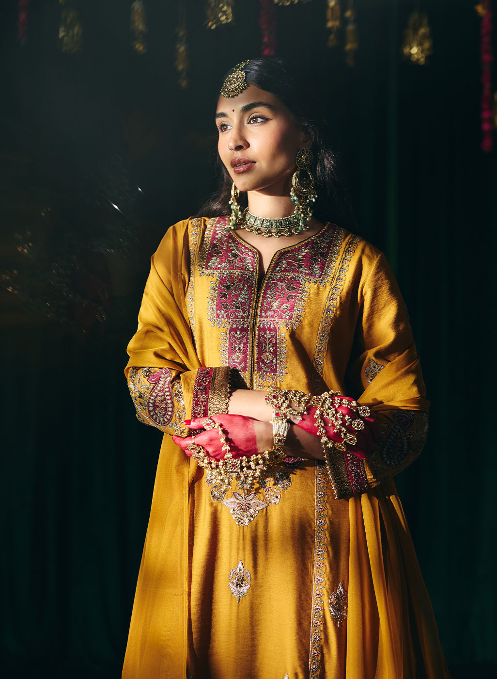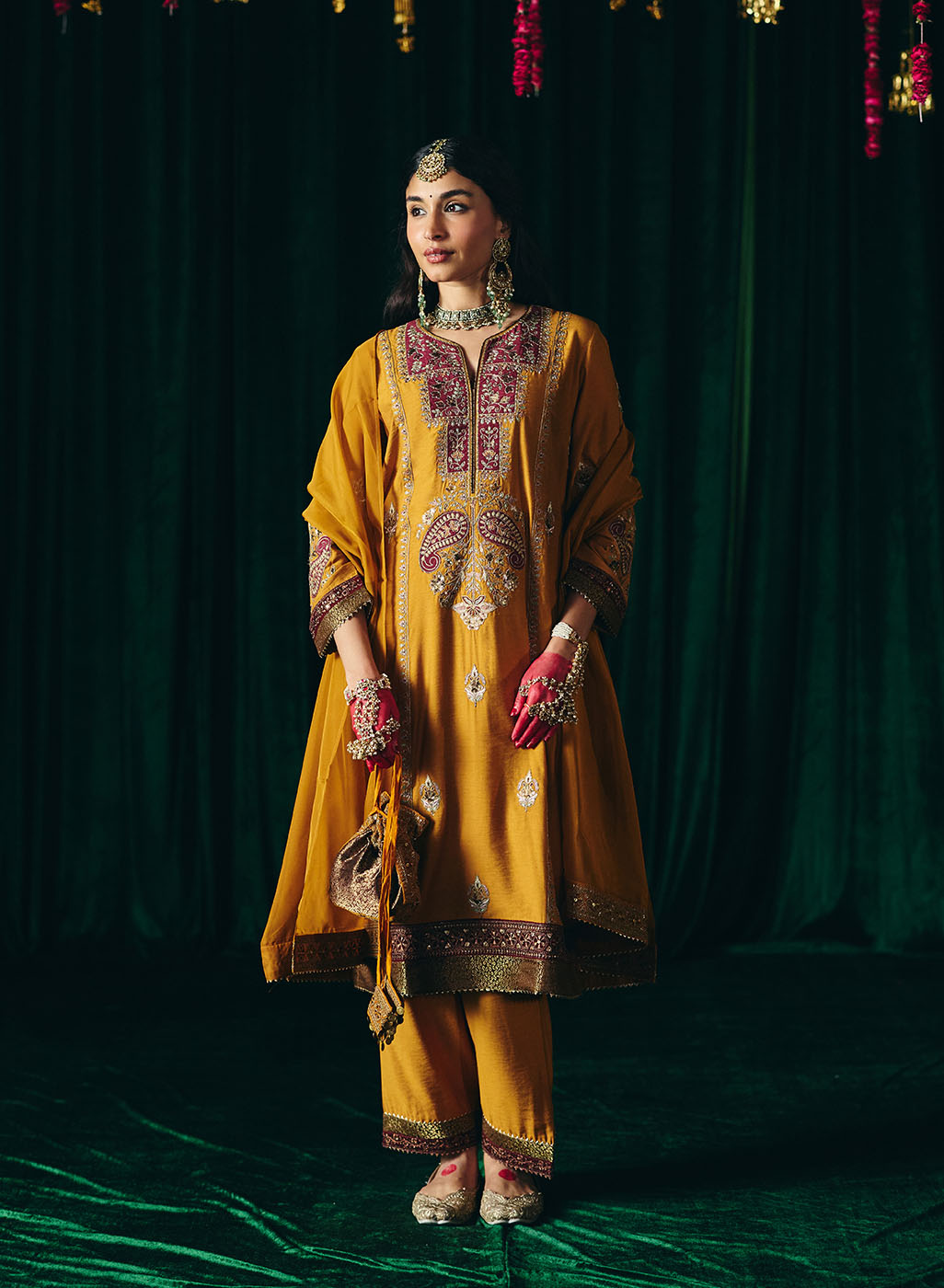 Radiant in mustard, this kurta set strikes the perfect balance of festive charm and artisanal detailing. The straight kurta features contrast applique motifs enhanced with intricate golden dori work, zari, resham, and sequin highlights that shimmer beautifully with every move. A graceful notched neckline and all-over dori buttis elevate its elegance. The straight bottoms come in a solid hue with delicate embroidery and lace at the hem, complementing the ornate kurta. Completing the set is a solid dupatta framed with a zari and sequin lace, further enriched with golden triangle gota edging and a plush velvet border—making it a true festive showstopper. To add a touch of heritage opulence, the set also includes a matching brocade potli embellished with zari lace and tassels.