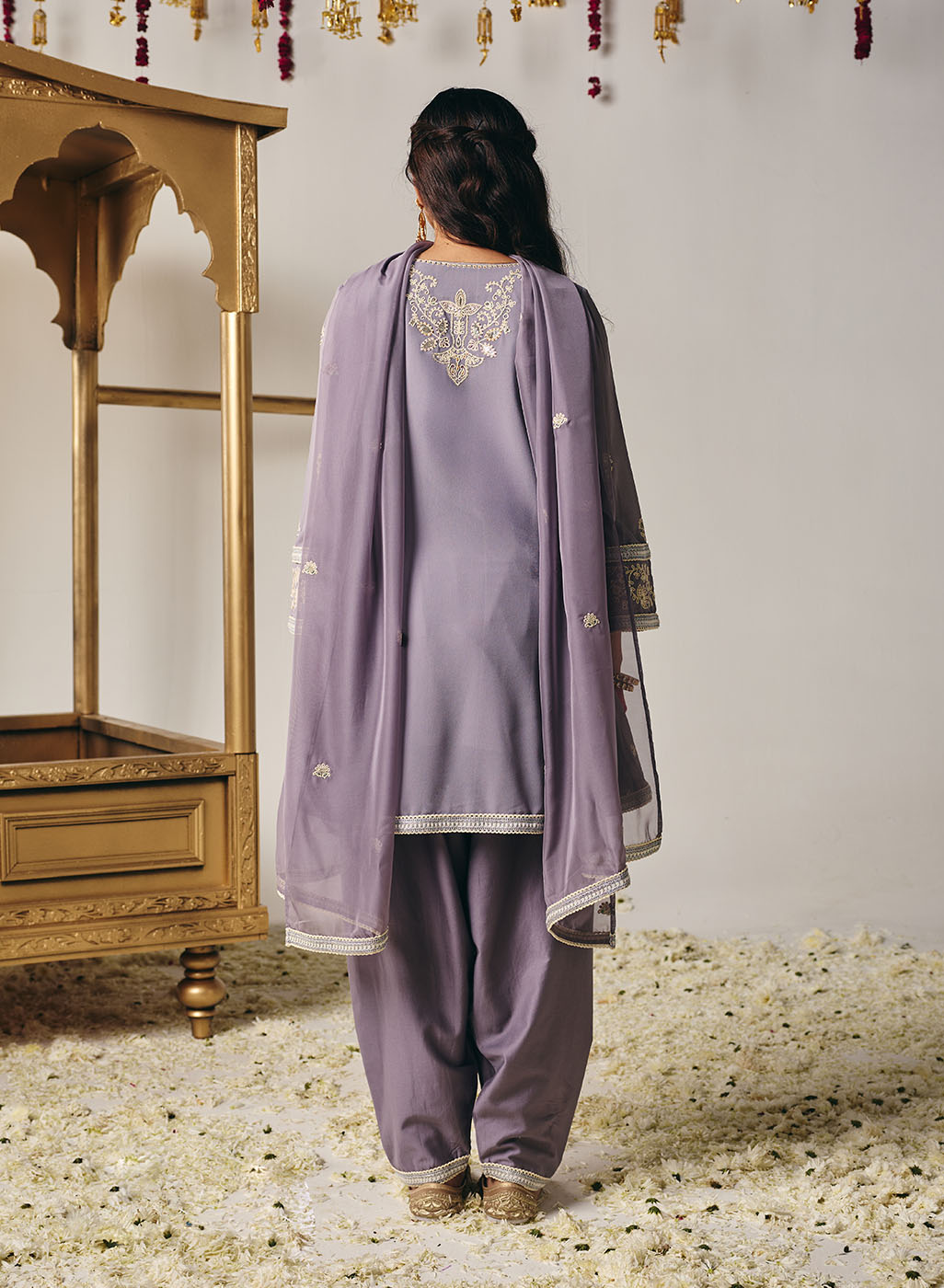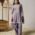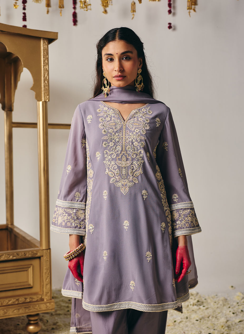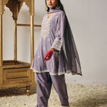 A celebration of charm and movement, this serene lavender kurta set brings a playful twist to elegance. The peplum-style A-line kurta flatters the form while adding a youthful flair, adorned with delicate dori embroidery enriched with resham and sequin highlights along the notched neckline. Paired with solid salwar bottoms finished with lace-edged hems and a breezy cotton dupatta adorned with embroidered buttis, the set is a perfect balance of sophistication and whimsy.