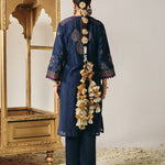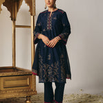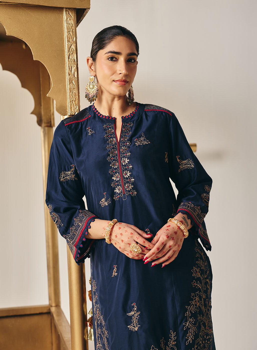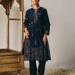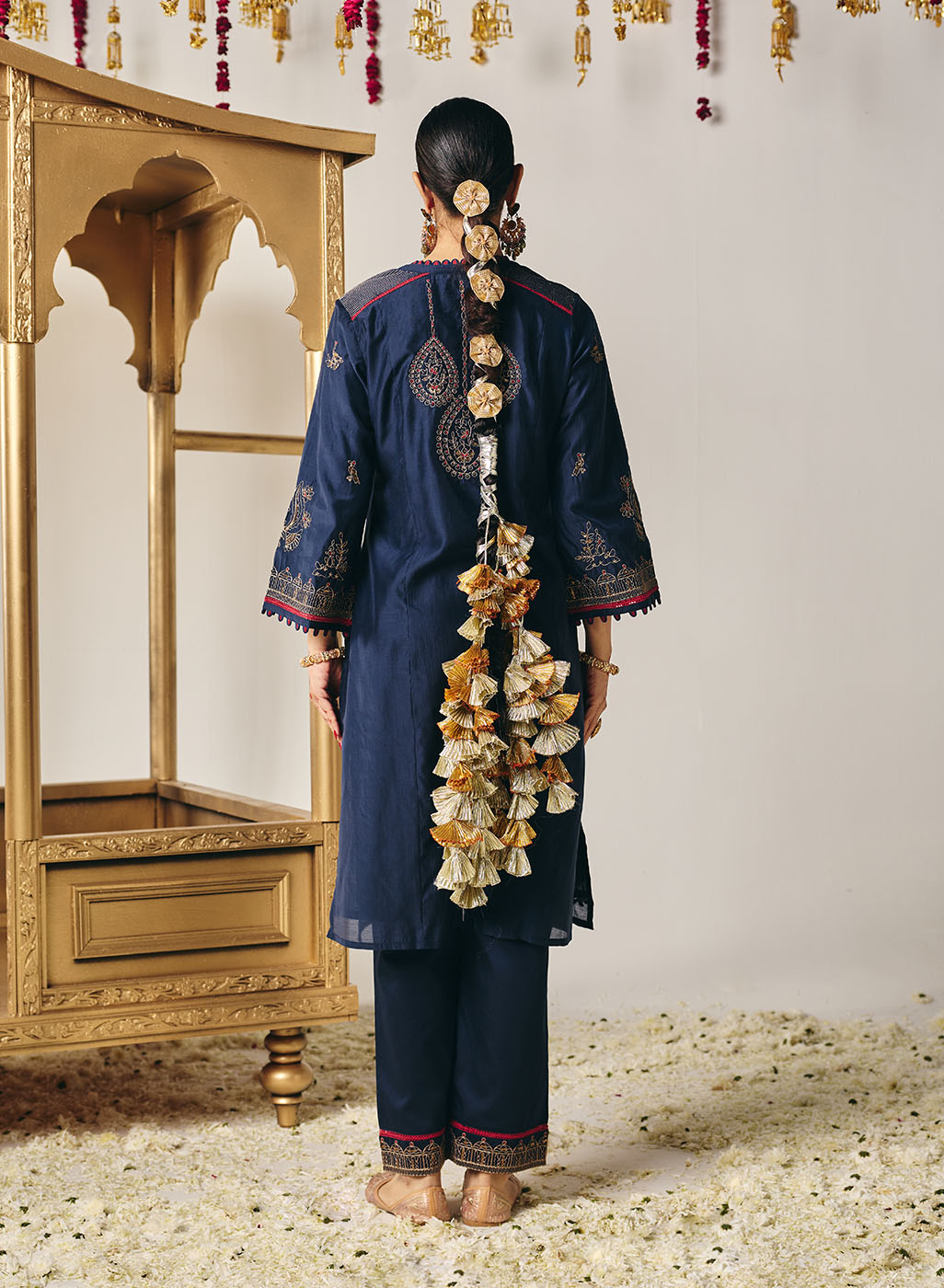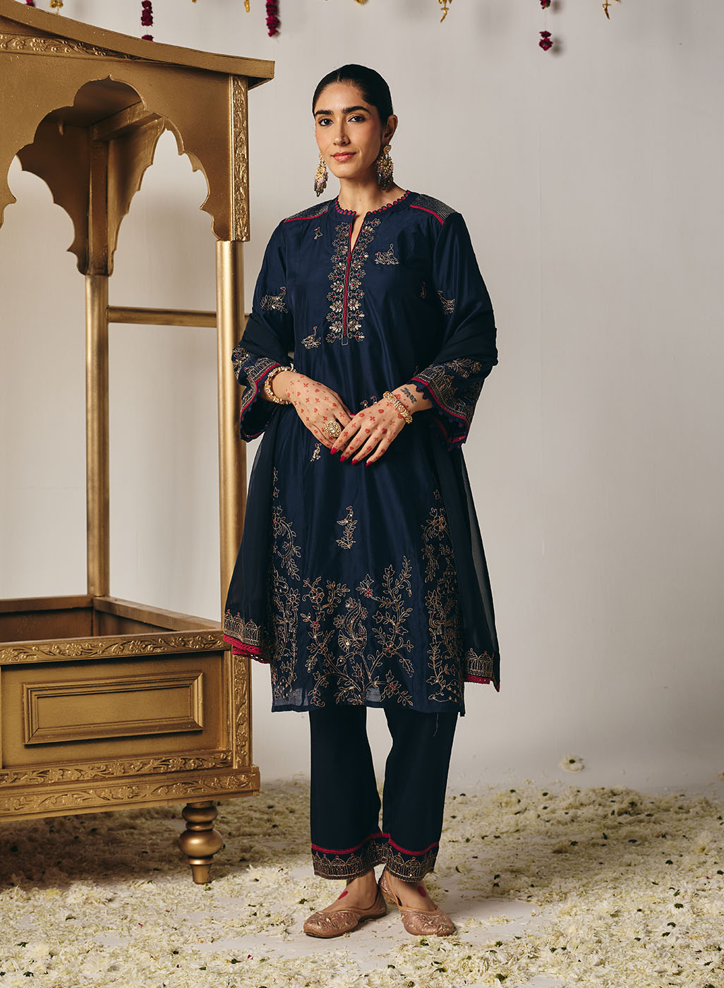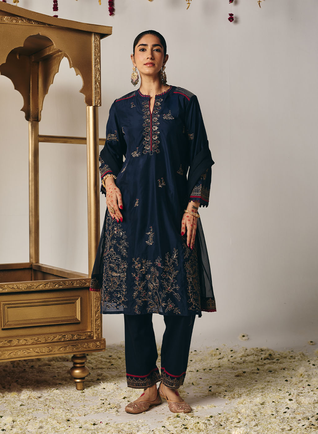 A timeless classic reimagined: this deep navy Chanderi kurta set is equal parts regal and refined. The rich base allows the dori embroidery, enhanced with sequin highlights, to gleam with striking contrast. Paired with clean straight pants and a lightweight organza dupatta edged in fine lace, it’s a celebration of understated luxury with a contemporary finish.