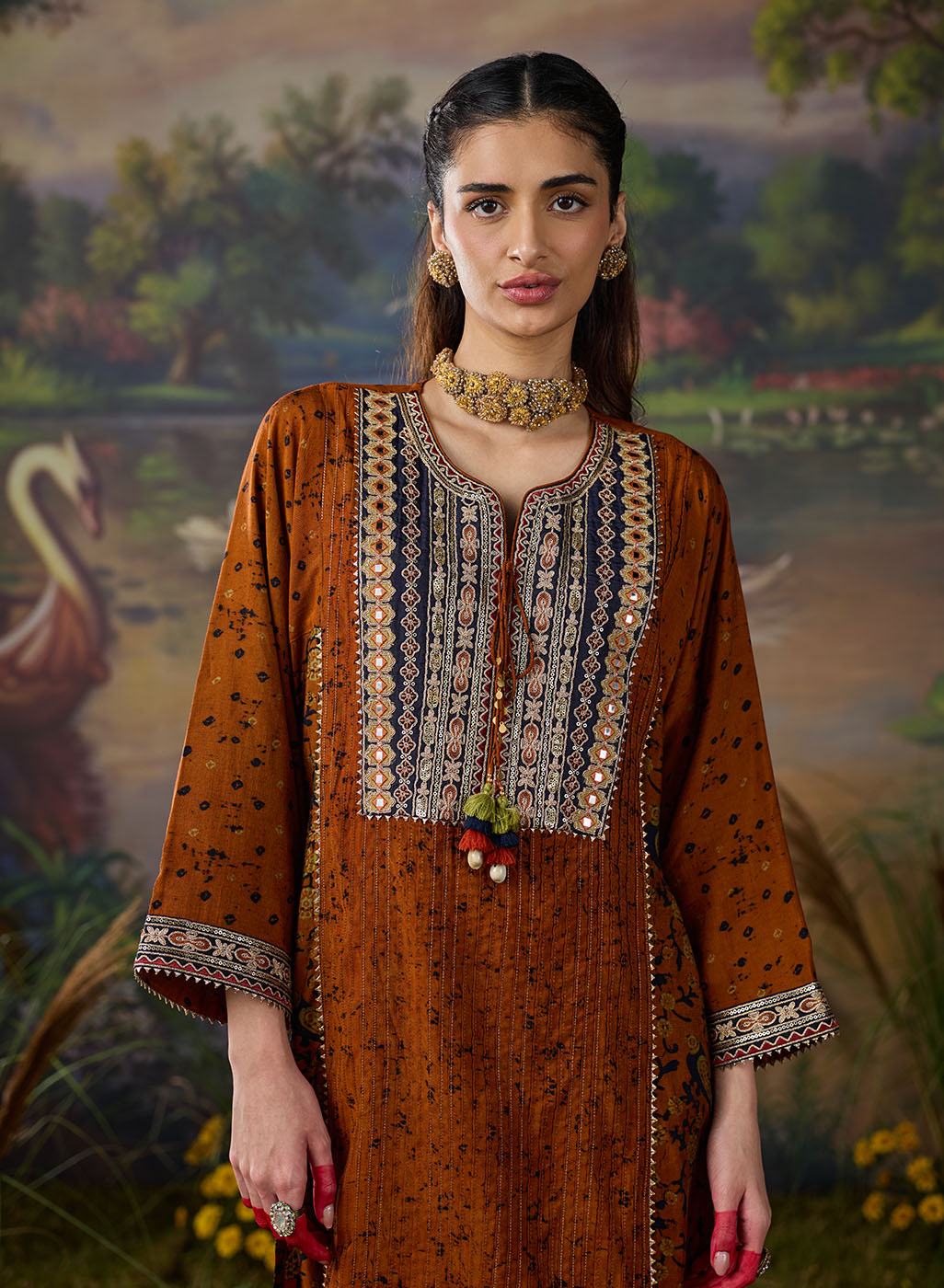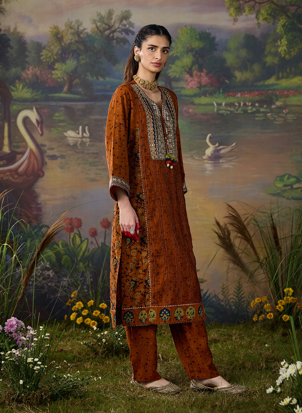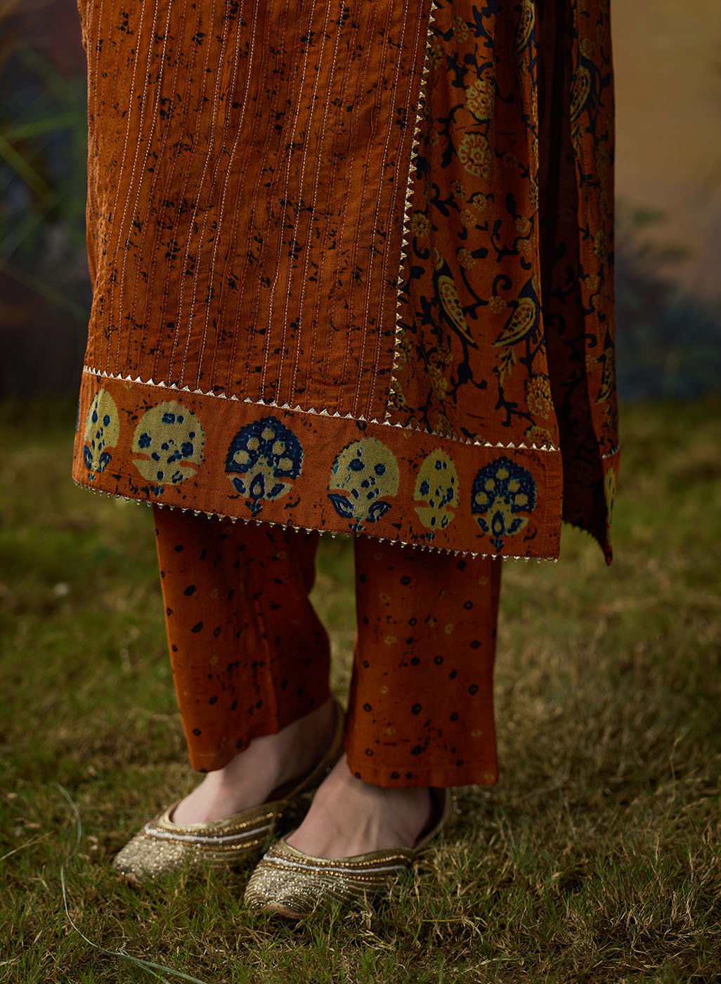 Drenched in a warm mustard hue, this kurta set blends traditional artistry with modern ease. The batik-inspired print flows across the silhouette, while dori embroidery with applique, sequins, and mirror accents bring luminous detail to the neckline and sleeve hems. Paired with straight printed bottoms and a breezy chiffon dupatta edged with gota lace, it strikes a perfect balance of craft and comfort.
