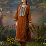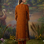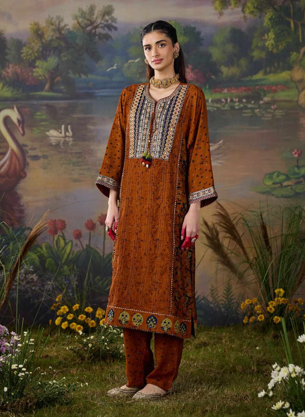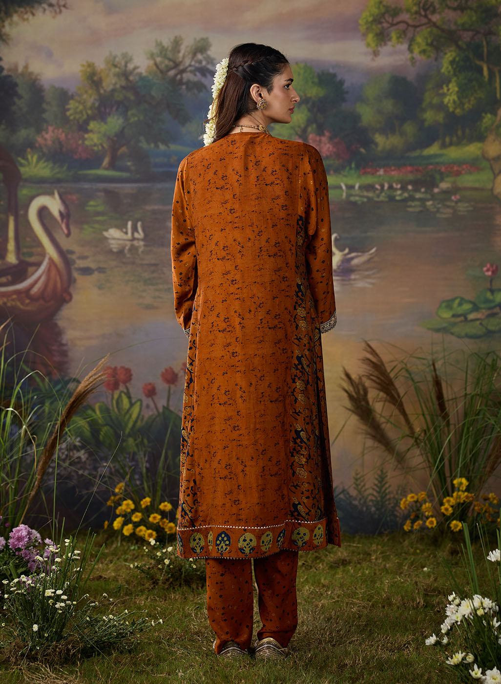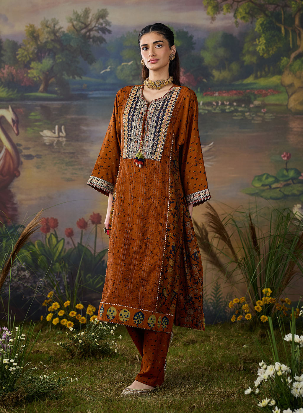 Drenched in a warm mustard hue, this kurta set blends traditional artistry with modern ease. The batik-inspired print flows across the silhouette, while dori embroidery with applique, sequins, and mirror accents bring luminous detail to the neckline and sleeve hems. Paired with straight printed bottoms and a breezy chiffon dupatta edged with gota lace, it strikes a perfect balance of craft and comfort.