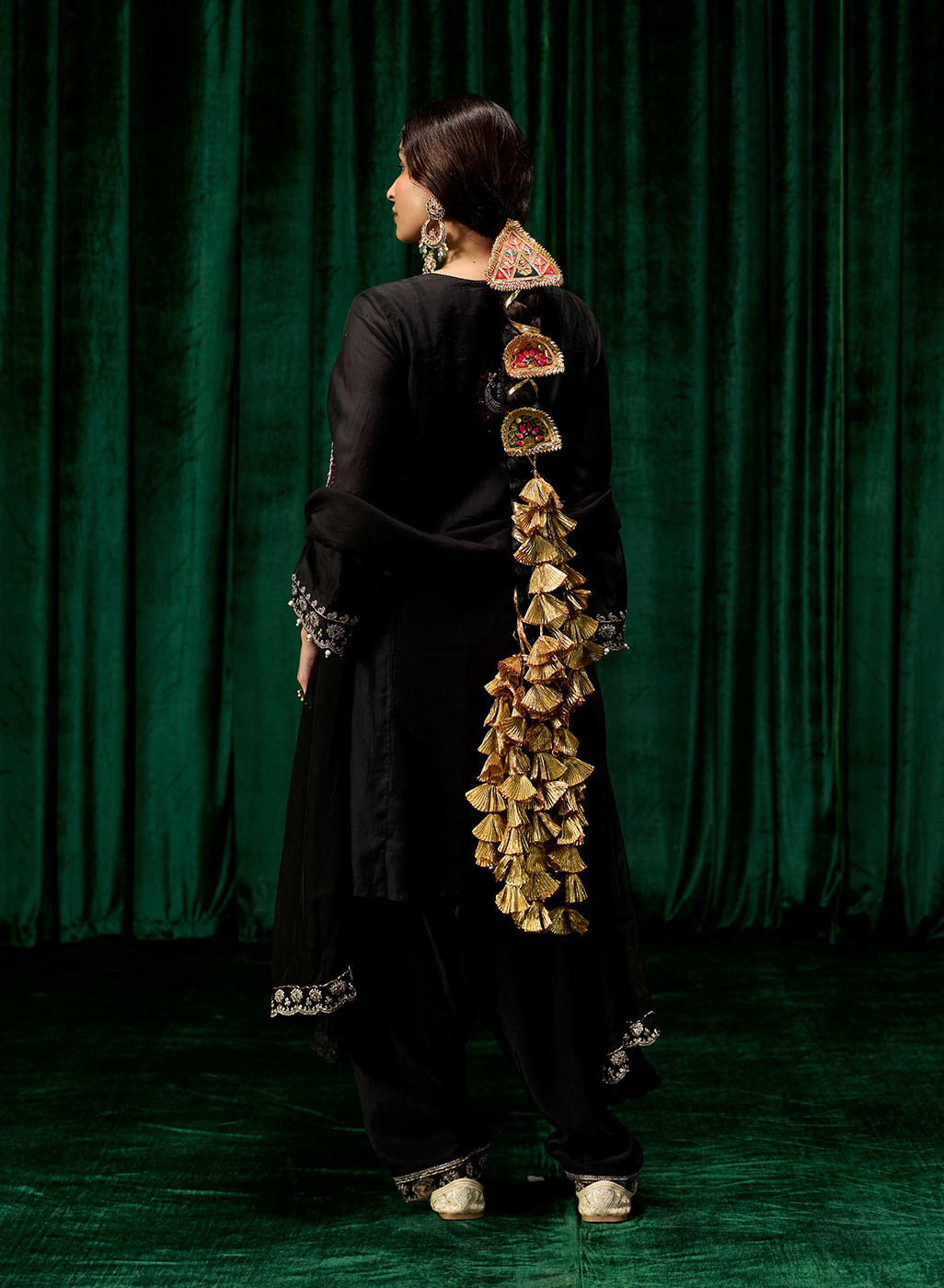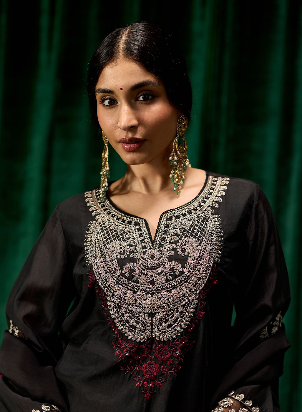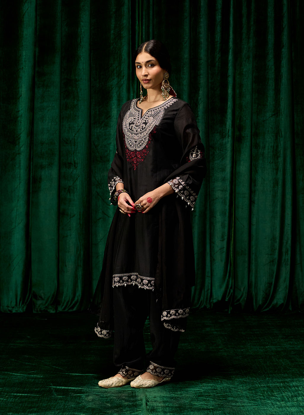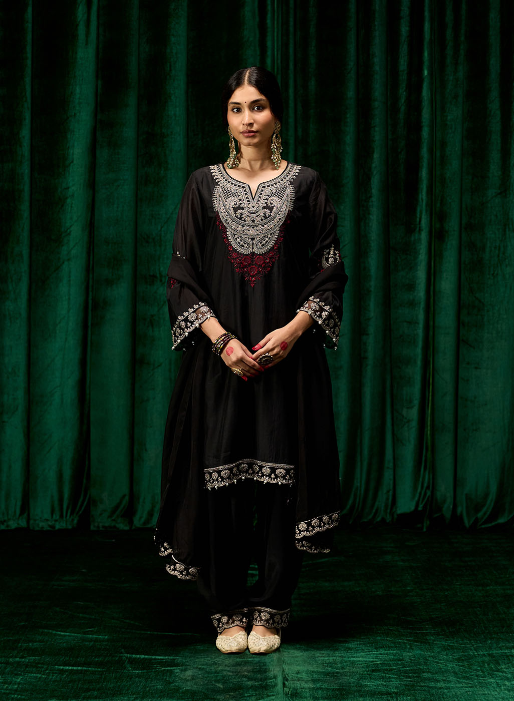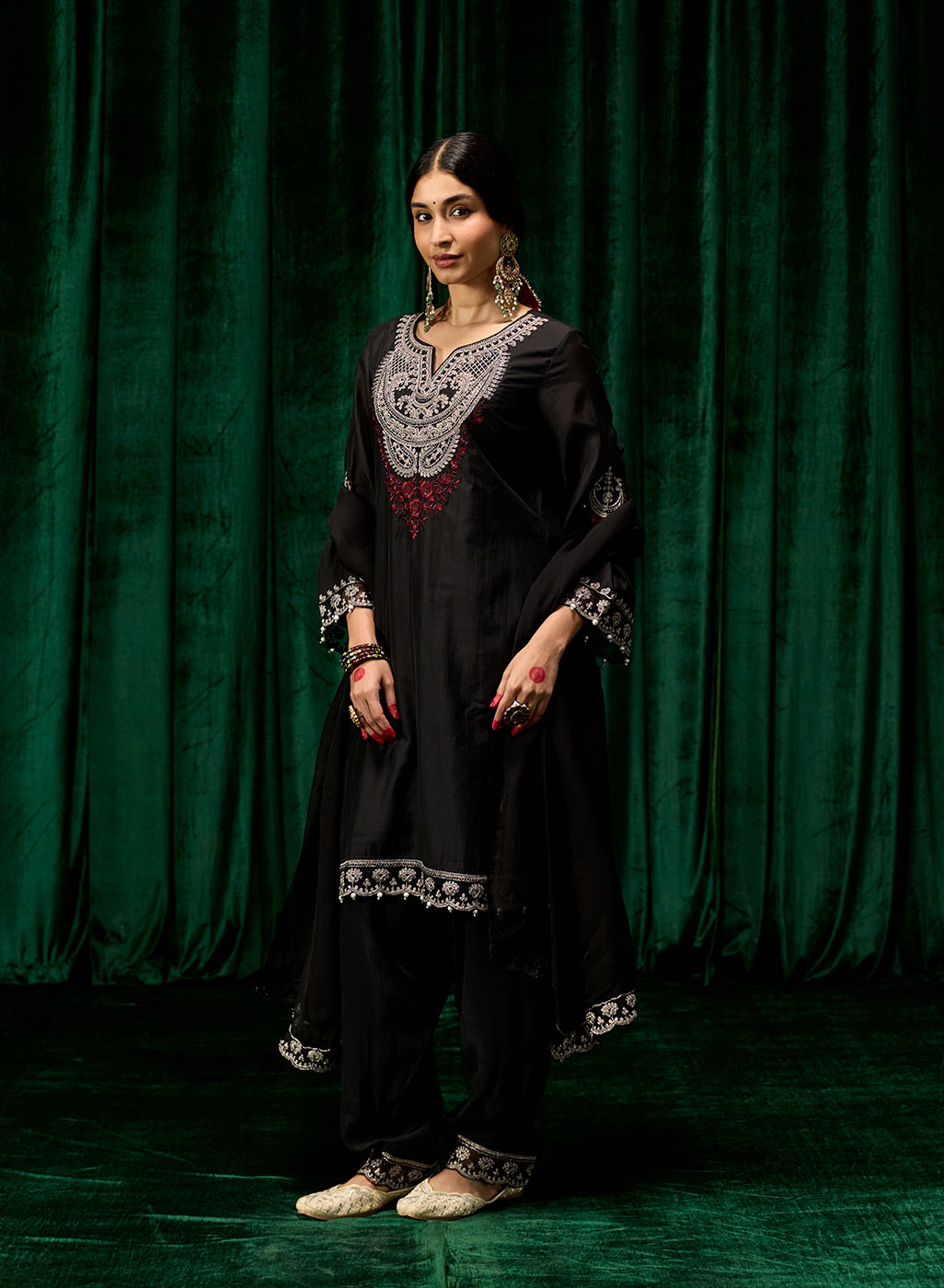 Style Tip: Pair this set with silver jhumkas and embellished juttis for a regal yet grounded festive look. Add a bold lip for an evening statement.
