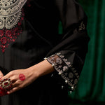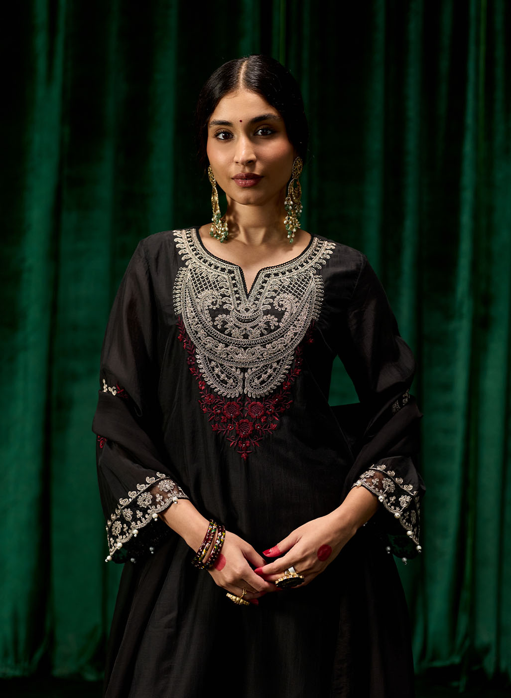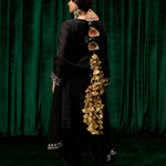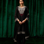 The classic black canvas meets intricate silver zari and resham embroidery, in a piece that balances understated elegance with festive grandeur. The inherent sheen of chanderi fabric adds a subtle glow, while sequin and pearl highlights elevate the embroidery into a statement of refined opulence. Finished with scalloped hems, organza accents, and pearl hangings, this set is perfect for evenings that call for effortless sophistication.