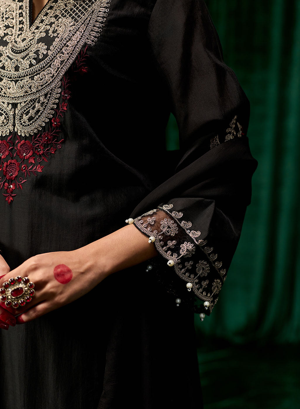 • Zari & resham embroidery on neck, sleeves, hem, and back with sequin and pearl accents