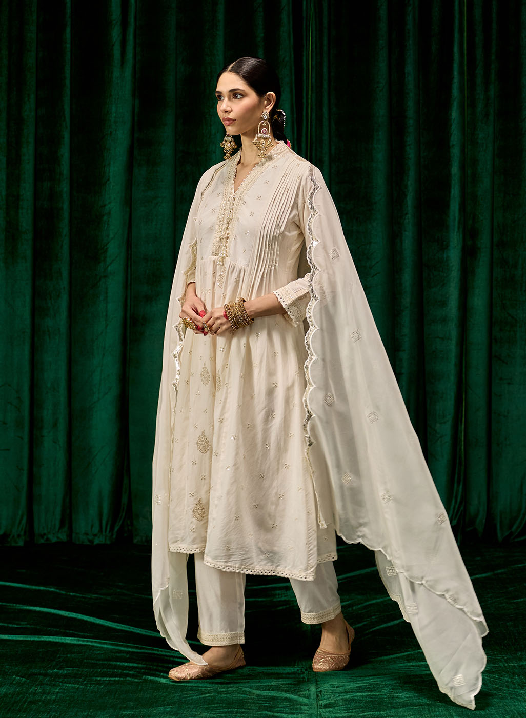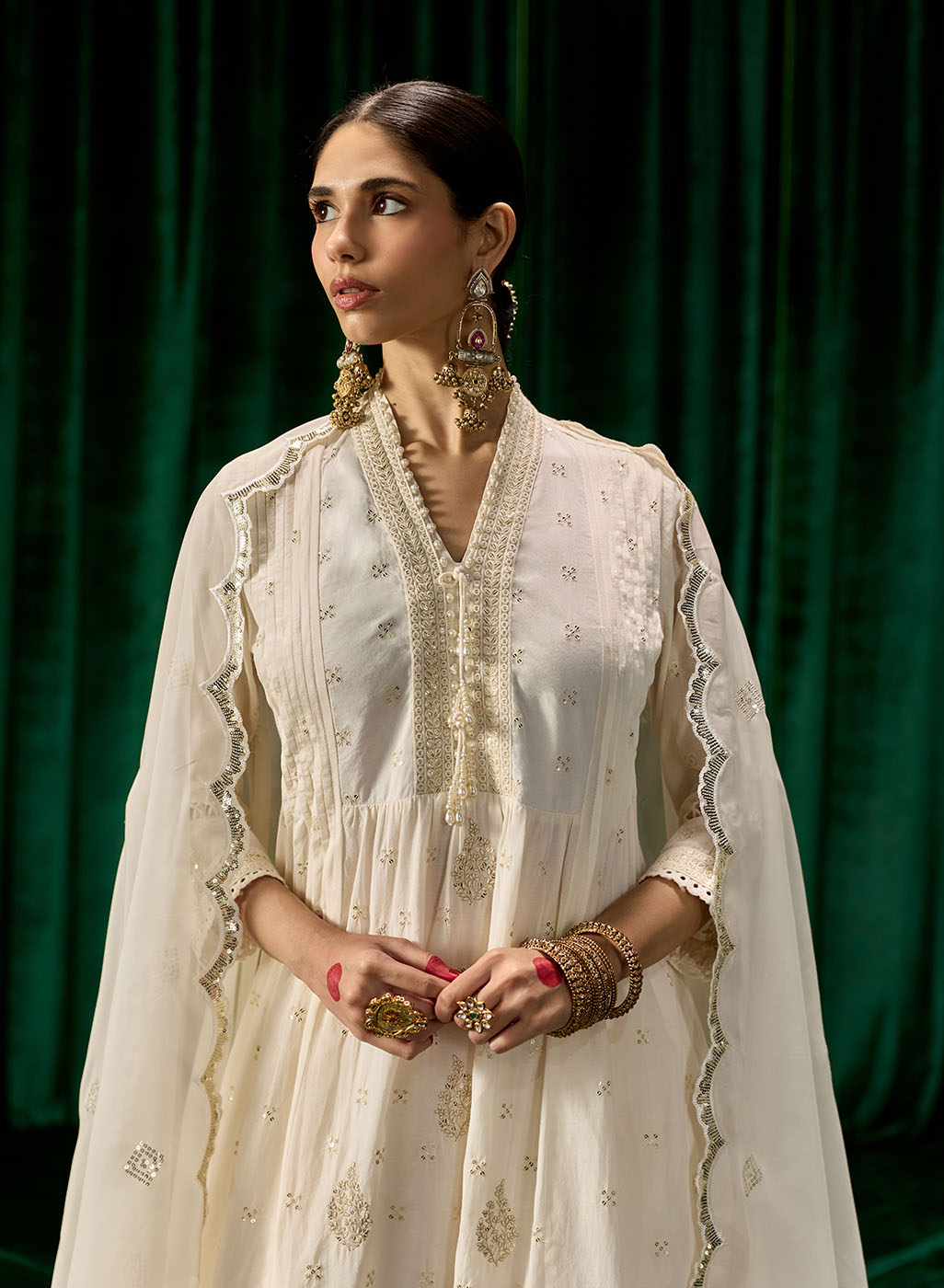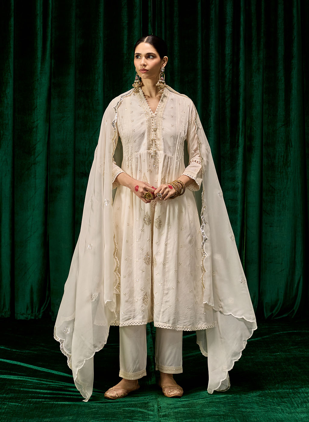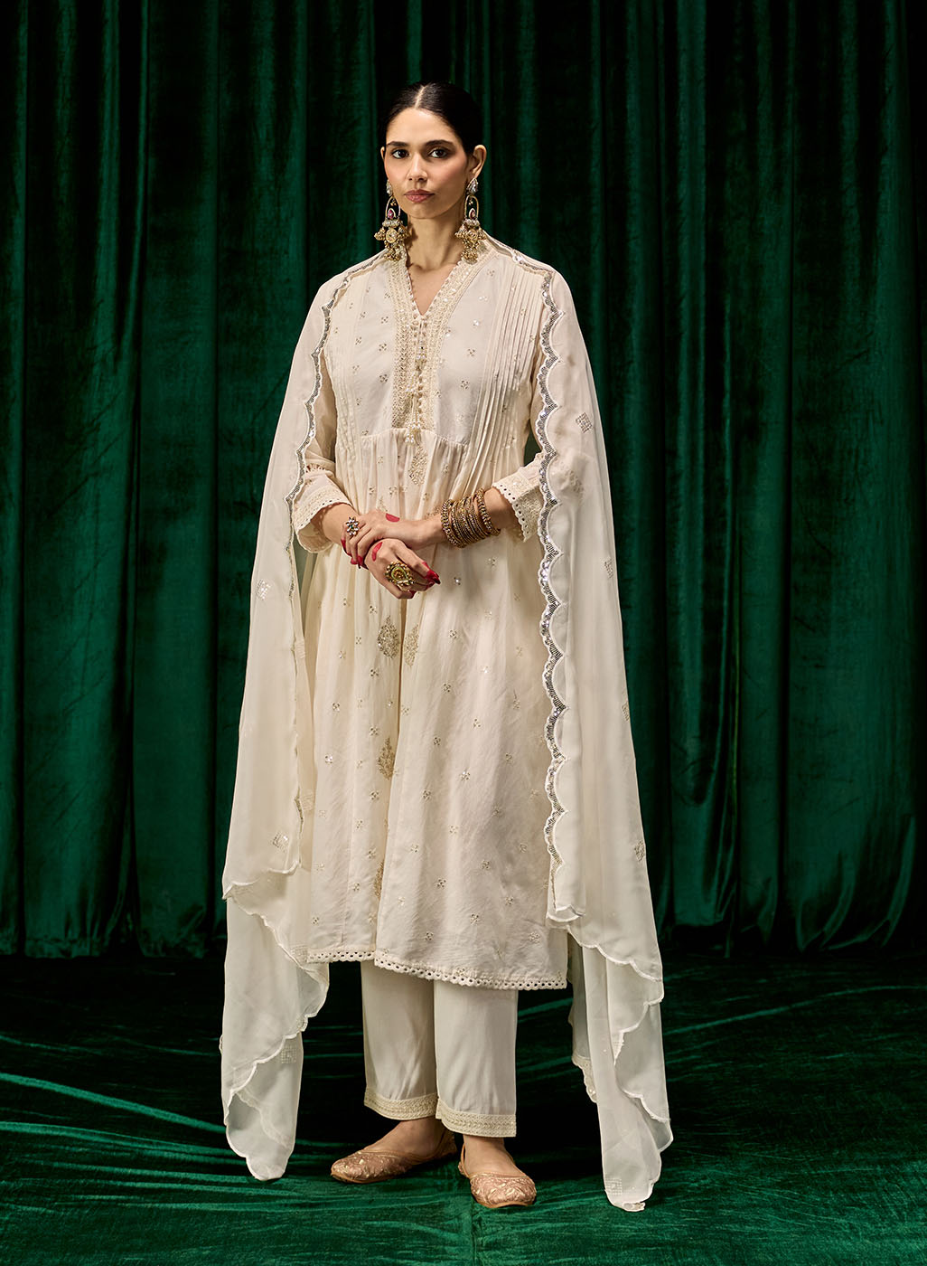 Ethereal and timeless, this ivory kurta set blends detailed embroidery with delicate sparkle. The A-line silhouette features all-over thread work with sequin highlights, a pearl-detailed neckline with kodi lace, and pleated princess panels for graceful structure. Finished with embroidered hems and a sheer organza dupatta with scalloped lace, this look is the perfect balance of simplicity and elegance.