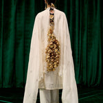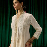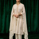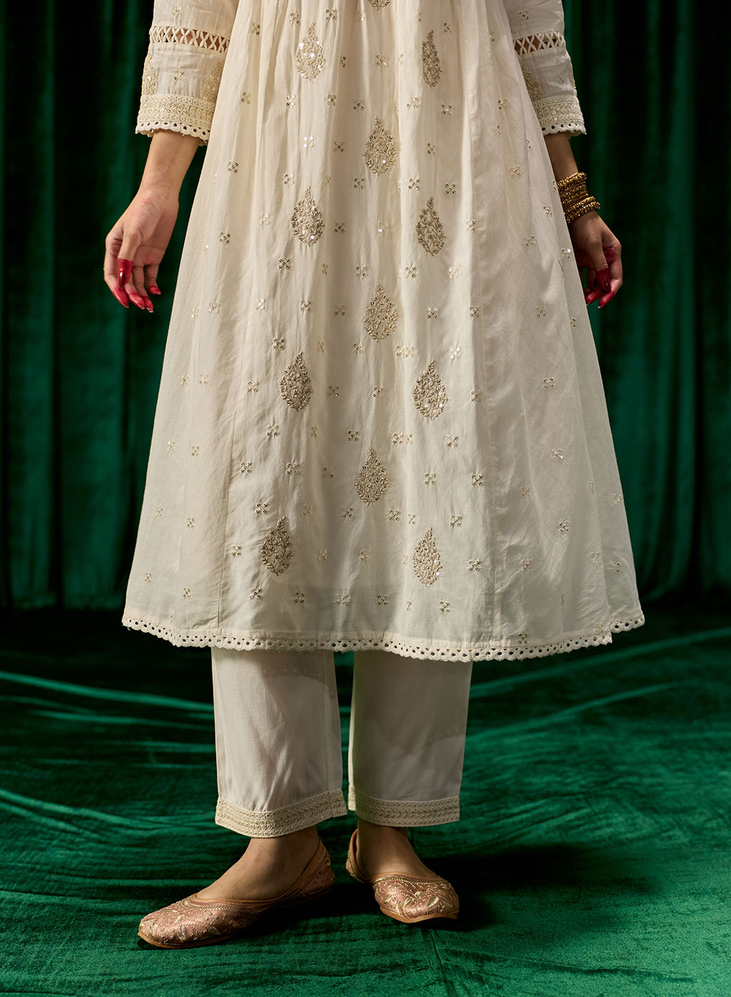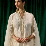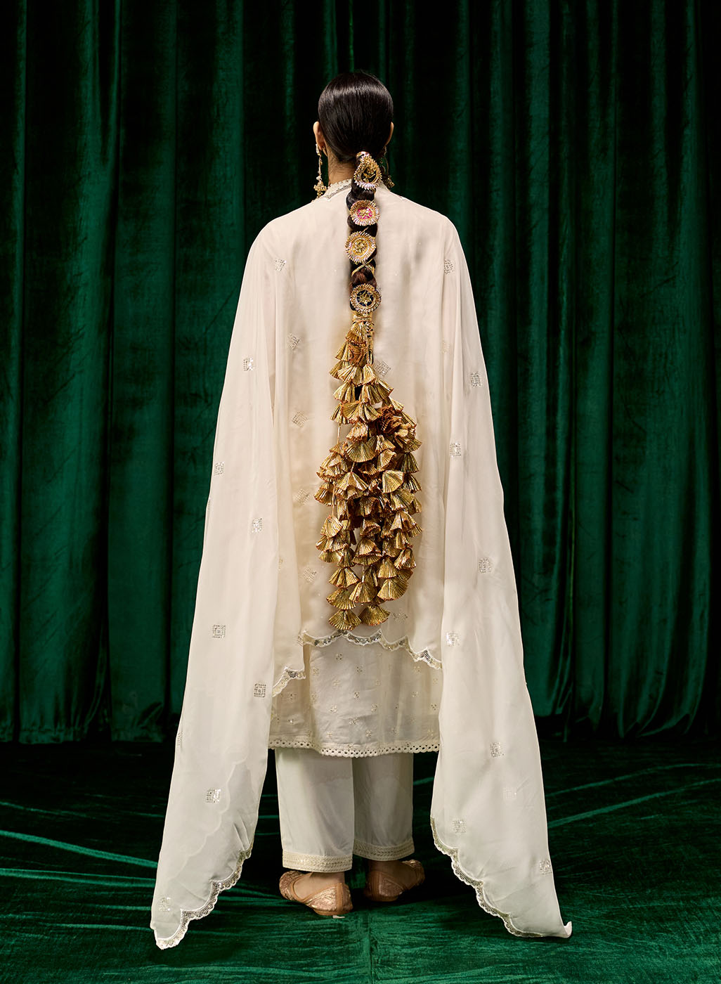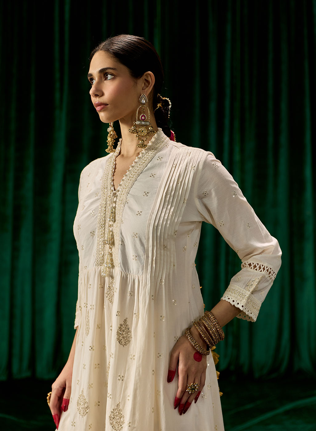 Ethereal and timeless, this ivory kurta set blends detailed embroidery with delicate sparkle. The A-line silhouette features all-over thread work with sequin highlights, a pearl-detailed neckline with kodi lace, and pleated princess panels for graceful structure. Finished with embroidered hems and a sheer organza dupatta with scalloped lace, this look is the perfect balance of simplicity and elegance.