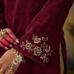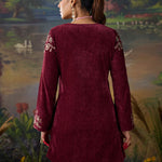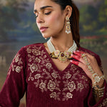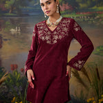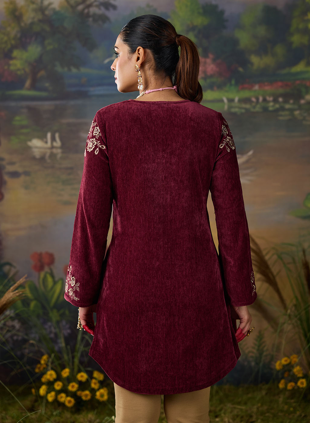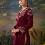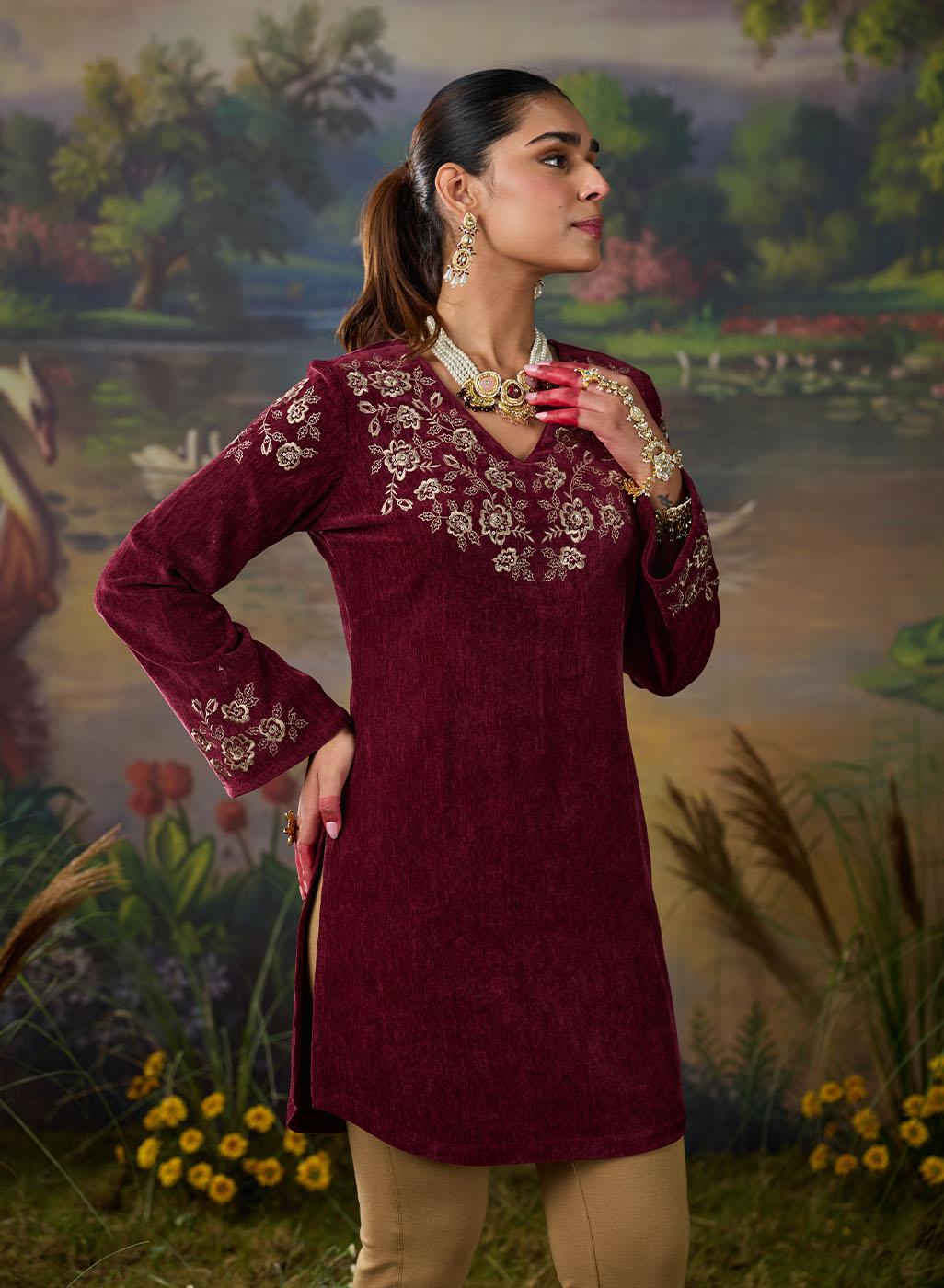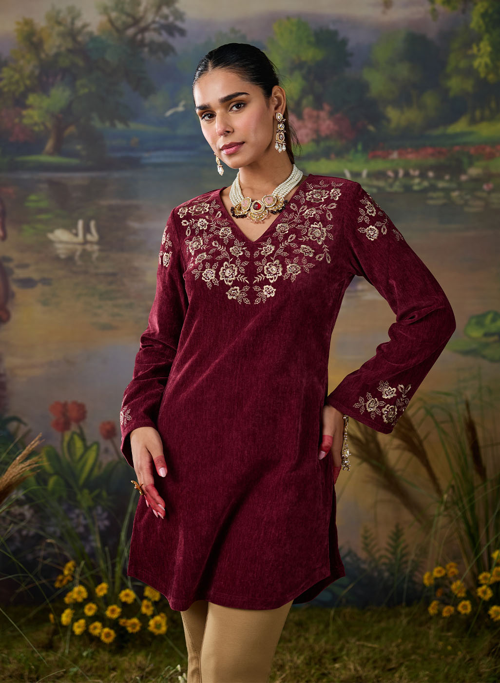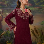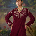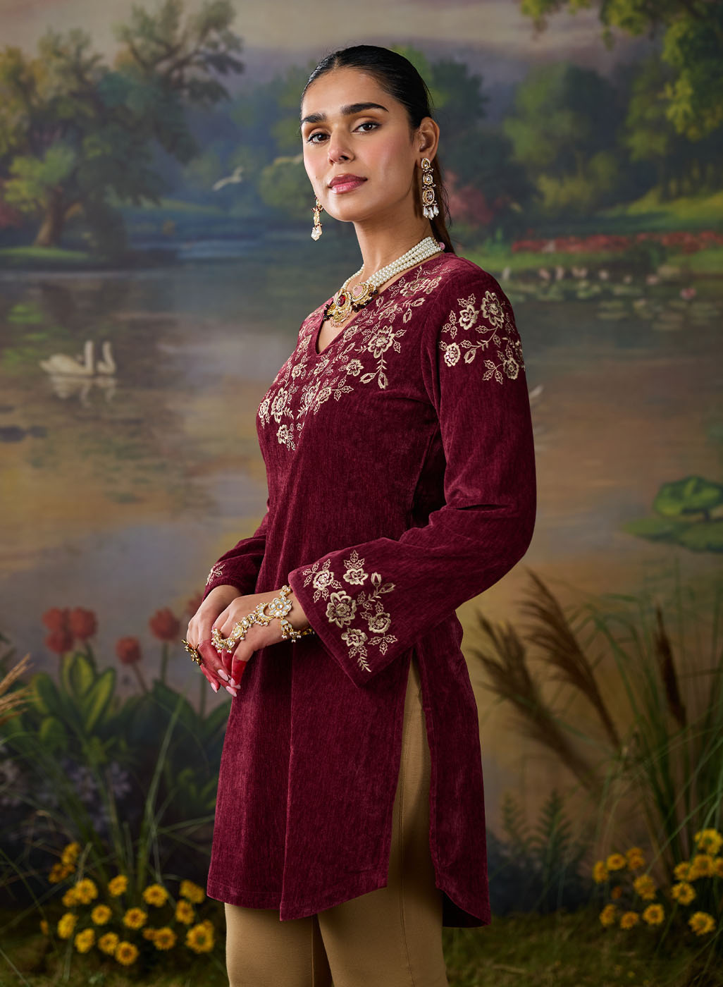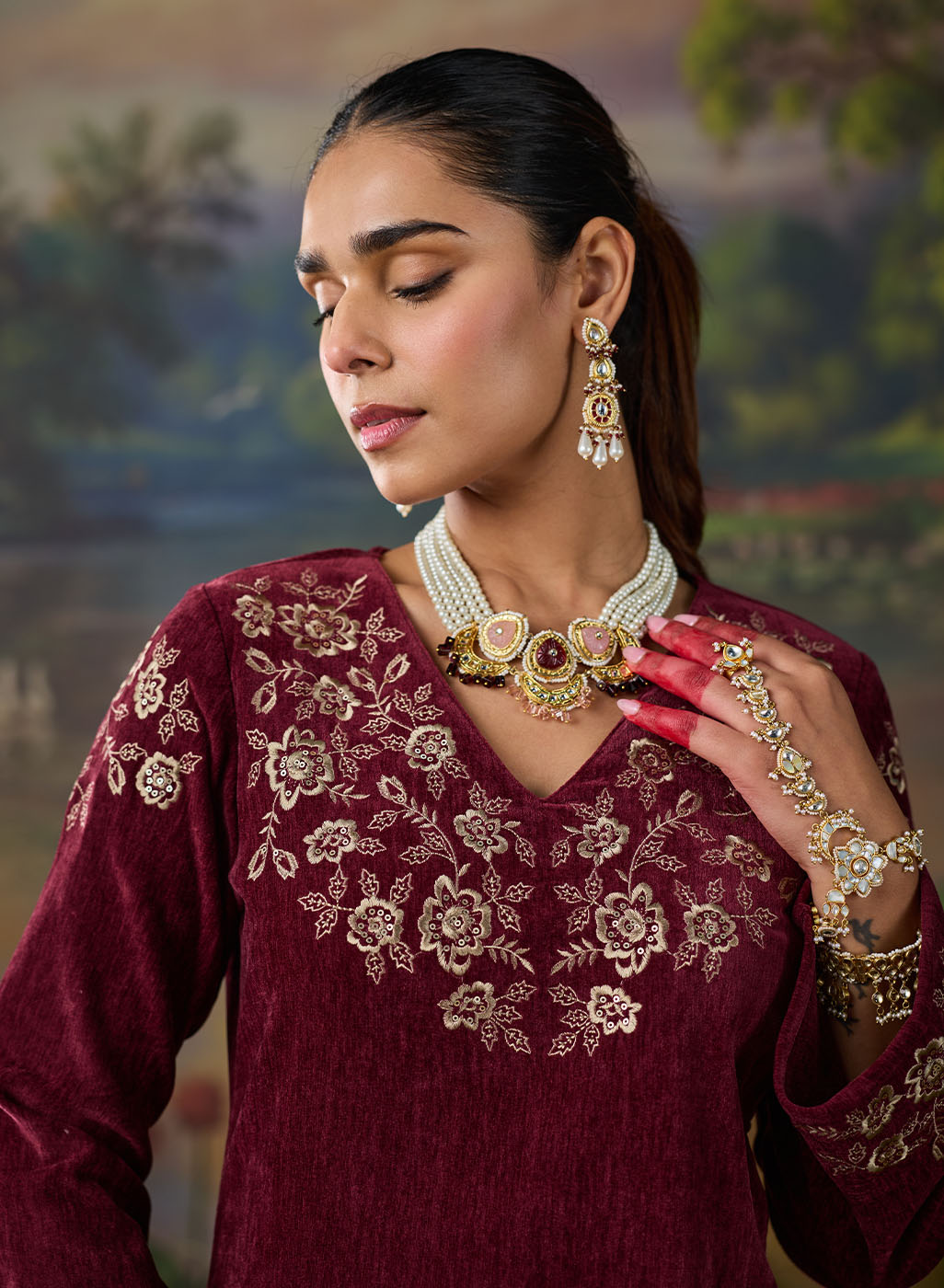 Wrapped in the richness of maroon velvet, this kurta is a celebration of quiet luxury. The soft, warm fabric shimmers with a natural sheen, while delicate resham embroidery with sequin highlights adds just the right touch of festive sparkle. With its flattering V-neckline and graceful bell sleeves, it blends timeless elegance with contemporary charm.