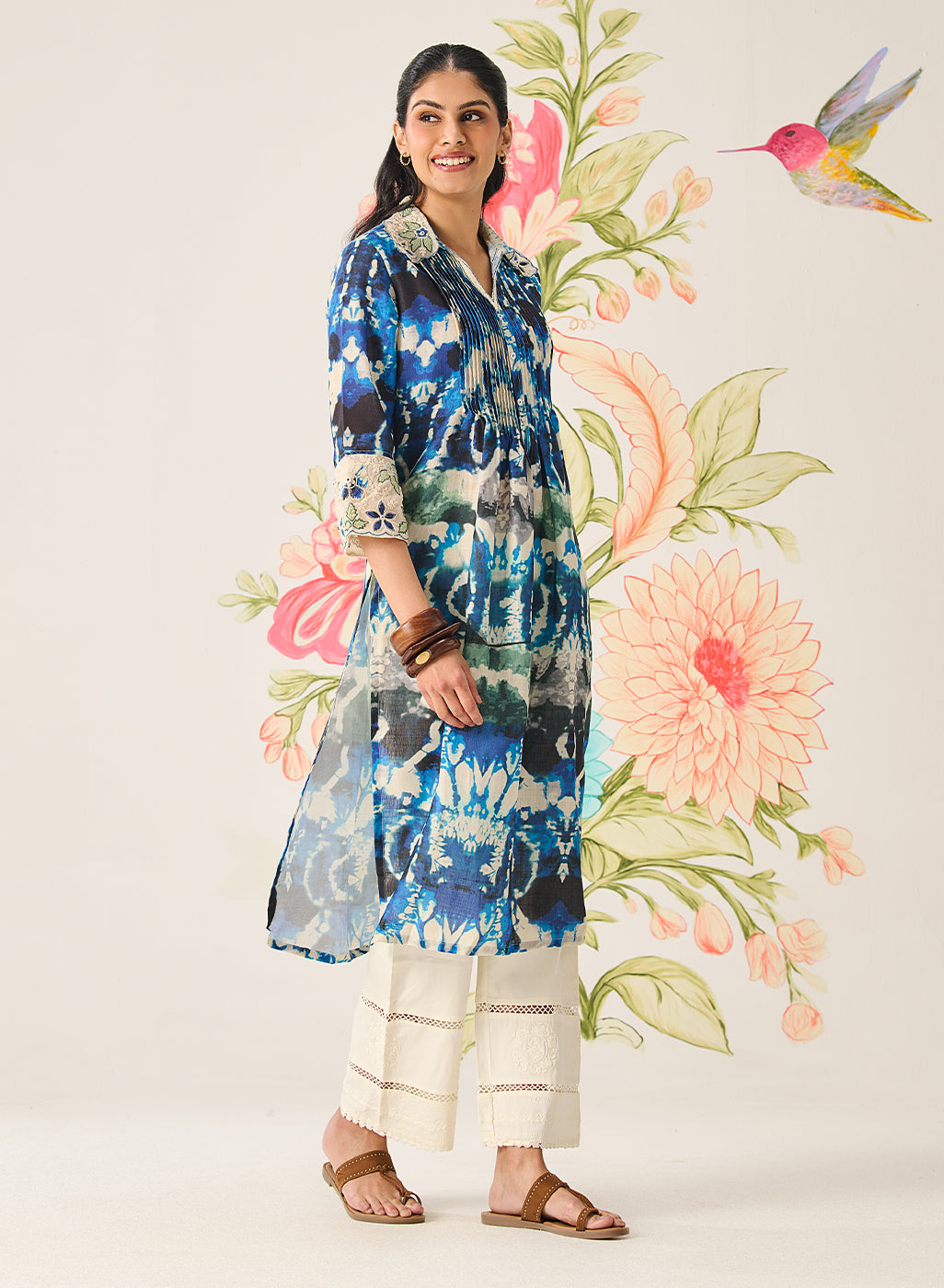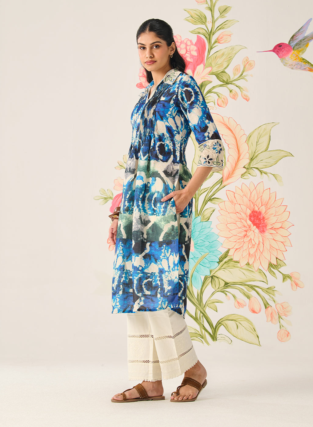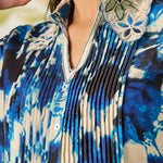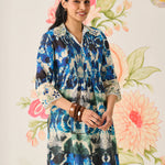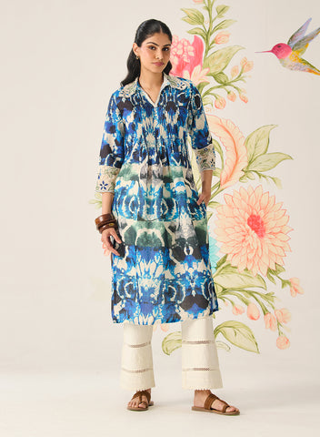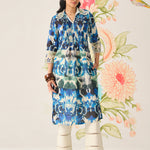 Zahra Blue Printed A-line Linen Kurta
