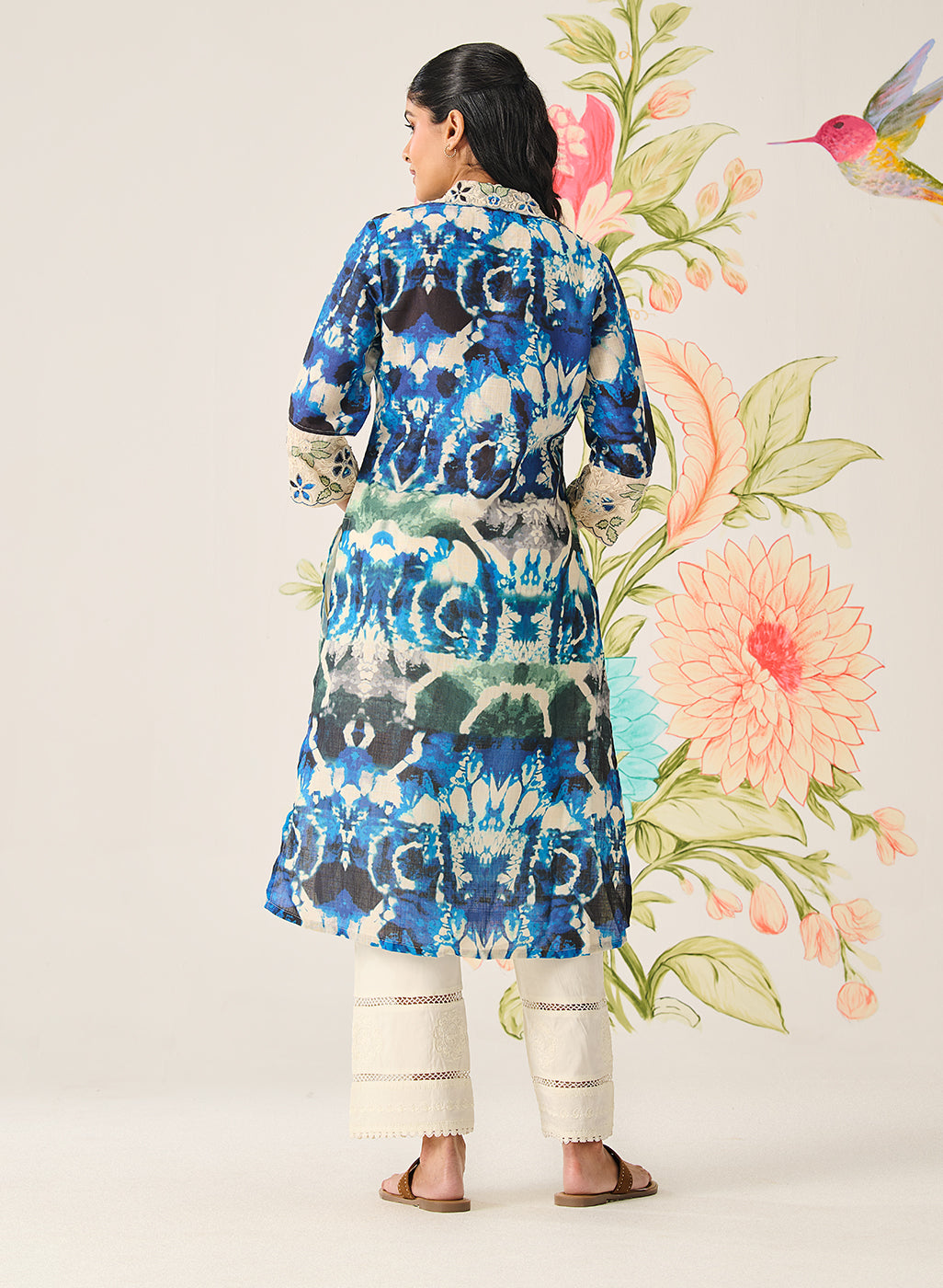 A beautiful play of colour and craftsmanship, this navy kurta stands out with its linen texture and intricate appliqué work enhanced with dori and resham detailing. The look feels refined yet relaxed—perfect for daytime festivities. Inspired by abstract print motifs, it carries an added layer of visual charm.