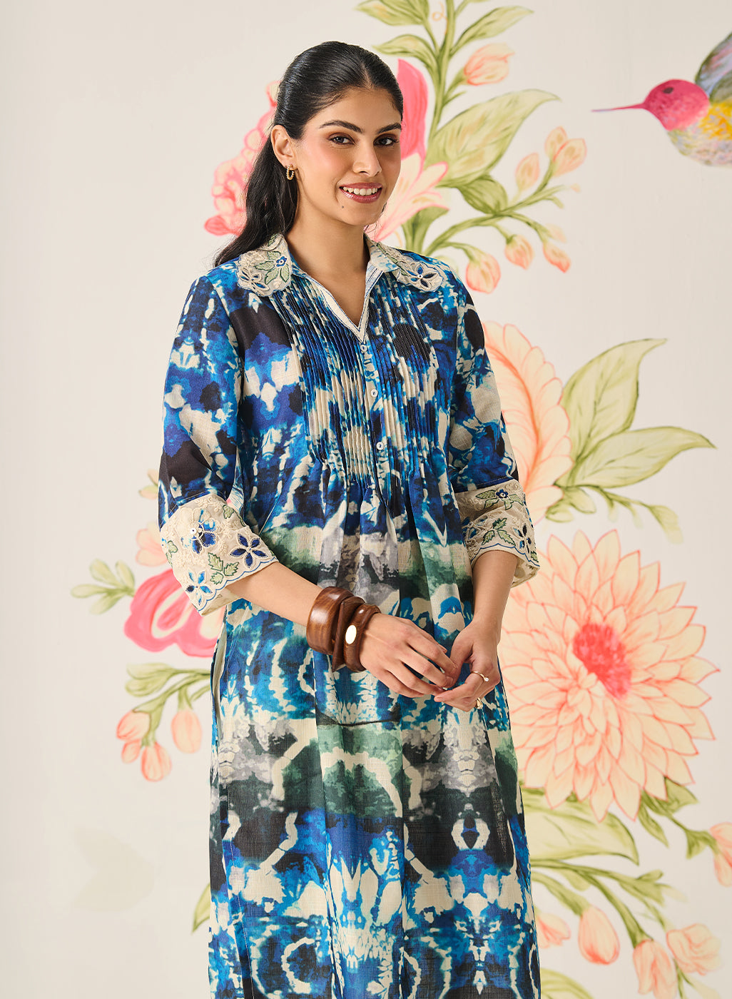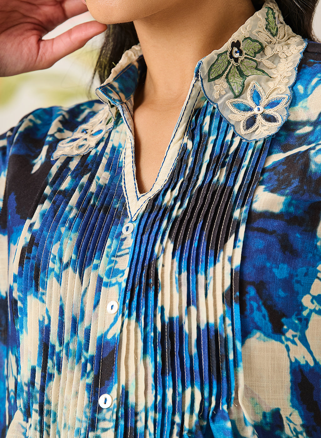 - Refined collar neckline with pin-tuck detailing on the front placket.
