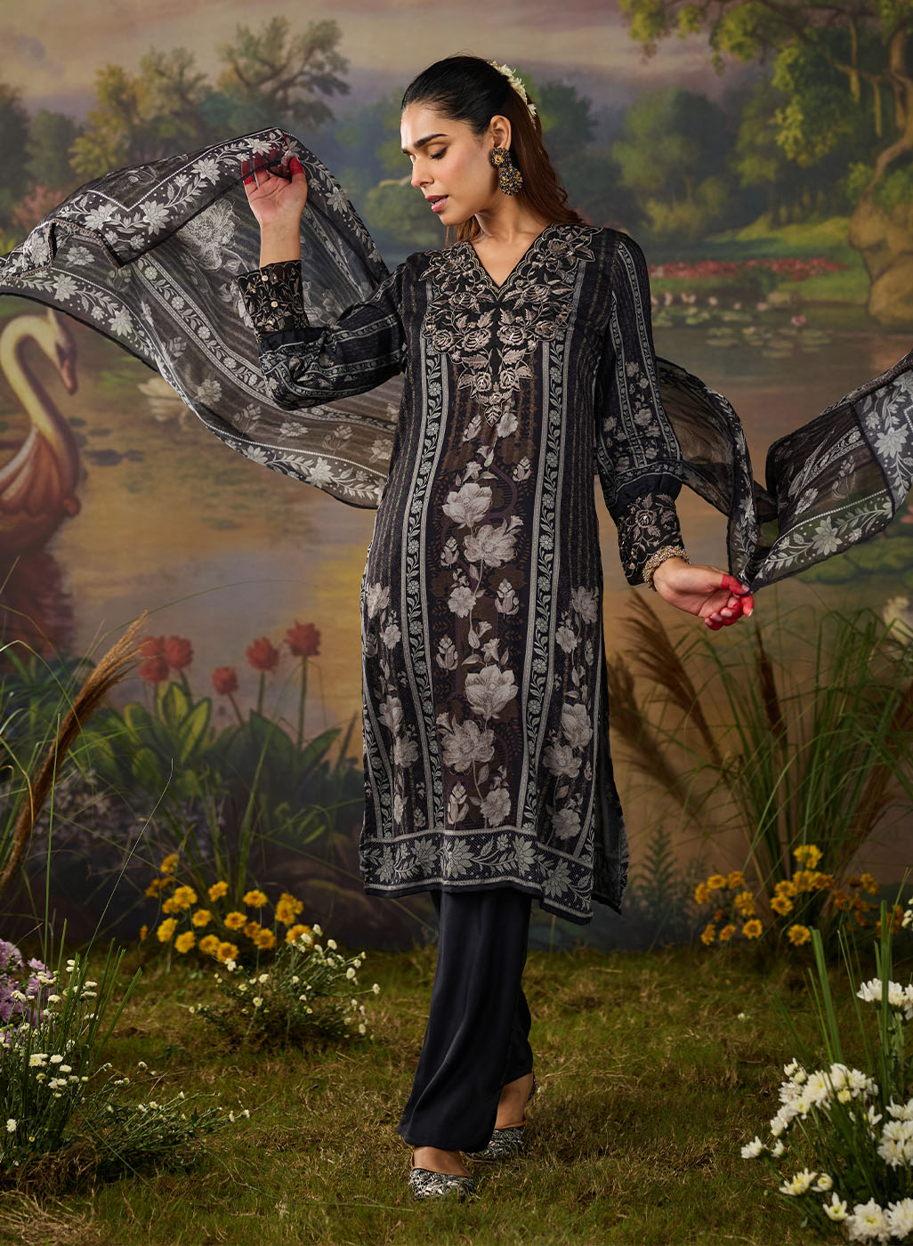 Nargis Black Floral Printed Viscose Straight Suit Set with Dupatta
