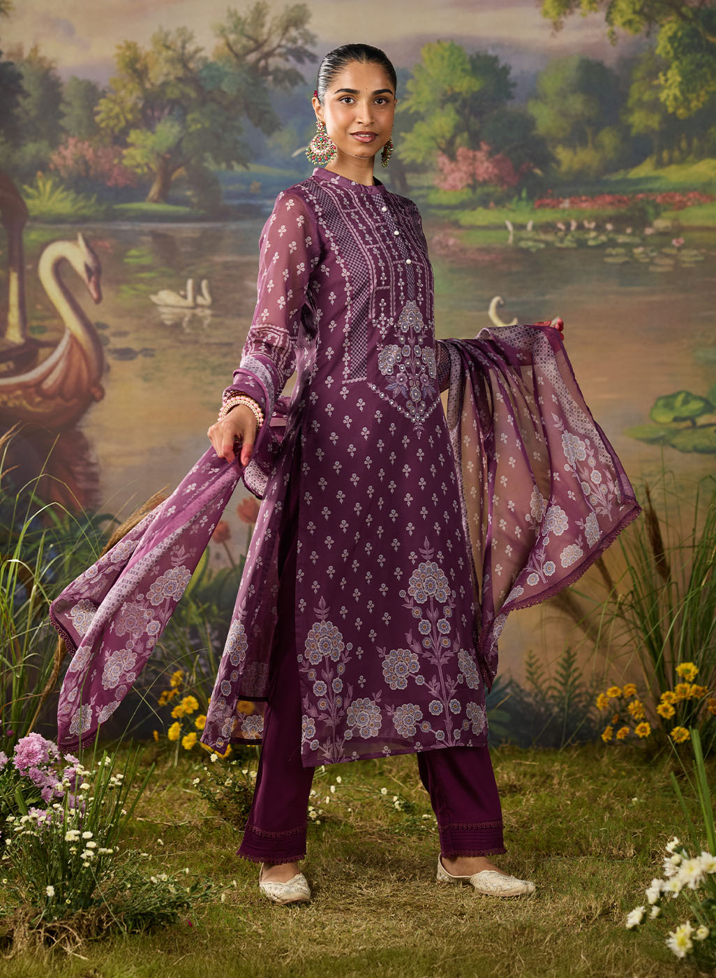 Smriti Purple Printed Organza Embellished Straight Suit Set with Dupatta